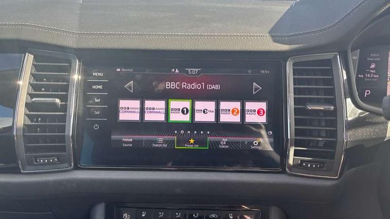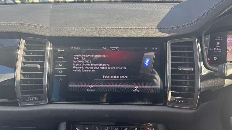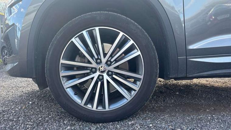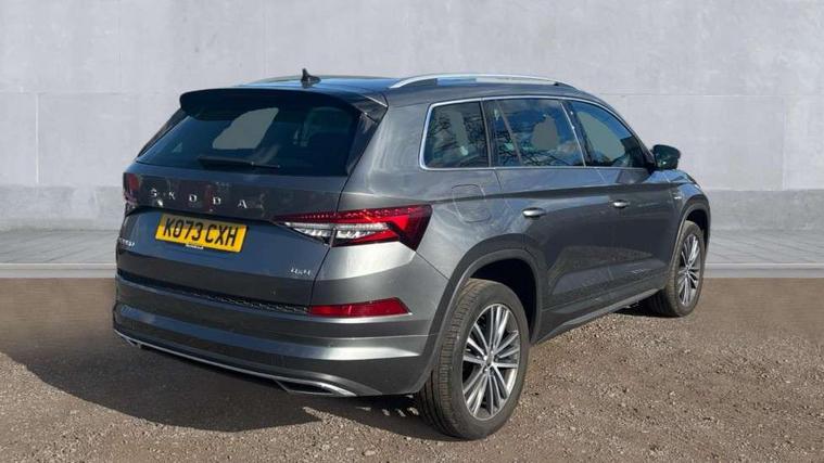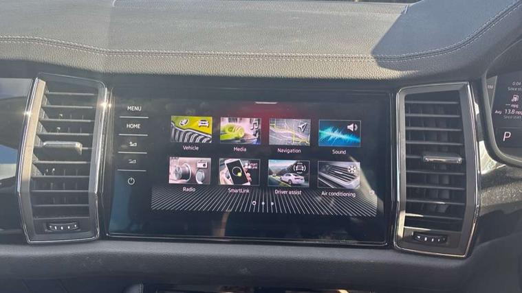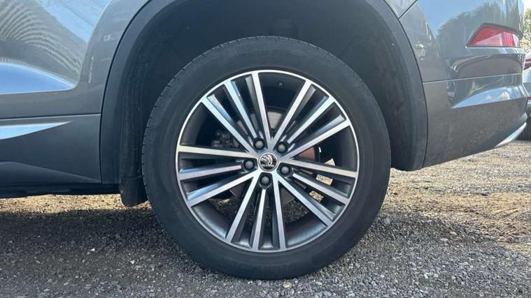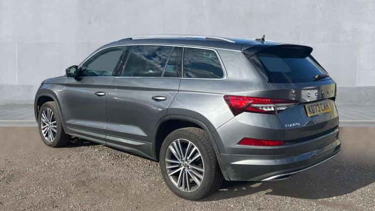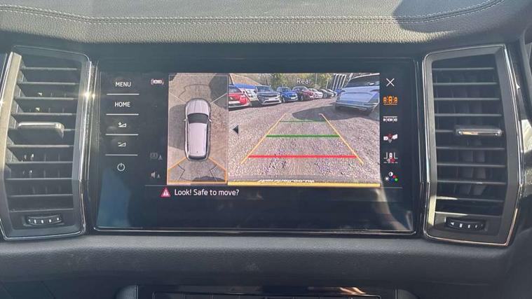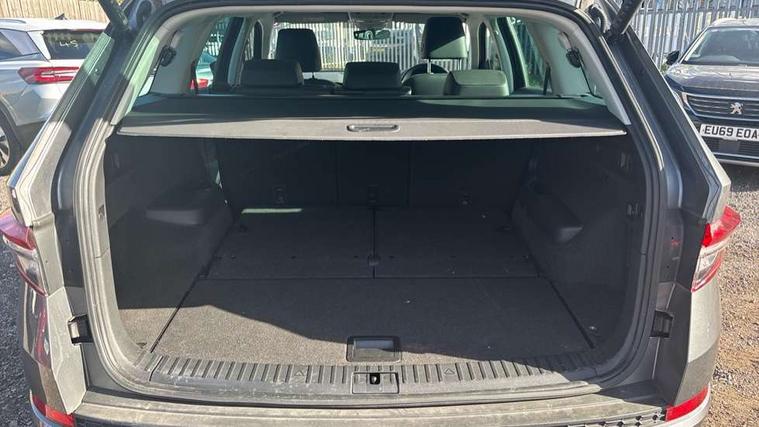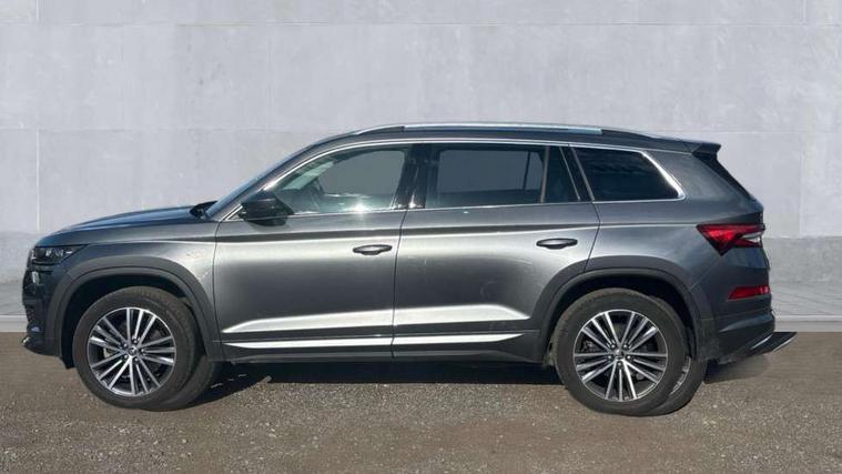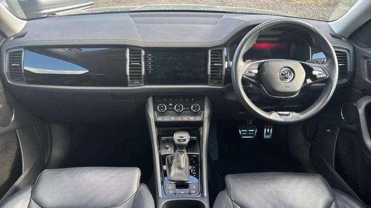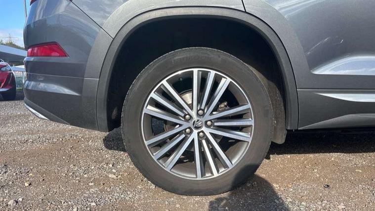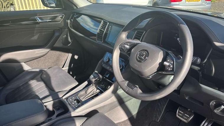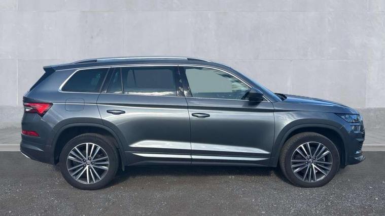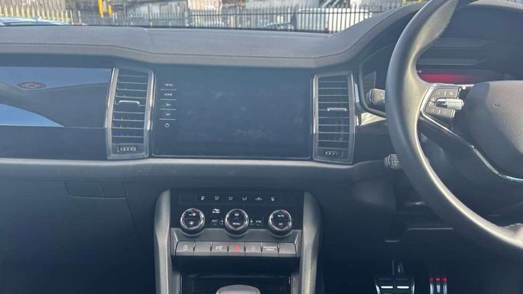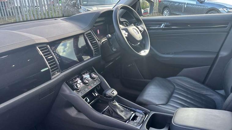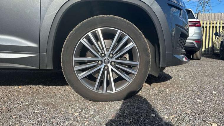 Area view, Blind spot detection system, Bluetooth system, Columbus satellite navigation with 9.2" touchscreen, integrated Wi-Fi, web radio, Digital voice enhancement, e call+, ECO Stop/start function, Exterior temperature indicator, Progressive steering, Smartlink wireless for apple carplay and wired for android auto, Speed limiter, Tailgate unlocking from outside, USB C Port x 2 in front centre console, Virtual Cockpit - 10.25" digital display, Wireless charging, Canton sound system, DAB Digital radio, Aero front windscreen wipers with intermittent function, Aero rear window wiper, Auto dimming rear view mirror, Black wheel arch surrounds, Body colour bumpers, Body colour door mirrors and handles, Body colour door panels, Chrome front grille, Chrome roof rails with chrome window surround, Electric adjustable/heated/folding door mirrors, driver side auto dimming with boarding sports and memory function, Electric front and rear windows, Extended rear spoiler with finlets in gloss black, Front fog lights, Full LED matrix headlights with AFS (adaptive front light system), cornering function and AWL (all weather lighting system), Headlight washers, Heated rear window, Invisible tailpipe, L&K front and rear bumpers including lower rear chrome strip, LED daytime running lights, LED rear fog light, LED third brake light in rear spoiler, Light assistant (coming/leaving home/tunnel light), Off-road style lower front bumper element, Panoramic sunroof, Privacy glass, Rain and light sensors, Rear LED lights (high functionality) with welcome effect and dynamic indicators, Rear side wing doors, Safety reflectors on front and rear doors, Window control switches with black trim, Without engine designation, 12V socket in boot, 2 rails with 2 hooks, 2 seat bench in 3rd row, 3 seat bench in 2nd row, 4 foldable roof handles with rear coat hooks, 60:40 foldable rear seat with sliding adjustment and backrest angle adjustment, Aluminium pedals, Bottle holders in door panel in the 1.5 litre front and 1 litre rear, Cargo storage compartments, Chrome headlight control button, Chrome interior door handles, Coat hooks on B pillar, Covered storage compartment on driver side, Decorative door sill covers, Front and rear door armrest with black adductor trim, Front centre armrest with storage compartment, cup holder and 12V socket, Front courtesy lights, Gear shift lever with chrome frame and black gloss insert, Grey stitching in front and rear armrests and door armrests + door inserts, Height adjustable front headrests, Illuminated and cooled glovebox, Illuminated luggage compartment, Isofix child seat fittings in outer rear seats with top tether, Manually adjustable steering column, Net programme in boot (1x horizontal Net, 2x vertical Nets), Overhead glasses storage compartment, Pollen filter, Rear centre armrest with cupholders, Single front passenger seat, Sliding trunk cover, Small Bags on the inner sides of the front backrests, Sunvisors with illuminated vanity mirrors, Three rear height adjustable headrests, Ticket holder on A Pillar, Umbrella in door panel, Variable boot floor, LED Interior light pack - Kodiaq, Auto door release and activation of warning lights, Child locks on rear doors, Driver and front passenger airbag with knee airbag and front passenger airbag deactivation, Electronic parking brake with hill start assist, Emergency rear braking signal, ESC (incl. ABS+MSR+ASR+EDS+HBA+DSR+RBS+MKB), Front assist with autonomous emergency braking, Front side airbags with curtain airbags, Fuel cut off safety device, Height adjustable front 3 point seatbelts + pretensioners, Hill hold control, Rear disc brakes, Safety vest holder in door, Seat belt reminder for all seats, Three point rear seat belts, Two tone horn, Tyre pressure monitor, Alarm with interior monitoring and tilt sensor with safe function, Anti-theft wheel bolts, Immobiliser, Keyless entry and start system (KESSY), Remote central locking with 2 keys, Grey stitching in dashboard, Piano black decorative inserts, Plaquette L&K front fenders, Temporary spare wheel (space saver),