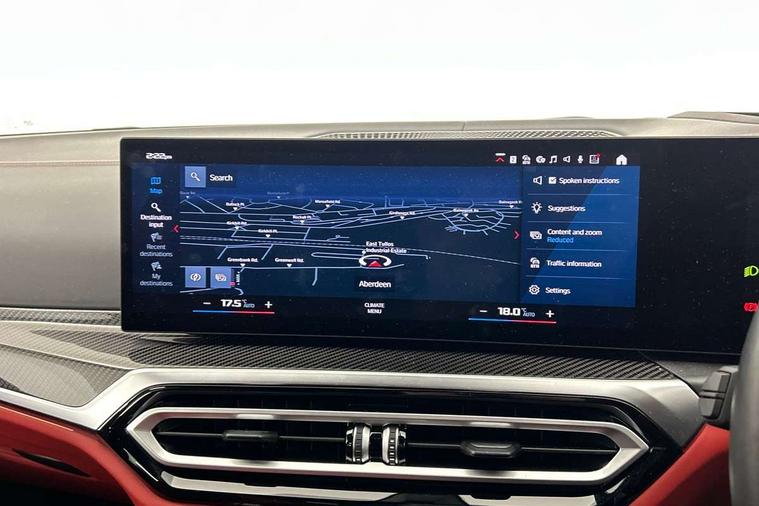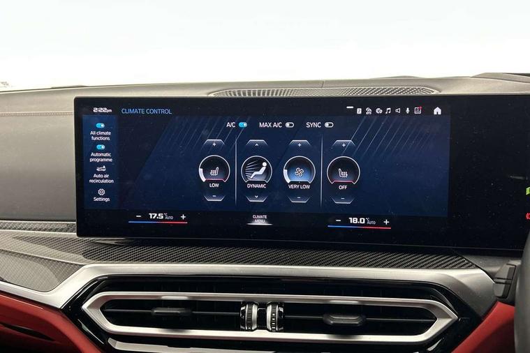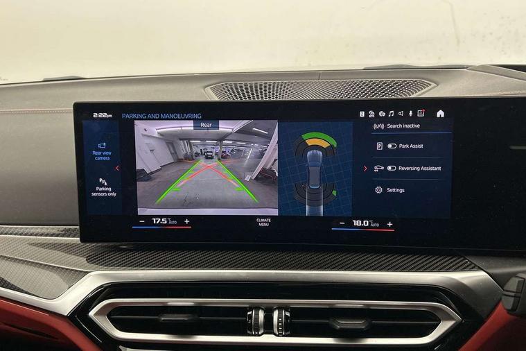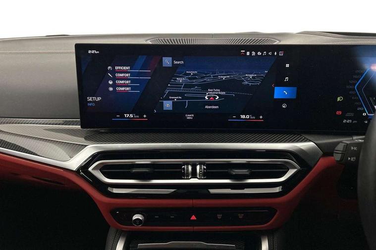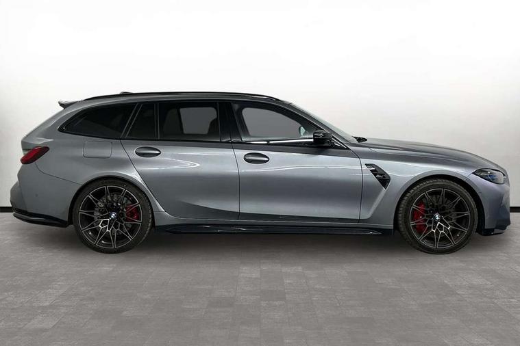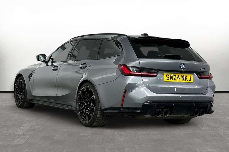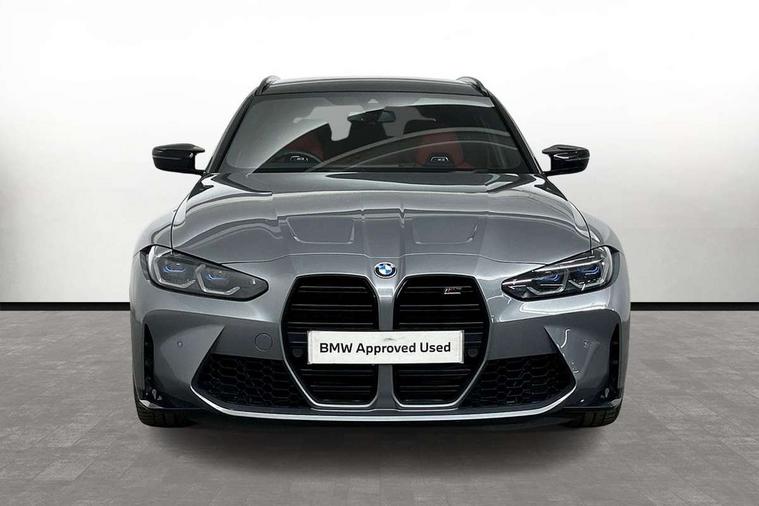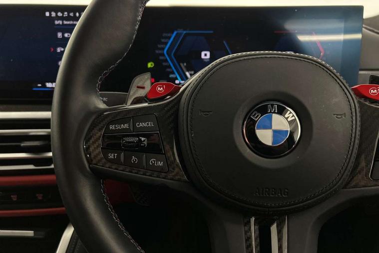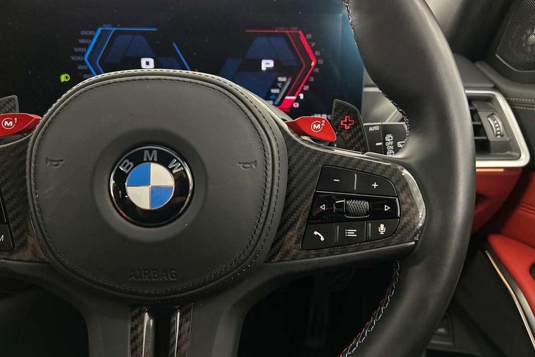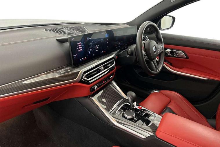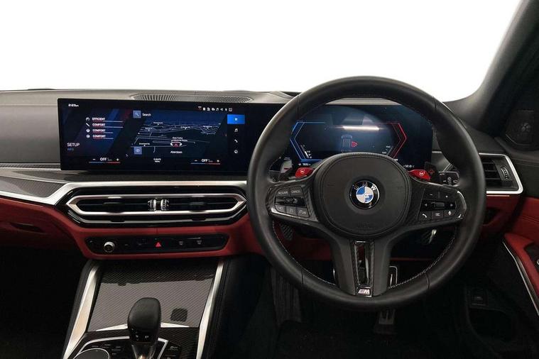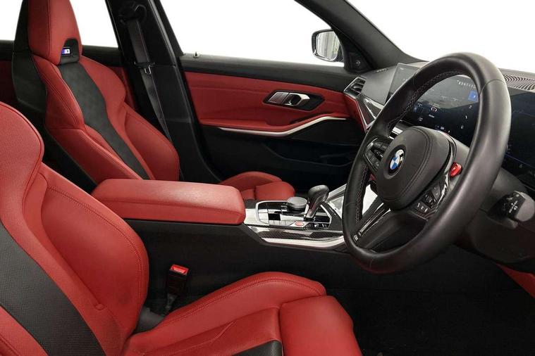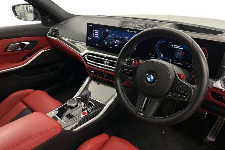 Active guard plus, Automatic start/stop system, Bluetooth functionality with Apple CarPlay/Android Auto, BMW ConnectedDrive online services, BMW legal emergency call, BMW Live Cockpit Professional sat nav system with 12.3" instrument display and high resolution control display, BMW Online services, BMW Teleservices, Brake pad wear indicator warning light, Condition based service, Door/boot open warning light, Driving experience switch, Electric boot lid, Head up Display, iDrive controller on centre console, Illuminated control elements, Instrument cluster with extended contents, Lights on warning, M drive buttons, Oil sensor for level and grade, warning by check control system, Oil temperature gauge, On board computer, On board diagnostics, Optimum shift indicator, Outside temperature display, Pull away assistant, Run flat indicator, Service interval indicator, Shifting point display, Speed limiter, Variable sport steering, Adaptive M Sport suspension, Double joint spring strut front axle, M Drive Professional including track mode, laptimer, traction control & Drift analyser, M Sport differential, M steptronic sport transmission with drivelogic, Safety battery terminal clamp, 8 programmable favourite buttons, Auxiliary point for auxiliary devices, DAB Digital radio, Harman/Kardon loudspeaker system, Personal eSim, 3rd brake light, Acoustic glazing, Auto dimming driver's door mirror, Auto dimming rear view mirror, Automatic headlights + automatic windscreen wipers, Automatic parking function on front passenger's exterior mirror, Black model designation badges, BMW emblem on engine compartment lid and tailgate, BMW high gloss shadow line with extended contents, BMW Individual shadowline lights, Body colour bumpers, Carbon fibre reinforced plastic (CFRP) roof with high gloss black roof aerial bulge and roof mouldings, Day time running light, Door mirror integrated indicators, Door sill finishers with aluminium inserts, Dynamic brake lights, Electric adjustable heated door mirrors, Electric folding door mirrors, Electric front and rear windows with one touch/convenient open/close function, Follow me home headlights, Front and rear apron plastic in body colour, Front and rear bumper system, Headlight beam throw control, Heat protection, sun protection glazing, Heated rear window with automatic switch off, Heated washer jets, High beam assistant, High gloss black frameless kidney grille with M badge, High gloss black lower bumper edges, side sills and diffuser edge binding, High gloss black M roof rails, Illuminated bow type door handles in body colour drivers side with door lock, LED number plate light, LED tail lights with 3D L-shaped LED light design, M designation, M Sport entry door sill strips, Mirror glass aspheric on driver's side, convex on passenger side, Rear fog lights, Rear reflectors, Rear right M3 competition inscription, Rear side wing doors, Rear wiper, Reversing light, Shark fin roof aerial, Strakes in front side panel, black matt/black high-gloss, with model badge, Visible VIN plate, Welcome lighting, 2 front cupholder in centre console with clamping elements and matt black inlay, 2 x 12 V Power sockets (luggage compartment and front centre console), 2 x USB Type C ports for charging and data transmission in front centre console, 3 folding rear headrests, 3 seat bench in 2nd row, Ambient door handle light, Ambient lighting for instrument panel, Ambient lighting for storage compartment, Ambient lighting front and rear, Ambient lighting in door panels, Anthracite headlining, Battery in luggage compartment, Carbon fibre centre console incl. cover for cupholders and storage compartment, Carbon fibre decorative steering wheel finishers, Carbon fibre shift paddles, Carbon fibre strip in instrument panel on front passenger side, Centre console armrest with storage compartment, Compartment in front of cupholder, Driver/passenger sunvisors with illuminated vanity mirrors + covers, Dynamic ambient interior lighting, Electric front seats + driver memory, English handbook, Floor mats in velour, Folding rear centre armrest with 2 cupholders, Front door storage bins with bottle holder, Front isofix attachment + airbag deactivation, Front seat backrest width adjustment, Front seats lumbar support, Front/rear door armrests, Gearshift lever with embossed M badge, Heated front seats, Height adjustable front headrests, Isofix on 2nd row outer seats, Lockable/illuminated glovebox, Luggage compartment lighting, Manual 40:20:40 split folding rear seat with two tilt positions for backrest, Multifunction steering wheel, Rake/reach adjustable steering wheel, Single front passenger seat, Storage compartment in rear doors, Three zone automatic air conditioning, Through loading system, Toolkit located in luggage compartment, Wireless charging tray, Additional storage compartment pack - M3, Connected package professional - M3, High gloss shadowline exterior trim pack - M3, 3 point seatbelts on all seats, Anti-lock braking system (ABS), Automatic Stability Control (ASC), Brake energy regeneration, Brake fade compensation, Compound structure brake discs, Cornering brake control (CBC), Crash sensor, Driver/Front Passenger airbags, Dry braking, Dynamic brake control, Dynamic stability control + (DSC+), Dynamic Traction Control - DTC, Electromechanical parking brake, Electronic differential lock control (EDLC), Front and rear head airbags, Front seat side impact airbags, Front seatbelt pretensioners + load limiters, Hill start assist, M Sport seat belts, Rear child proof door locks, Seat occupancy detection for driver and passenger side, Seatbelt warning, Side impact protection, Two tone horn, Tyre pressure sensor, Warning triangle and first aid kit, Centre lock switch, Closing system with central locking, Digital key, Electronic immobiliser, Thatcham cat 1 remote alarm, Vehicle Key with 4 buttons including the integrated key, Galvanic finish to control surrounds, High gloss black interior trim, Tyre repair 