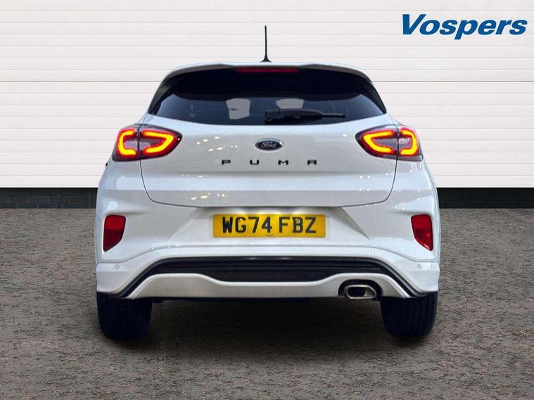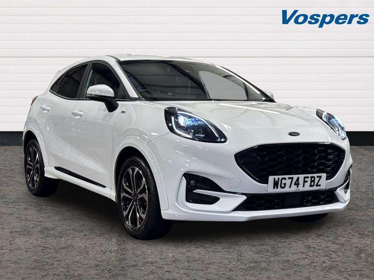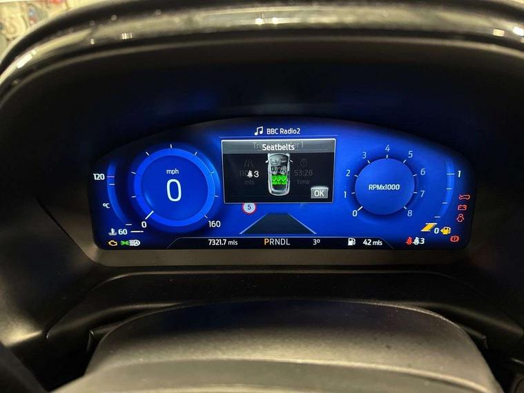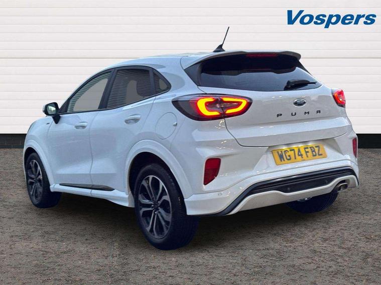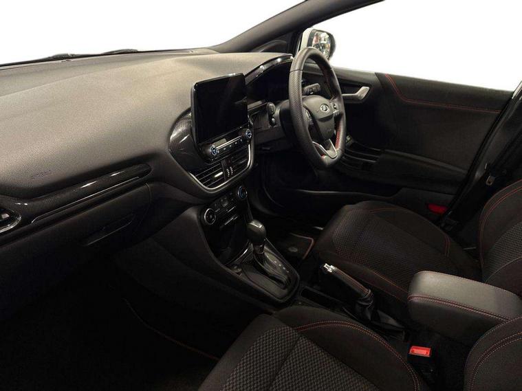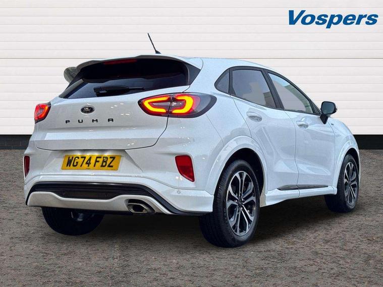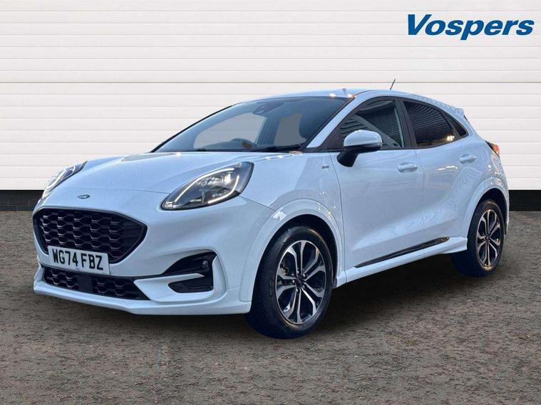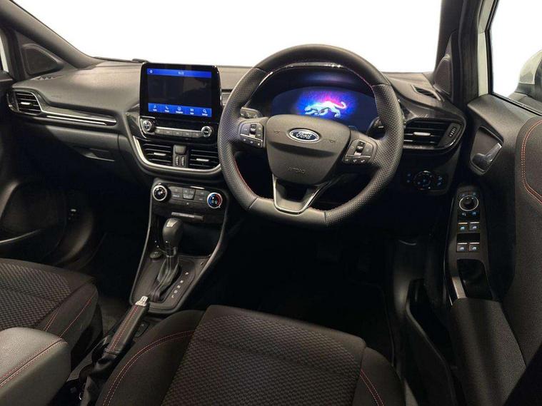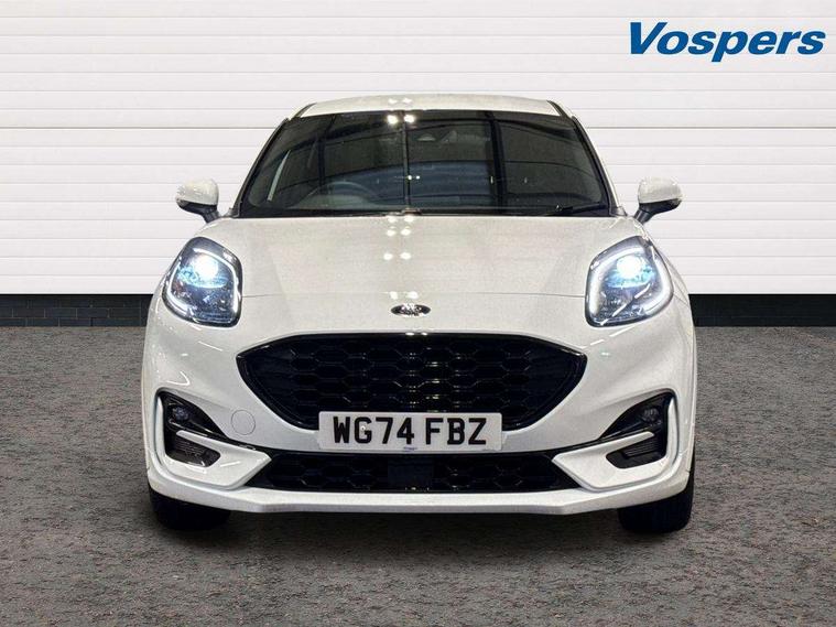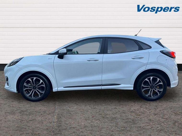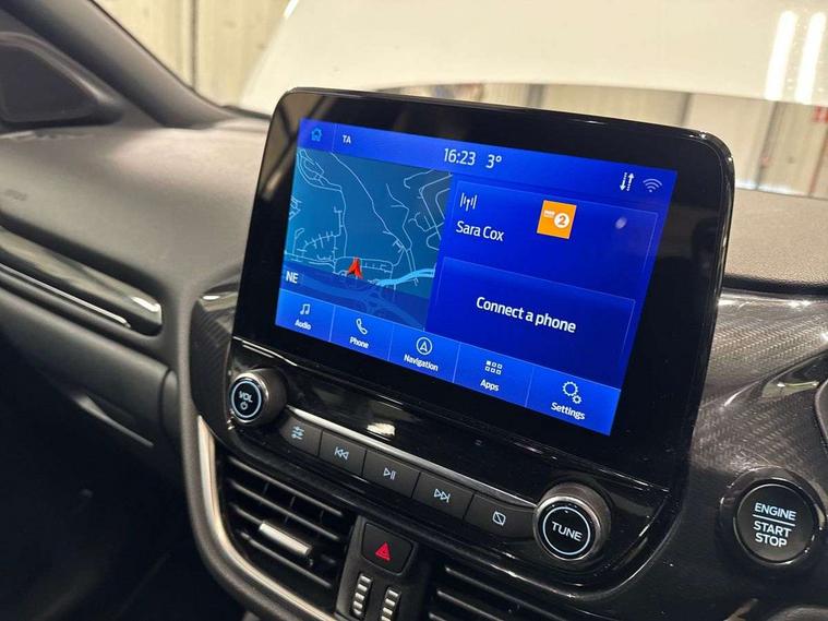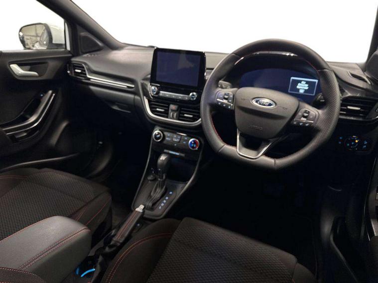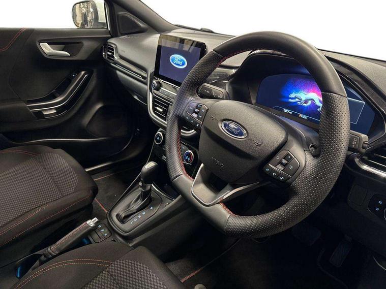 Driver impairment monitor, Emergency call service, Ford easy fuel, Full digital 12.3" instrument cluster, Lane keeping aid with lane departure warning, Power assist steering, Power start button, Rear parking sensor, Selectable drive modes(Normal, sport, Eco, trail, slippery), Speed sign recognition, Sport suspension, Automatic headlights with auto high beam, Automatic rain sensing wipers, LED rear lamps, Power foldable heated door mirrors with puddle lamps, Projector headlamps with LED day time running lights and front fog lamps, Quickclear heated windscreen, Rear side wing doors, Rear wiper, ST-Line body styling kit with unique grille, Third brake light, 3 seat bench in 2nd row, Centre console with armrest and stowage, Ford megabox extended bootspace, Front and rear head restraints, Front floor mats, Manual 2 way passenger seat adjustment, Manual 4 way driver seat adjust with lumbar adjustment, Single front passenger seat, ST- Line cloth trim with red stitching, ST-Line flat bottomed sensico leather steering wheel with leather handbrake and aluminium gear knob, Ford SYNC 3 navigation pack - Puma, 3 rear seatbelts, Child safety lock, Electronic stability control (ESC) and hill start assist, Pedestrian/cyclist detection & post-collision braking, Pre collision assist system, Tyre pressure monitoring system (TPMS), Thatcham alarm,