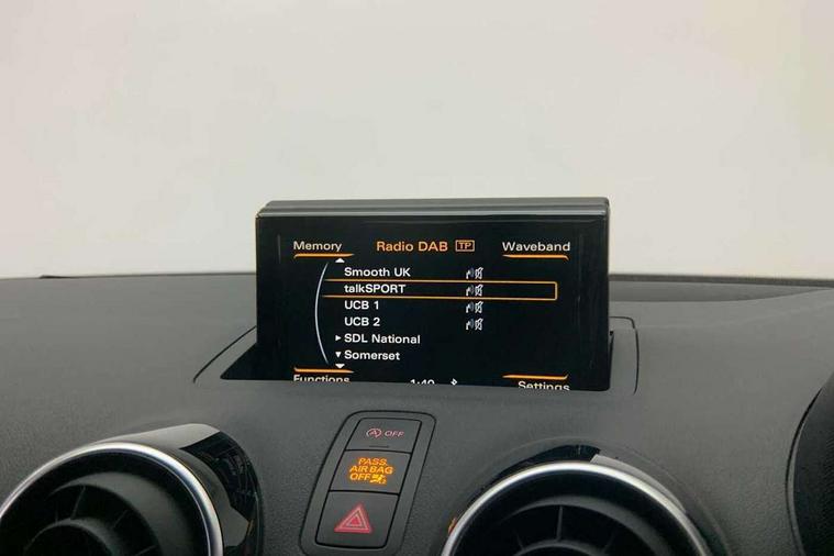 Audi drive select, Cruise control, Driver's information system, Electro-mechanical PAS, Low washer fluid indicator, Service interval indicator, Voice control system, Additional SD card reader, Audi music interface, Bluetooth audio streaming, DAB Digital radio, Adaptive brake lights, Body coloured bumpers, Body coloured door mirrors, Electric adjustable door mirrors, Electric front windows, Electric rear windows, Front fog lights, Heat insulating glass, Heated door mirrors, Heated rear windscreen, Polished stainless steel tailpipe, Rear wiper, 12V Accessory socket in centre console, 3 rear seats, 3 spoke leather multi-function sport steering wheel including paddle shift, Adjustable rear head restraints, Cupholders in centre console, Door sills trims with aluminium inlays, Front floor mats, Front head restraints, Front sports seats, Height adjustable front seats, Isofix attachments on rear seats, Jack and tool kit, Leather gear knob, Leather handbrake, Lumbar adjustment for front seats, Rake/reach adjustable steering wheel, Split folding rear seats, Titanium grey cloth headlining, 3x3 point rear seatbelts, ABS/EBD, Brake assist function, Driver and passenger side airbags, Driver/Front Passenger airbags, EDL, ESP with ASR, First aid kit, Front and rear seatbelt reminder, Front passenger airbag deactivation, Head airbags, Height adjustable front seatbelts, Tyre pressure monitor, Warning triangle, Locking wheel bolts, Remote central locking with 2 remote folding keys, Thatcham category 1 alarm + immobiliser, High gloss black air vent sleeves, Tyre repair kit,