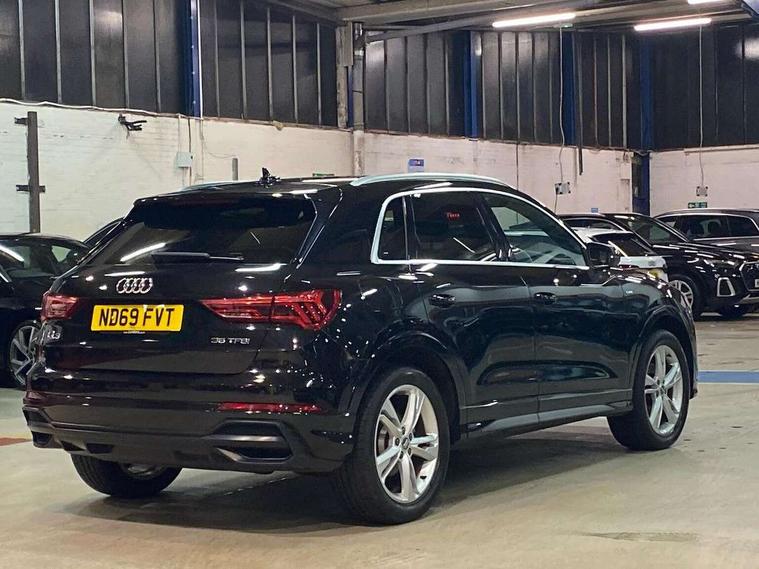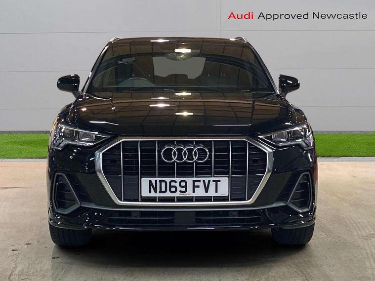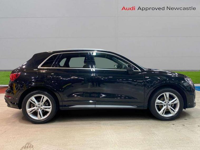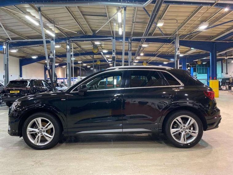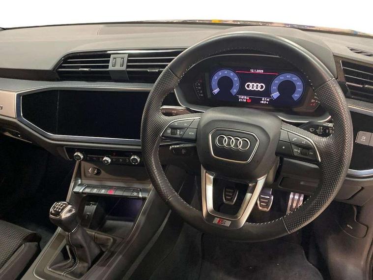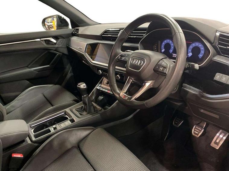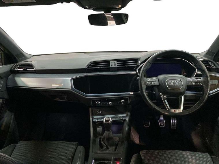 Audi connect safety and service (e-call), Audi drive select, Audi lane departure warning, Audi side assist, Audi smartphone interface, Audi Virtual Cockpit - 10.25" display, Bluetooth interface, Camera based traffic sign recognition, Cruise control + speed limiter, MMI navigation plus with MMI touch, Power opening/closing tailgate, Progressive steering, Rear parking sensors, Service interval indicator, Stop/start system, Voice control system, Sports suspension, 1 x USB type C and 1 USB type A charging points, 6 speakers, DAB digital radio module, Acoustic windscreen, Aluminium roof rails, Aluminium window trim, Auto dimming rear view mirror, Body coloured bumpers, Diffuser in matt Platinum grey, Electrically adjustable and heated door mirrors with integrated LED side indicators, Front and rear electric windows, Front fog lights, Front side air inlets in matt platinum grey, Front spoiler blade in matt platinum grey, Grille vertical bars in aluminium silver/Matt, High gloss black finish B and C pillars, LED headlights with LED daytime running lights and dynamic rear indicator, LED rear lights, Privacy glass, Rain and light sensors, Rear diffuser strip in matt titanium black, S Line badge on wings, S Line front and rear bumpers, Side skirt insert in matt Platinium grey, Titanium black radiator grille, 12V socket in rear centre console, 40:20:40 split folding rear bench seat, Adjustable rear seat bench/backrest with centre armrest and cupholder, Aluminium door sill trims, Black cloth headlining, Dual zone climate control, Front and rear black floor mats with contrast stitching in rock grey, Front and rear headrests, Front and rear roof module including reading lights, Front centre armrest with storage compartment and angle adjustment, Glove compartment lighting, Height and reach adjustable steering wheel, Illuminated door sill trims with S logo, ISOFIX child seat mounting and Top Tether with front passenger airbag deactivation, Luggage compartment light, Manual front seats with height adjustment, Perforated leather gearknob, Stainless steel luggage compartment sill finisher, Stainless steel pedals, Non smoking pack - Q3, 3x3 point rear seatbelts, 6 airbags - Driver, front passenger, curtain and side windows, Audi pre-sense front with pedestrain and cyclist recognition, Electrically operated child locks on rear doors, Electromechanical parking brake, Electronic stabilisation control including ABS, ASR and EDL, Hill descent control, Hill hold assist, Pre sense basic, Seatbelt monitoring, Tyre pressure warning, Warning triangle and first aid kit, Anti theft alarm, Anti theft wheel bolts, Remote central locking, Dark matt brushed aluminium inlay, MMI touch colour display in gloss black with aluminium surround,