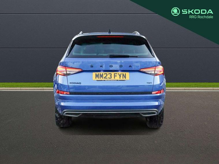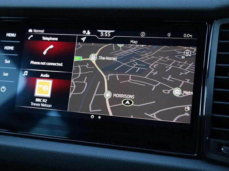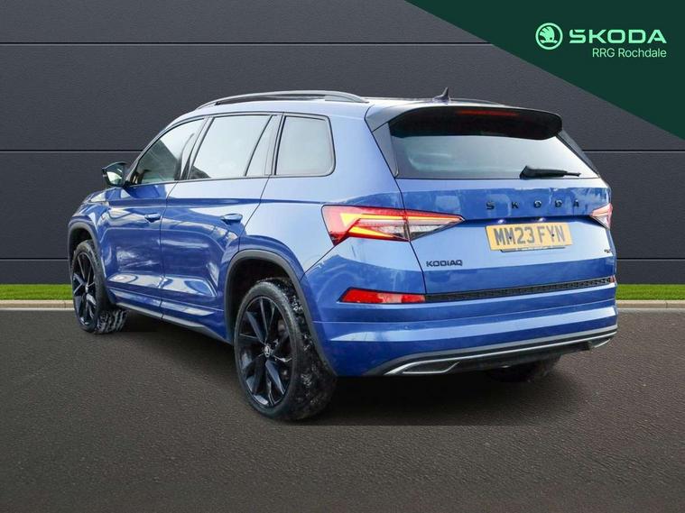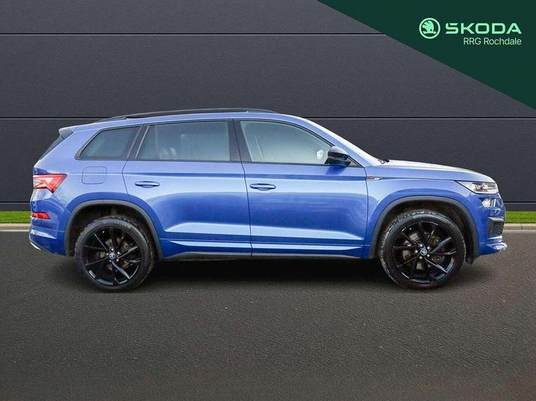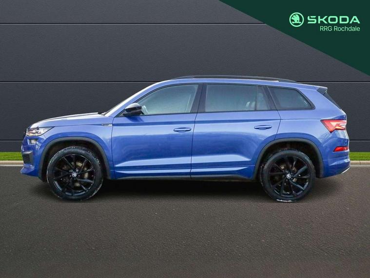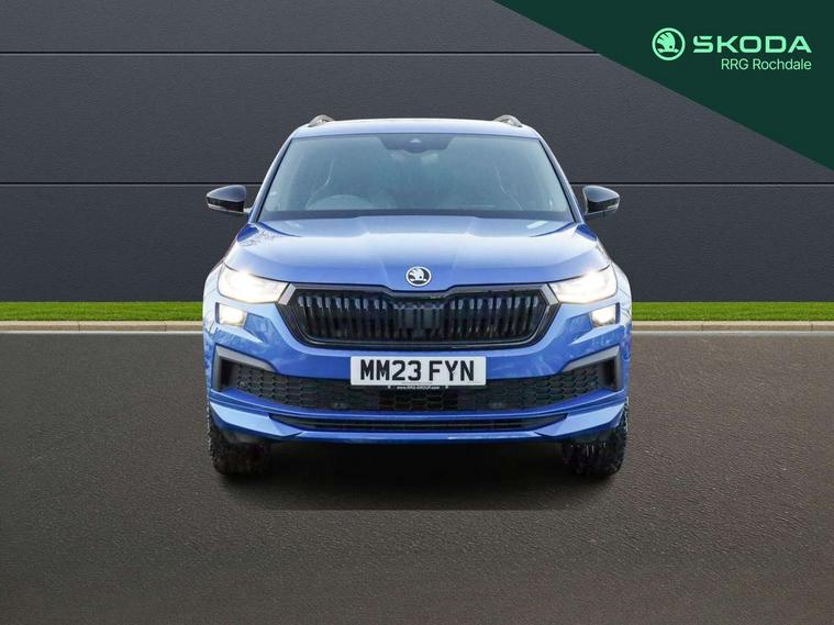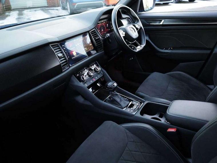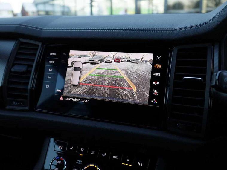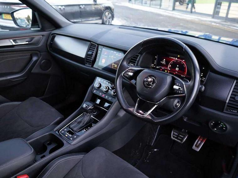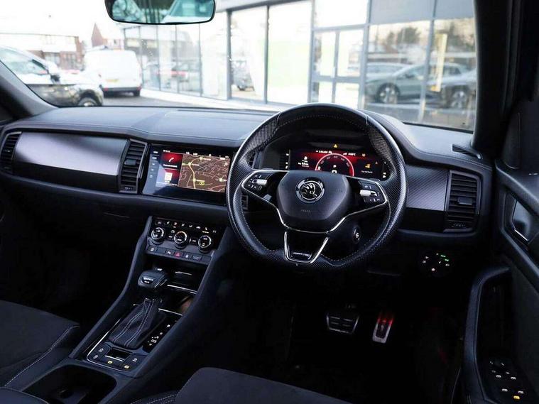 Bluetooth system, Columbus satellite navigation with 9.2" touchscreen, integrated Wi-Fi, web radio, Digital voice enhancement, e call+, ECO Stop/start function, Exterior temperature indicator, Progressive steering, Rear view camera, Smartlink wireless for apple carplay and wired for android auto, Speed limiter, Tailgate unlocking from outside, USB C Port x 2 in front centre console, Virtual Cockpit - 10.25" digital display with additional sports design, Wireless charging, 8 speakers, DAB Digital radio, Aero front windscreen wipers with intermittent function, Aero rear window wiper, Auto dimming rear view mirror, Black roof rails, Black sports styling including front grille and window surrounds, Black wheel arch surrounds, Body colour bumpers, Body colour door handles, Electric adjustable/heated/folding door mirrors, driver side auto dimming with boarding sports and memory function, Electric front and rear windows, Extended rear spoiler with finlets in gloss black, Front fog lights, Full LED matrix headlights with AFS (adaptive front light system), cornering function and AWL (all weather lighting system), Gloss black door mirrors, Headlight washers, Heated rear window, Invisible tailpipe, LED daytime running lights, LED rear fog light, LED third brake light in rear spoiler, Light assistant (coming/leaving home/tunnel light), Off-road style lower front bumper element, Privacy glass, Rain and light sensors, Rear diffuser, Rear LED lights (high functionality) with welcome effect and dynamic indicators, Rear side wing doors, Safety reflectors on front and rear doors, Sportline badge on front fender, Sports front and rear bumpers including lower rear chrome strip, Tailgate lettering in Black, Window control switches with black trim, Without engine designation, 12V socket in boot, 2 rails with 2 hooks, 2 seat bench in 3rd row, 3 seat bench in 2nd row, 3 spoke leather multifunction sports steering wheel with DSG paddles, 4 foldable roof handles with rear coat hooks, 60:40 foldable rear seat with sliding adjustment and backrest angle adjustment, Aluminium pedals, Black roof headlining, Bottle holders in door panel in the 1.5 litre front and 1 litre rear, Cargo storage compartments, Chrome headlight control button, Chrome interior door handles, Coat hooks on B pillar, Covered storage compartment on driver side, Decorative door sill covers, Front and rear door armrest with black adductor trim, Front centre armrest with storage compartment, cup holder and 12V socket, Front courtesy lights, Gear shift lever with chrome frame and black gloss insert, Grey stitching in front and rear armrests and door armrests + door inserts, Height adjustable front headrests, Illuminated glovebox, Illuminated luggage compartment, Isofix child seat fittings in outer rear seats with top tether, Manually adjustable steering column, Microsuede door panels, Net programme in boot (1x horizontal Net, 2x vertical Nets), Overhead glasses storage compartment, Pollen filter, Rear centre armrest with cupholders, Single front passenger seat, Sliding trunk cover, Small Bags on the inner sides of the front backrests, Sports seats, Sunvisors with illuminated vanity mirrors, Three rear height adjustable headrests, Ticket holder on A Pillar, Umbrella in door panel, Variable boot floor, LED Interior light pack - Kodiaq, Auto door release and activation of warning lights in the event of an accident, Driver and front passenger airbag with knee airbag and front passenger airbag deactivation, Electronic parking brake with hill start assist, Emergency rear braking signal, ESC (incl. ABS+MSR+ASR+EDS+HBA+DSR+RBS+MKB), Front assist with autonomous emergency braking, Front side airbags with curtain airbags, Fuel cut off safety device, Height adjustable front 3 point seatbelts + pretensioners, Hill hold control, Rear disc brakes, Safety vest holder in door, Seat belt reminder for all seats, Three point rear seat belts, Two tone horn, Tyre pressure monitor, Alarm with interior monitoring and tilt sensor with safe function, Anti-theft wheel bolts, Immobiliser, Keyless entry and start system (KESSY), Remote central locking with 2 keys, Black air vent surround, Carbon finish dashboard and door inserts, Grey stitching in dashboard, 20" Vega Anthracite alloy wheels, Temporary spare wheel (space saver),