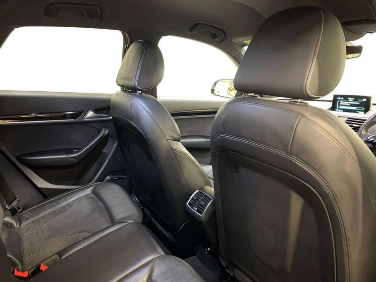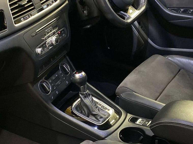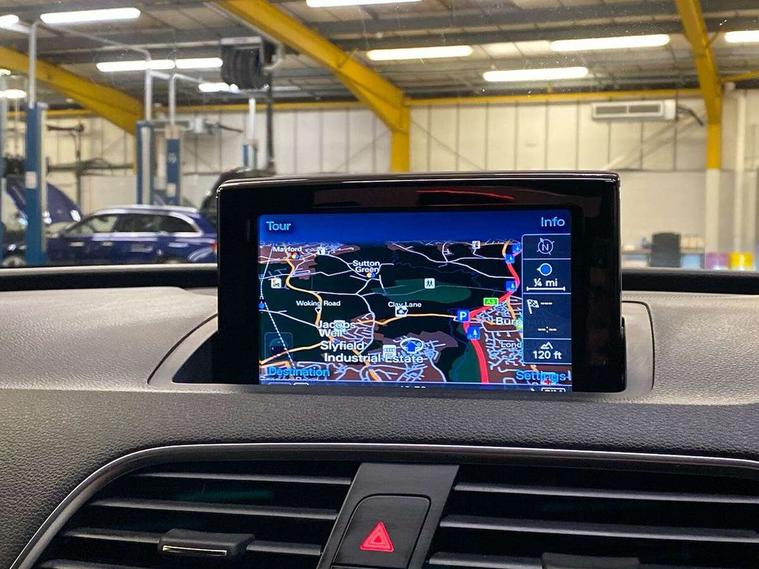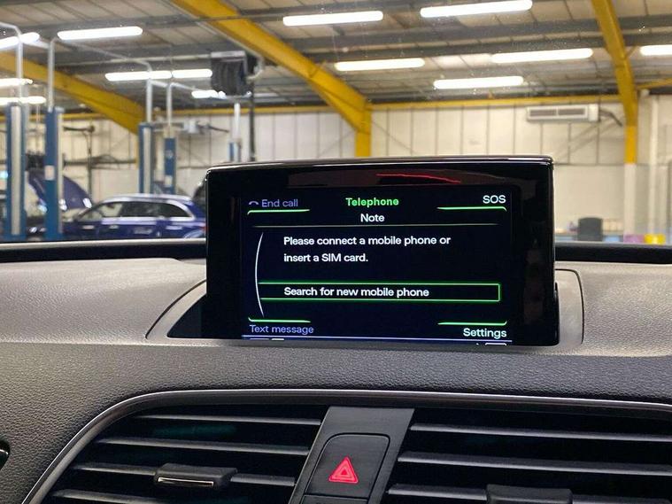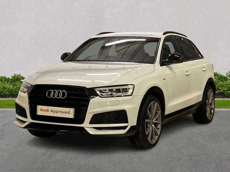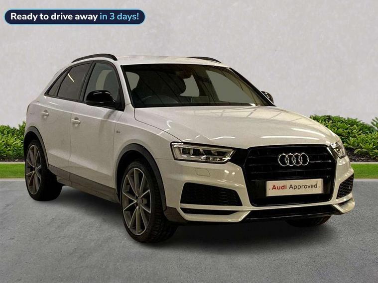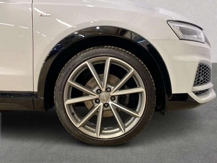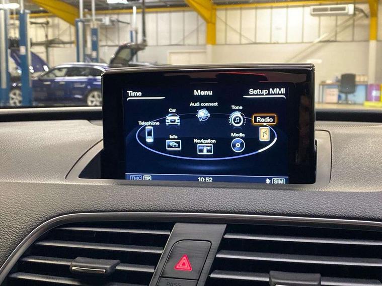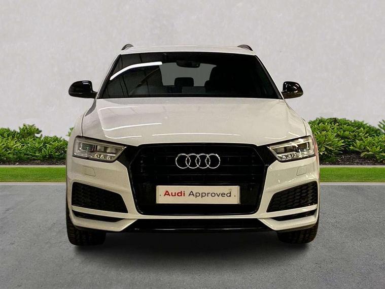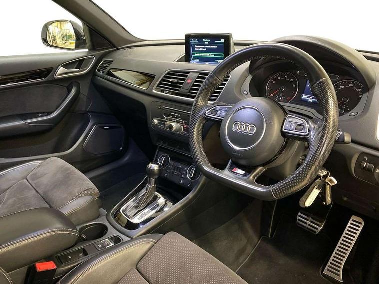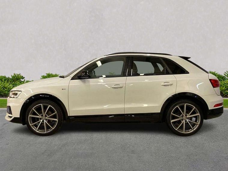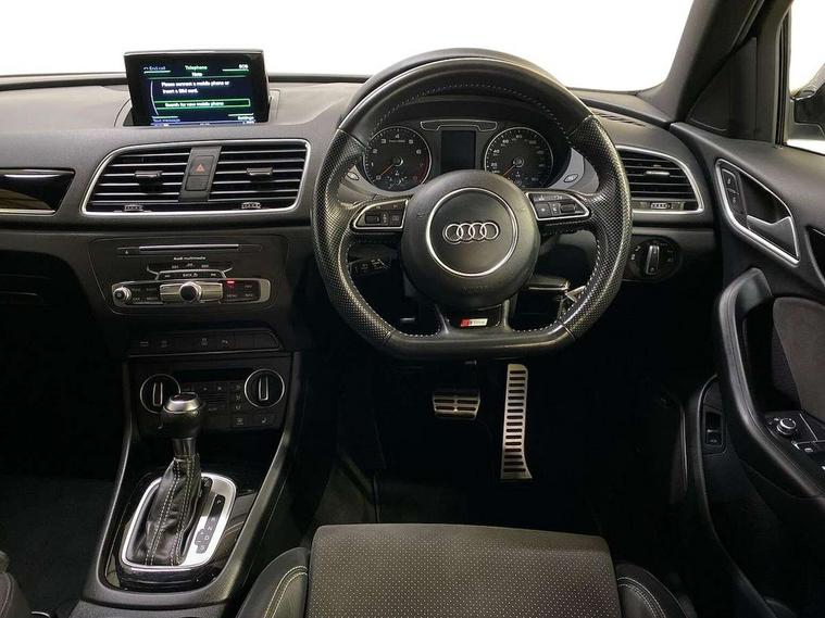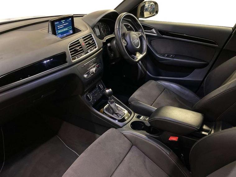 6.5" colour display screen, Audi drive select, Cruise control, Electro-mechanical PAS, Low washer fluid indicator, MMI - Multi Media Interface control system, On board computer, Remote electric boot opening/closing, Service interval indicator, Voice control system, Sports suspension, Audi music interface, BOSE sound system, DAB digital radio module, Acoustic windscreen, Aluminium window surround, Auto dimming rear view mirror, Black exhaust tailpipes, Black high gloss door mirrors, Black roof rails, Coming home function, Door mirror integrated indicators, Front and rear electric windows, Front fog lights, Front lip spoiler, Heated windscreen washer jets, High Gloss Black Contrast Bumpers, High Gloss Black rear spoiler, LED daytime running lights, LED headlights with headlight washers, LED rear lights, Light and rain sensor for auto activation of lights and windscreen wipers, Loading sill protector in stainless steel, Privacy glass, Rear diffuser with platinum insert, Rear wiper, S Line body styling, Sunband for windscreen, 12V socket in rear centre console, 3 spoke flat bottom multi-function perforated leather steering wheel with contrast stitching and aluminium gearshift paddles, Aluminium door sill trims, Aluminium gear knob, Black cloth headlining, Door sill trim strips, Dual zone climate control, Electric front lumbar adjustment, Front and rear headrests, Front and rear velour floor mats, Front centre armrest with storage compartment and angle adjustment, Front sports seats, Height/reach adjust steering wheel, ISOFIX on front passenger and rear outer seats, Jack and tool kit, Retractable luggage cover, Reversible boot floor, Split fold rear seat, Stainless steel pedals, Storage compartment and 12V socket, Under floor storage in luggage area, Audi Exclusive black styling pack - Q3, LED interior light pack - Q3, 3x3 point rear seatbelts, ABS+Electronic Brake force Distribution, Curtain airbags, Driver and passenger airbags, Driver and passenger side airbags, EDL + ASR, Electrically operated child locks on rear doors, Electromechanical parking brake, ESP, First aid kit, Front passenger airbag deactivation, Head airbags, Seatbelt warning light, Tyre pressure monitoring system, Warning triangle, Locking wheel bolts, Remote central locking, Thatcham category 1 alarm + immobiliser, Piano black finish inlay,