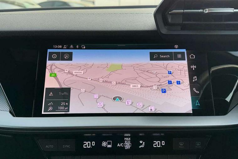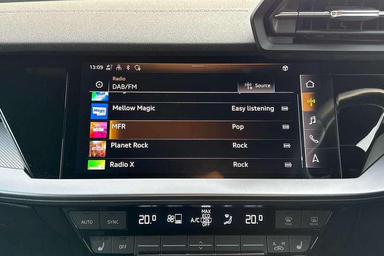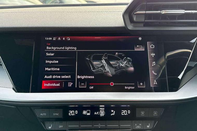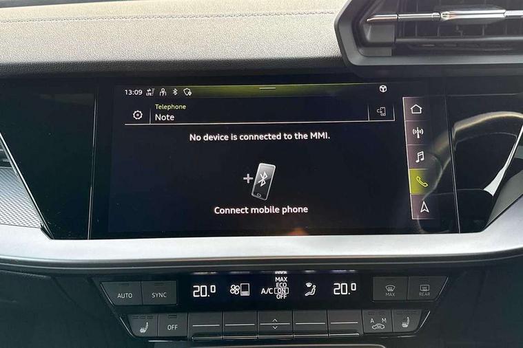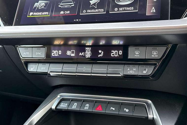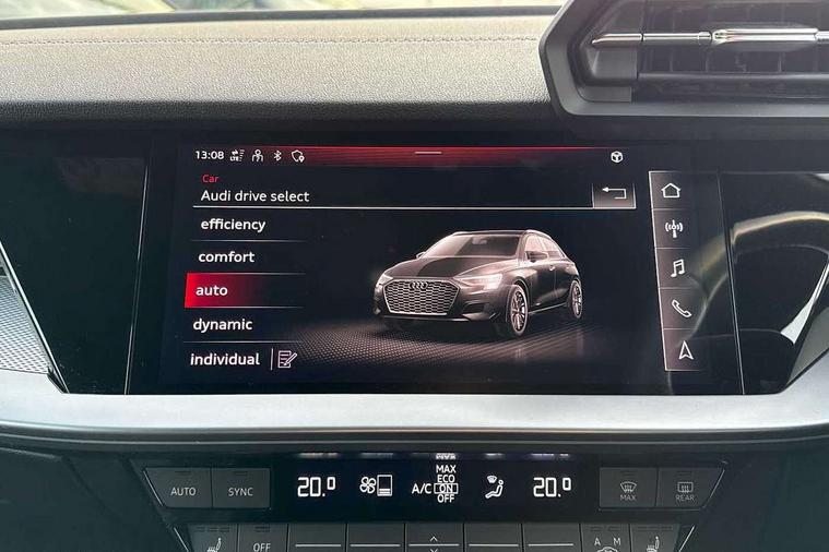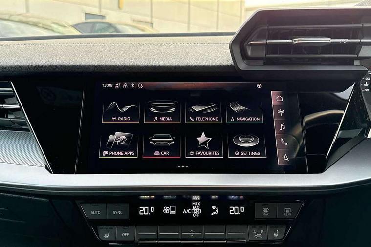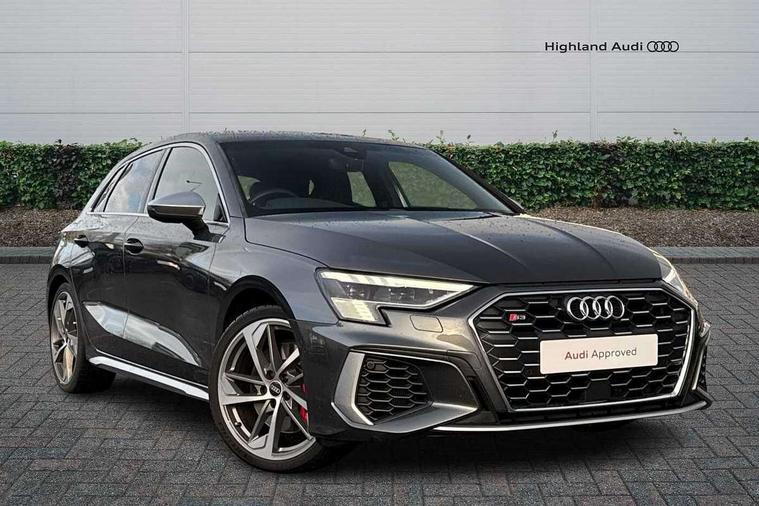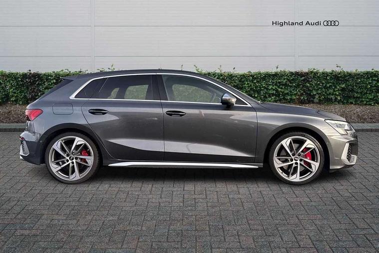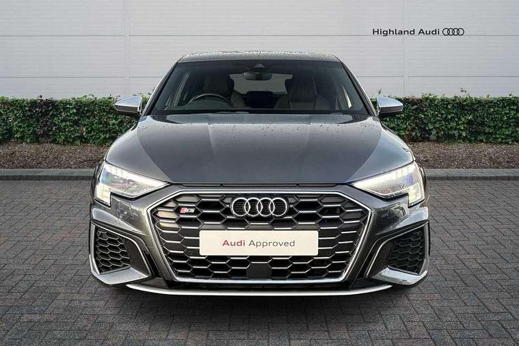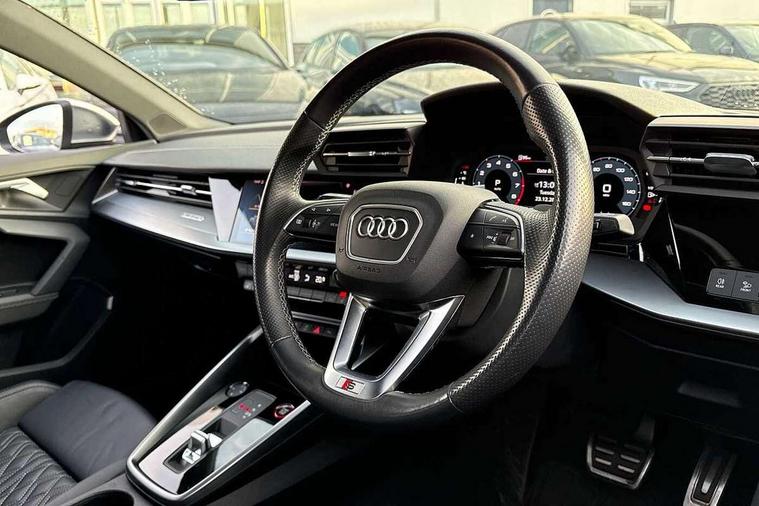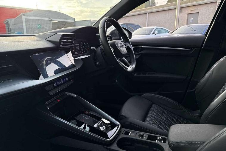 Audi connect emergency call and service, Audi drive select (Auto, Comfort, Dynamic, Efficiency and Individual), Audi smartphone interface, Audi Virtual Cockpit - 10.25" digital and colour instrument cluster, Automatic start/stop system with recuperation, Bluetooth interface, Collision avoidance assistant, Lane departure warning system, MMI Navigation Plus with high resolution 10.1" colour touch screen display, Progressive steering, Service indicator, Trip computer, Voice control system with natural language interaction, Quattro permanent all wheel drive, S sports suspension, 2xUSB-C connection with data and charging functions, 6 passive loudspeakers, DAB Digital radio, Acoustic glass windscreen, Aluminium window trim, Audi Beam uses LEDs to project the Audi S3 logo, Auto dimming frameless rear view mirror, Dual branch oval twin tailpipes in chrome plated finish, Exterior mirror with aluminium look housing, Front electric windows, Illuminated aluminium inserts front door sills with S logo, LED daytime running lights, Light and rain sensors, Privacy glass - dark tinted rear window, rear door and side windows, Rear electric windows, Rear side air outlets in grained matt black, Rear wiper, 12V socket and storage compartment in front centre console, 3 spoke flat bottomed multifunction plus sports contour leather wrapped steering wheel with shift paddles, 40/20/40 split folding rear seat bench with cupholder, Black cloth headlining, Dual zone electronic climate control, Front and rear centre armrest in leather, Front and rear headrests, Front/rear floor mats, Heated front seats, Height and reach adjustable steering wheel, Interior lighting - glove compartment light and right hand side, Luggage compartment floor covering, Seat side bolsters, Stainless steel pedals and front footrest, Aluminium interior elements pack - A3 Sportback, Design body styling - A3 Sportback, Storage pack - A3 Sportback, 3x3 point rear seat belts, Driver and front passenger airbag with passenger airbag deactivation, Electronic Stabilisation Control (ESC) including ABS, ASR and EDL, First aid kit with warning triangle and 2 safety vests, Front side airbags with head airbags and interaction airbag, Hill hold assist, Pre-sense front with pedestrian and cyclist detection, Seatbelt monitoring, Tyre pressure loss indicator, Anti theft alarm, Anti-theft wheel bolts, Electronically operated child lock, Immobiliser, Remote control central locking, Accent surfaces in the dashboard and centre console in platinum grey silk effect paint finish, Dark spectrum aluminium inlays,