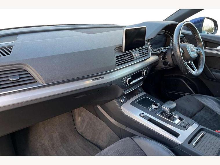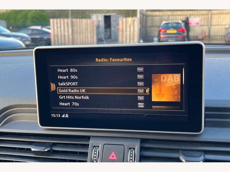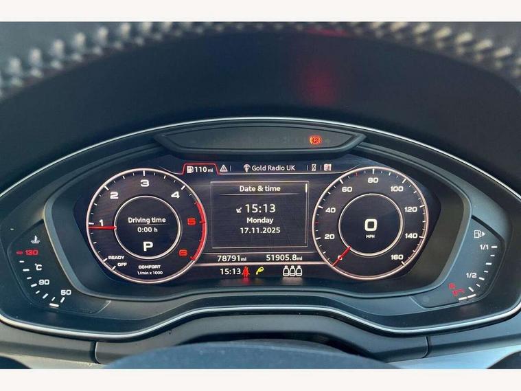 Audi connect, Audi drive select, Audi smartphone interface, Driver information centre with colour display in instrument panel, Electric power steering, Power tailgate, Remote electric boot opening/closing, SD card based MMI navigation, Service interval indicator, Voice control system, Diesel particulate filter, 2 USB ports, Audi sound system, Auxiliary input socket, CD player, DAB Digital radio, MMI radio plus with 7" colour MMI screen and MMI controller, Acoustic windscreen, Aluminium roof rails, Aluminium sill plates, Auto dimming rear view mirror, Black high gloss front air inlet in matt aluminium effect, Body colour bumpers, Body colour door mirrors, Body colour rear diffuser insert, Chrome exhaust tailpipe, Electric headlight adjustment, Electrically adjustable and heated door mirrors, Front and rear electric windows, Front fog lights, Headlight range control, Headlight washers, Honeycomb side air inlet in titan black, Light and rain sensor for auto activation of lights and windscreen wipers, Loading sill protector in stainless steel, Privacy glass with front acoustic glazing, Rear diffuser strip in matt aluminium silver, Rear spoiler, Rear wiper, S Line side skirts, Selenite silver underbody guard, Twilight grey matt radiator grille with matt aluminium horizontal chrome struts, 3 rear headrests, 3 zone climate control, 4 way electric lumbar support for driver and front passenger, 40:20:40 split folding rear seat, Black cloth headlining, Front centre armrest with 12v socket, Front sports seats, Front/rear floor mats, Height adjustable driver's seat, Height adjustable front head restraints, Illuminated door sills, Isofix front passenger and rear seat preparation, Jack and tool kit, Load compartment cover, Luggage compartment carpet, Matt selenite silver door inserts, Perforated leather gearknob, Reach + rake adjustable steering column, Removable luggage compartment floor, Removable net partition, Roller blind loadspace cover, Stainless steel pedals, Sunvisors with vanity mirrors, Non Smokers pack, 3 point seatbelts on all seats, ABS, Curtain airbags, Driver and passenger airbags, Driver and passenger side airbags, Electromechanical parking brake, ESC with ASR, ESP, First aid kit, Front passenger airbag deactivation, Hill descent control, Seat belt force limiter, Seatbelt warning lamp, Traction control, Tyre pressure monitor, Warning triangle, Keyless Go access/ignition system, Locking wheel bolts, Remote central locking, Thatcham category 1 alarm + immobiliser, Contrast stitching,