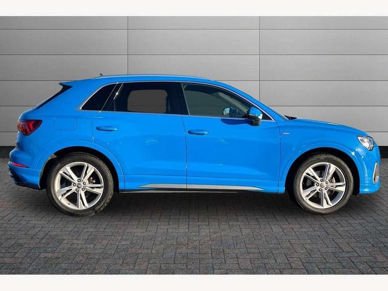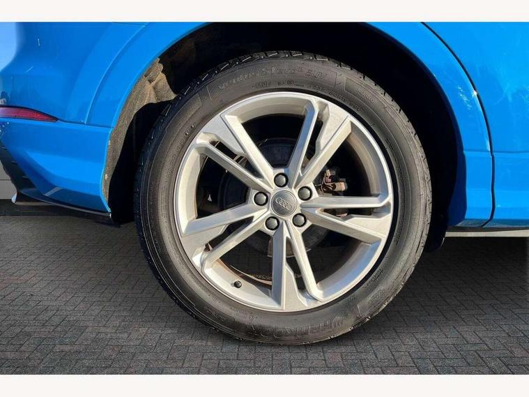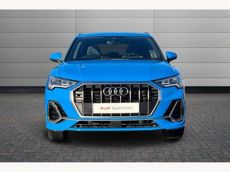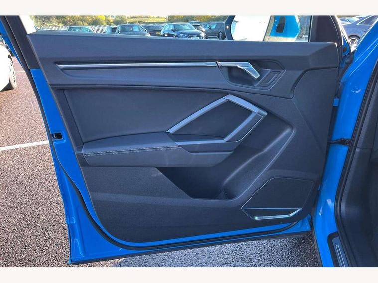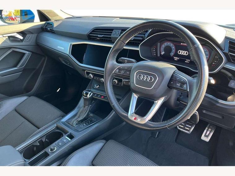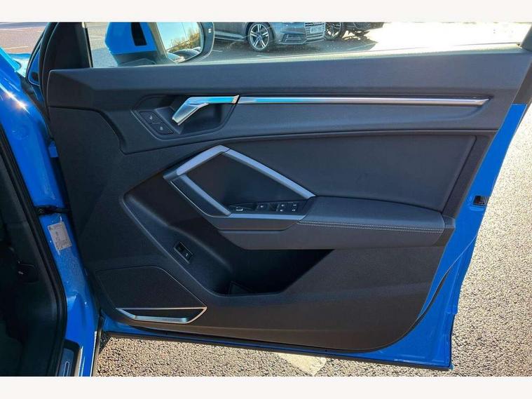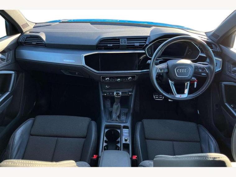 Audi connect safety and service (e-call), Audi drive select, Audi lane departure warning, Audi side assist, Audi smartphone interface includes wireless Apple carplay/Android Auto, Audi Virtual Cockpit - 10.25" display, Bluetooth interface, Camera based traffic sign recognition, MMI Navigation Plus with high resolution 10.1 inch touchscreen colour display, Power operated tailgate, Progressive steering, Service interval indicator, Start stop system with recuperation, Voice control system with natural language interaction, 48V Mild hybrid technology, Sports suspension, 1 x USB type C and 1 USB type A charging points, 6 passive loudspeakers, DAB digital radio module, Acoustic windscreen, Aluminium roof rails, Aluminium window trim, Auto dimming frameless rear view mirror, Body coloured bumpers, Electrically folding, adjustable and heated door mirrors with integrated LED side indicators and kerb view function for passenger side, Front and rear electric windows, Front fog lights, Front side air inlets in matt platinum grey, Front spoiler blade in matt platinum grey, Grille vertical bars in aluminium silver/Matt, High gloss black finish B and C pillars, LED headlights with LED daytime running lights and dynamic rear indicator, LED rear lights, Privacy glass dark tinted rear and rear-side windows (from B-pillar backwards), Rain and light sensors, Rear diffuser strip in matt titanium black, S line badges on front wings, S Line front and rear bumpers, Side skirt insert in matt Platinium grey, Silver chrome grille surround, Titanium black radiator grille, 12V socket in rear centre console, 40:20:40 folding with manual adjustment for 60:40 forwards/backwards position and backrest angle, Adjustable rear seat bench/backrest with centre armrest and cupholder, Black cloth headlining, Dual zone electronic climate control, Front and rear black floor mats with contrast stitching in rock grey, Front and rear headrests, Front and rear roof module including reading lights, Front centre armrest, Glove compartment lighting, Height and reach adjustable steering wheel, Illuminated door sill trims with S logo, ISOFIX child seat mounting for front passenger with airbag deactivation and outer rear seat including top tether attachment point for outer rear seats, Luggage compartment light, Manual front seats with height adjustment, Perforated leather gearknob, Stainless steel luggage compartment sill finisher, Stainless steel pedals, Tool kit, Non smoking pack - Q3, 3x3 point rear seatbelts, 6 airbags - Driver, front passenger, curtain and side windows, Electrically operated child locks on rear doors, Electromechanical parking brake, Electronic stabilisation control including ABS, ASR and EDL, Hill descent control, Hill hold assist, Pre sense basic, Seatbelt monitoring, Tyre pressure warning, Warning triangle and first aid kit, Anti theft alarm, Anti theft wheel bolts, Audi pre-sense front with pedestrain and cyclist recognition, Remote central locking, Dark matt brushed aluminium inlay, Leatherette door armrest, MMI touch colour display in glass look, black with surround in aluminium look, Tyre repair kit,