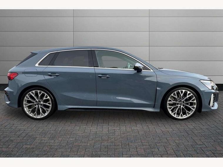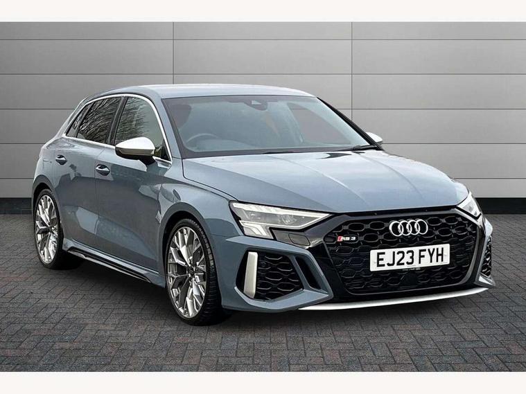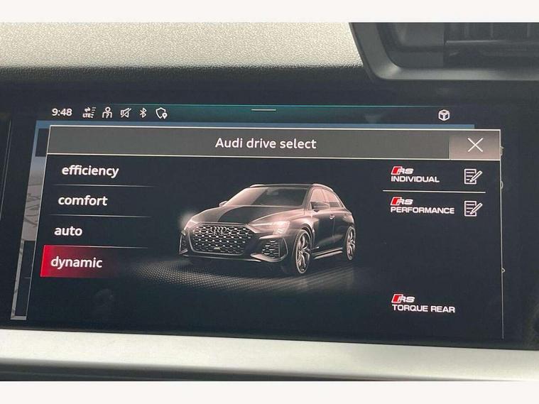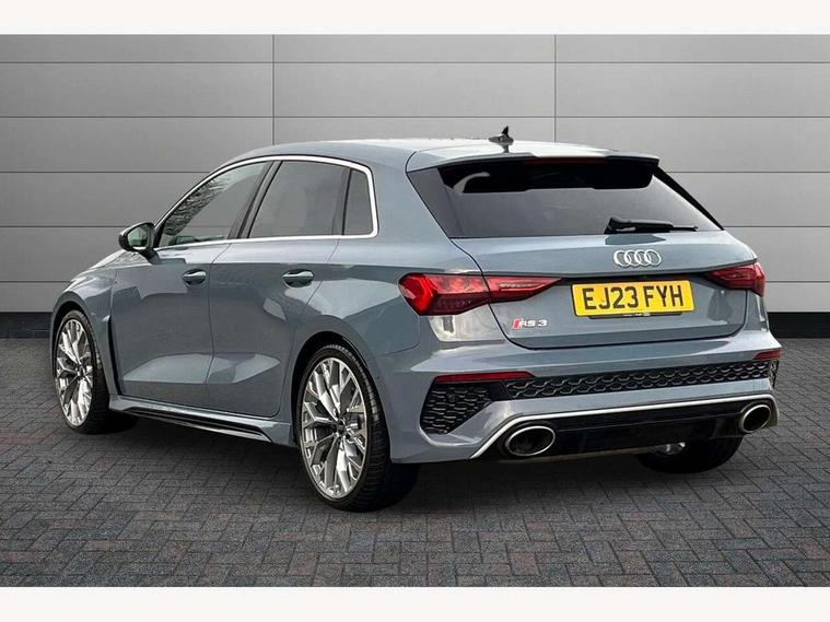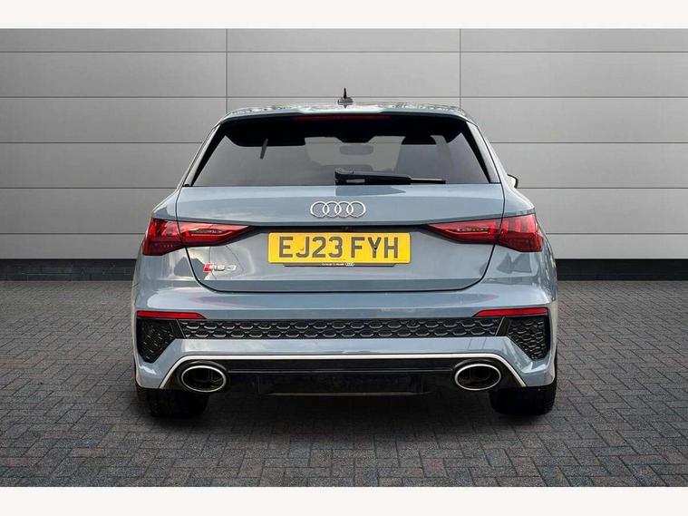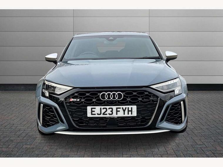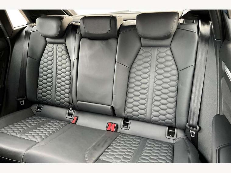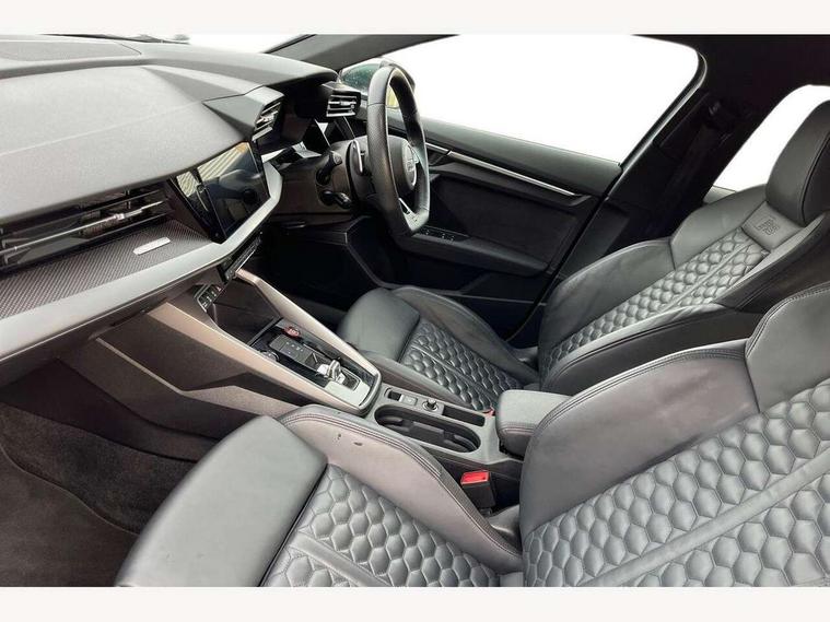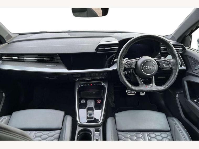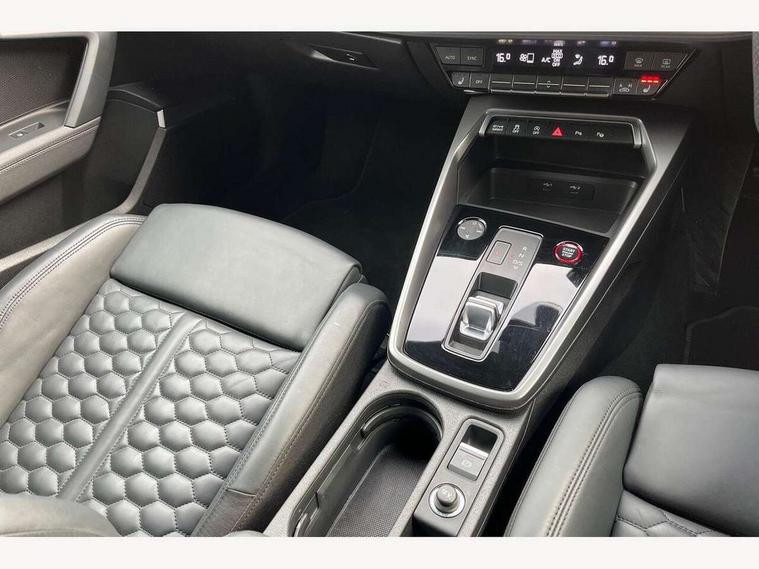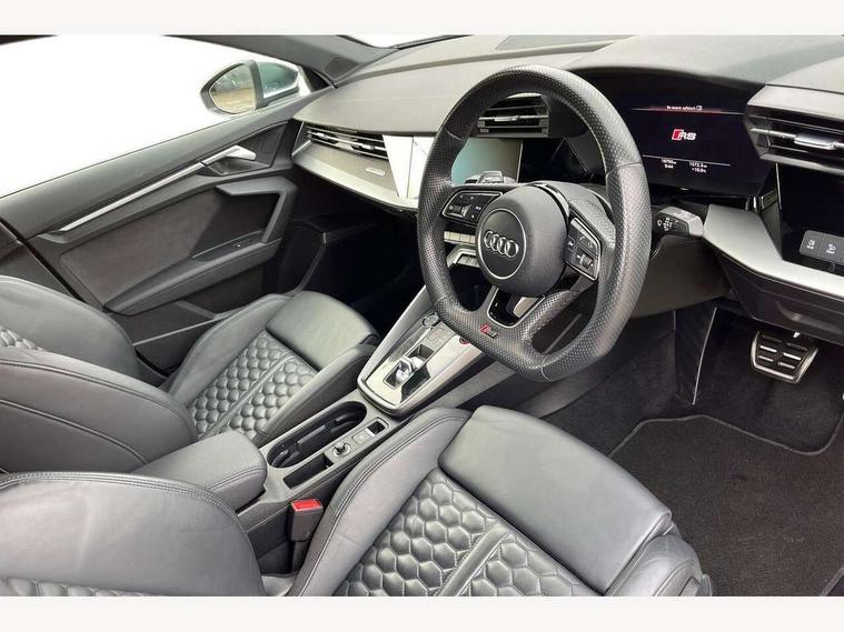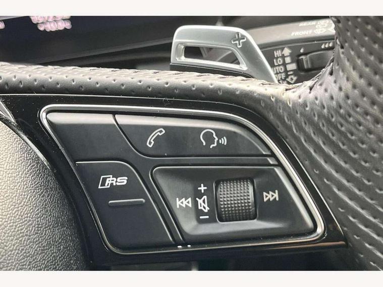 Audi smartphone interface, Audi virtual cockpit with RS specific display 12.3" full colour digital instrument cluster, Automatic start/stop system with recuperation, Bluetooth interface, Collision avoidance assistant, Emergency e-call, Lane departure warning system, Legal emergency call, Manual boot opening, Parking assist with parking system plus, Progressive power assisted steering, Quattro permanent four wheel drive, Rear suspension, Audi sound system impressive sound with 10 loudspeakers including centre speaker and subwoofer, 6-channel amplifier with a total output of 180 watts, DAB Digital radio, 3rd brake light, Acoustic glass windscreen, Audi beam uses LEDs to project the Audi sport logo onto the ground as you exit your RS 3, Auto dimming rear view mirror, Black side skirts, Body colour roof, Daytime running lights, Door mirrors - electrically adjustable, heated, folding and auto dimming on both sides, Headlight washers, LED headlights with LED rear lights + dynamic rear indicators, Light and rain sensors, Matt aluminium door mirrors, Matt aluminium window trims, Privacy glass - dark tinted rear and rear side windows from B-pillar backwards, Rear side wing doors, Rear window wiper and washer system, 3 seat bench in 2nd row, 40/20/40 split folding rear seat bench, Black cloth headlining, Dual zone electronic climate control, Front and rear headrests, Front centre armrest, Front sports seats RS embossed logo, Front/rear floor mats, Heated front seats, Honeycomb stitching and RS embossing, Illuminated door sill trims inlays in aluminium with RS 3 logo, Illuminated vanity mirror, Manually adjustable front seats, RS emblems, Single front passenger seat, Stainless steel pedals and front footrest in black, Aluminium interior elements pack - RS3, Ambient lighting pack - RS3, MMI navigation plus with MMI touch - RS3, RS bodystyling - RS3, Storage Pack - RS3, 3x3 point rear seat belts, ABS/EBD, ASR, Audi pre sense front, Driver/Front Passenger airbags, EDL, ESC - Electronic Stability Control + traction control, Front passenger airbag deactivation, Front side airbags with head airbags and interaction airbag, Hill hold assist, Seat belt reminder with passenger presence detection in rear, Tyre pressure loss indicator, Warning triangle and first aid kit, Anti theft alarm, Anti-theft wheel bolts, Electronically operated child lock, Remote control central locking, Carbon inlays, accent surfaces in the dashboard and centre console in platinum grey silk effect paint finish, 19" 10 Y spoke platinum grey, gloss turned finish alloy wheels, Tool kit, Tyre repair kit,