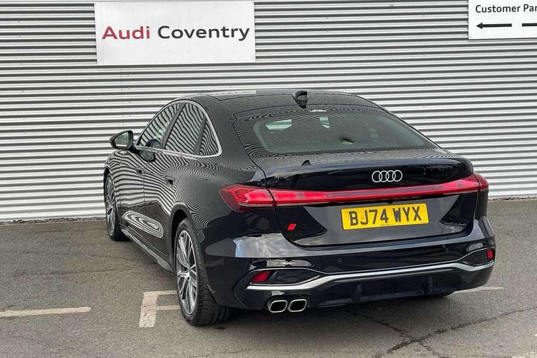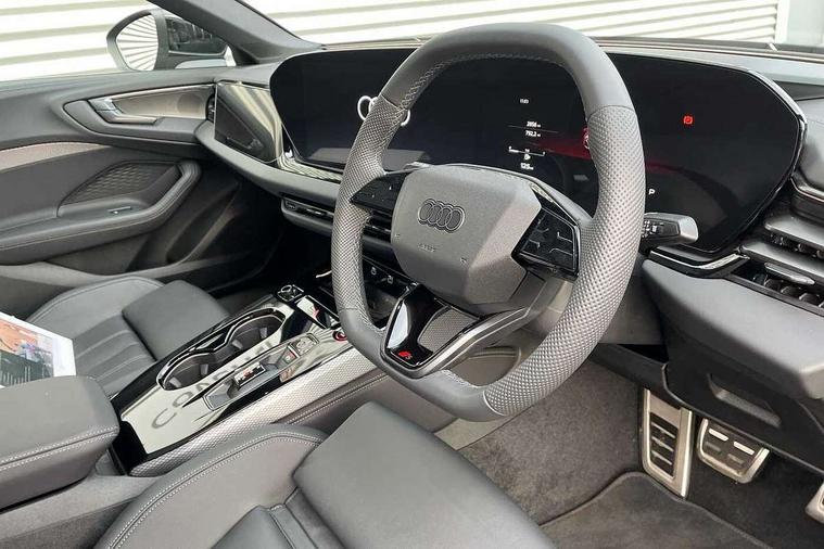 Adaptive cruise control, Advanced driver attention and fatigue montior, Audi application store, Audi assistant, Audi connect emergency call and service, Audi drive select, Audi smartphone interface, Audi virtual cockpit plus with 11.9" OLED colour display, Automatic start/stop system with coasting functionality, Camera based traffic sign recognition, Intersection assist, Lane change assistant with exit warning system, rear cross traffic alert and rear turn assist, Lane departure warning with emergency assist, MMI 10.9" front passenger touch display, MMI navigation plus with high resolution 14.5" OLED touchscreen colour display, Park assist plus, Parking system plus with 360 display, Progressive steering with servotronic, Swerve assist and turn assist, Top view camera, Traffic sign based speed limiter, Sports suspension lowered by 20mm, 2 USB-C ports in both the front and rear, Audi sound system impressive sound with 10 loudspeakers including centre speaker and subwoofer, 6-channel amplifier with a total output of 180 watts, DAB digital radio reception, Smartphone compartment with wireless charging, Aluminium window trims, Auto dimming rear view mirror, Black door handles, Dark chrome-plated tailpipe trims, Door mirrors - electrically adjustable, heated, folding and auto dimming on both sides, Front and rear electric windows, Front door sill trims with aluminium inlays, illuminated with 'S' logo, Headlight cleaning system, High beam assist, LED daytime running lights, LED rear lights pro incl. dynamic rear indicators and illuminated light strip with animated coming and leaving home function, LED third brake light, Matrix LED headlights with eight light signatures selectable via the MMI or the myAudi app, Privacy glass, Rear and side windows with heat insulating glass, Rear boot, Rear side wing doors, Red S line rhombus badging on rear, S line bumpers, radiator grille and diffuser in phantom black and diffuser insert in matt anthracite, White rhombus logo projection light in exterior mirrors, Windscreen with acoustic glazing, 3 rear headrests, 3 seat rear bench, 3 spoke leather steering wheel with multi-function buttons with touch control, flattened on top and bottom, with S badging and contrast stitching, 3-zone automatic climate control, 40:20:40 split folding rear seat bench with centre armrest and cup holders, Comfort front centre armrest, Electrically adjustable front seats, Front and rear floor mats, Front sport seats with integrated headrest and S embossed logo, Headlining in black cloth, Heated front seats, i-Size child seat mounting on the front passenger side and i-Size and top tether on the outer rear seats, Luggage compartment lid, electrically opening and closing, Manual steering column height and depth adjustment, Memory function for driver seat, Single front passenger seat, Stainless steel pedals and footrest, Steering wheel grips in perforated leather and shift paddles, Ambient lighting package plus - A5, Black styling package plus - A5, 3x3 point rear seat belts, Acoustic vehicle alerting system, Convenience key with safelock, Driver airbag, Electric child safety locks, First aid kit with warning triangle and vests, Front emergency brake assist, Front passenger airbag, Front passenger airbag deactivation, Hill hold assist, Occupant detection in rear seat area, Proactive passenger protection system for front, sides and rear, Red brake calipers, Seat belt monitoring with rear seat occupant reminder, Side airbags in front and rear with head airbag system and front interaction airbag, Tyre pressure loss indicator, Anti theft alarm, Anti-theft wheel bolts, Keyless Go, Accent surfaces and control buttons in gloss black, Black dashboard with contrast stitching, Softwrap in Dinamica with contrast stitching, Upper and lower interior elements in dinamica microfiber, 20" 5 arm fold design Audi sport alloy wheels in silk matt grey and gloss turned finish, Tyre repair kit,