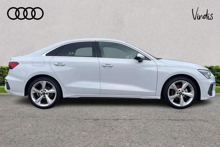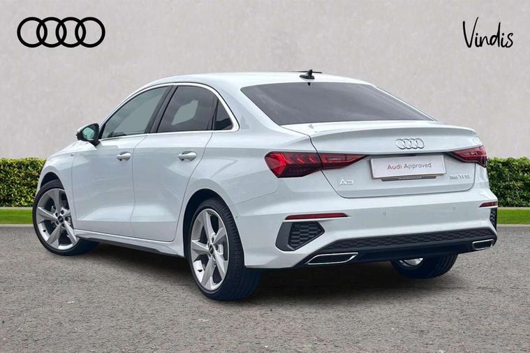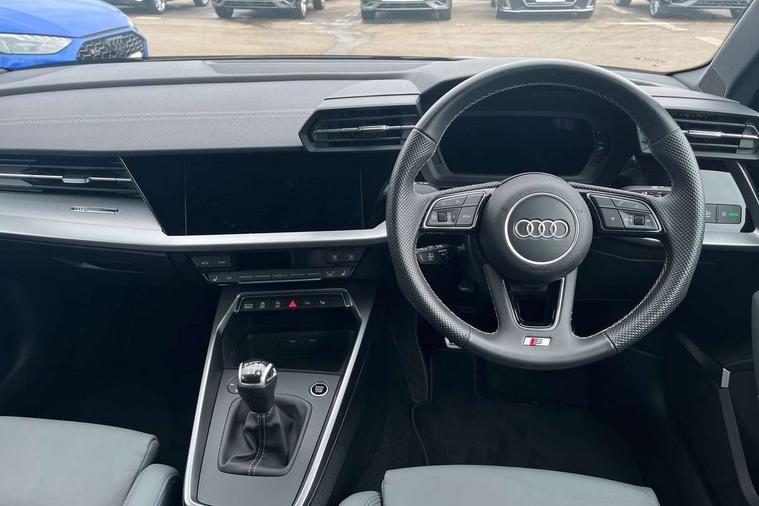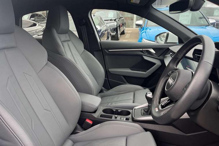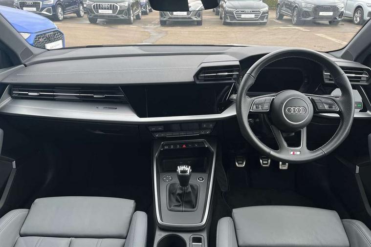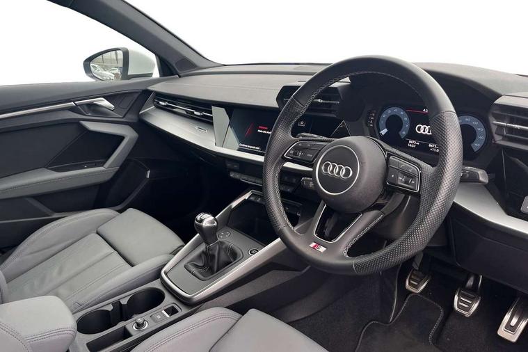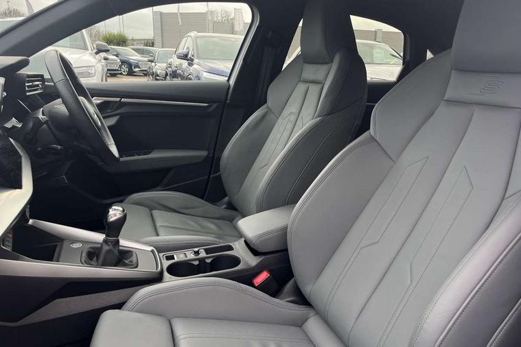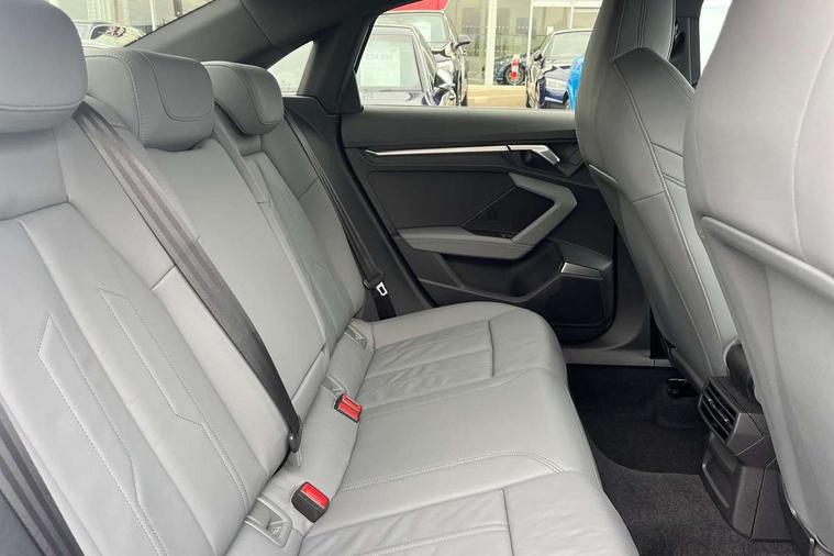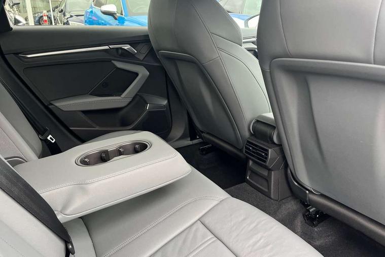 Audi connect emergency call and service, Audi drive select (Auto, Comfort, Dynamic, Efficiency and Individual), Audi smartphone interface, Audi Virtual Cockpit - 10.25" digital and colour instrument cluster, Automatic start/stop system with recuperation, Bluetooth interface, Collision avoidance assistant, Cruise control + speed limiter, Electromechanical power speed sensitive steering, Lane departure warning system, MMI Navigation Plus with high resolution 10.1" colour touch screen display, Rear parking sensors, Service indicator, Voice control system with natural language interaction, 2x USB Type C ports (for charging and data transfer), 6 passive loudspeakers, CD player, DAB Digital radio, 3rd brake light, Acoustic glass windscreen, Aluminium window trim, Auto dimming frameless rear view mirror, Electrically adjustable/heated/folding/dimming door mirrors with kerb view includes integrated LED indications + kerb view function for passenger side, Front electric windows, Illuminated door sills with aluminium inserts at the front with S logo, LED daytime running lights, LED headlights with LED rear lights and dynamic rear indicators, Light and rain sensors, Model and engine designation badges at rear, Privacy glass - dark tinted rear window, rear door and side windows, Rear boot, Rear electric windows, Rear side wing doors, S line bumpers, S roof spoiler, 12V socket and storage compartment in front centre console, 3 seat bench in 2nd row, 40/20/40 split folding rear seat bench with cupholder, Black cloth headlining, Dual zone electronic climate control, Front and rear centre armrest in leather, Front and rear headrests, Front/rear floor mats, Height and reach adjustable steering wheel, Illuminated vanity mirror, Interior lighting - glove compartment light and right hand side, Luggage compartment floor covering, Manual boot compartment lid, Manually adjustable front sport seats, Seat side bolsters, Single front passenger seat, Stainless steel pedals and front footrest in black, Twin leather upholstery with front sports seats S embossed logo, Aluminium interior elements pack - A3 Saloon, LED interior lighting pack - A3 Saloon, S line styling pack - A3 Saloon, 3x3 point rear seat belts, Driver and front passenger airbag with passenger airbag deactivation, Electronic Stabilisation Control (ESC) including ABS, ASR and EDL, First aid kit with warning triangle and 2 safety vests, Front side airbags with head airbags and interaction airbag, Hill hold assist, Pre-sense front with pedestrian and cyclist detection, Seatbelt monitoring, Tyre pressure loss indicator, Anti theft alarm, Anti-theft wheel bolts, Electronically operated child locks, Immobiliser, Remote control central locking, Aluminium air vent surrounds, Aluminium trim elements, Dark spectrum aluminium inlays, accent surfaces in the dashboard and centre console in platinum grey silk effect paint finish,