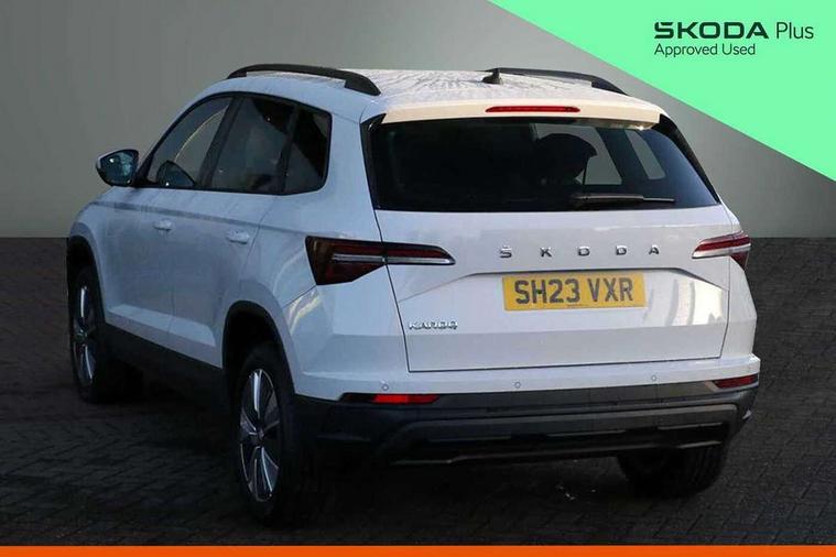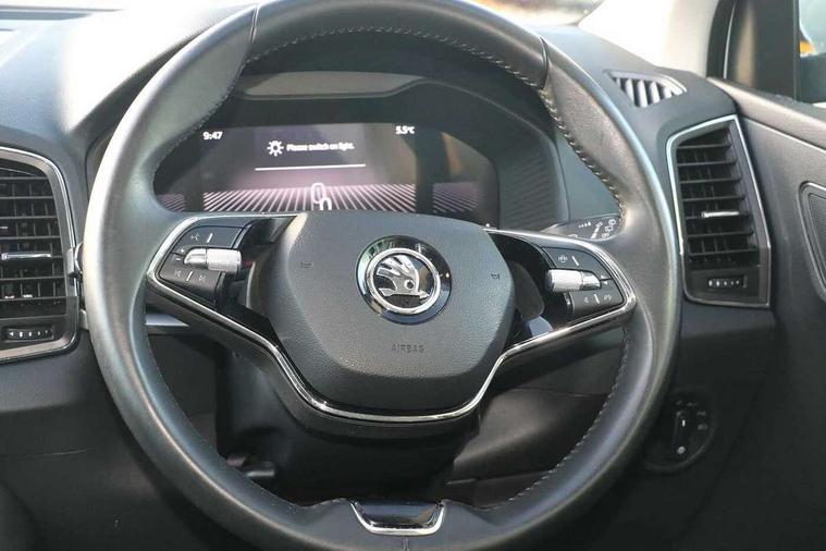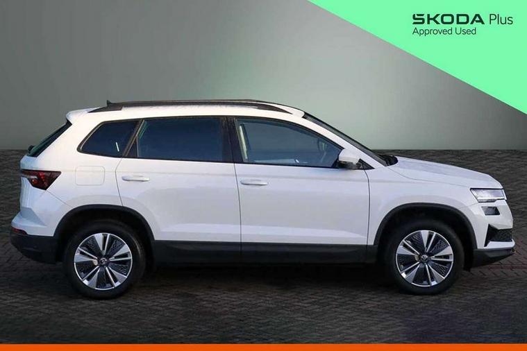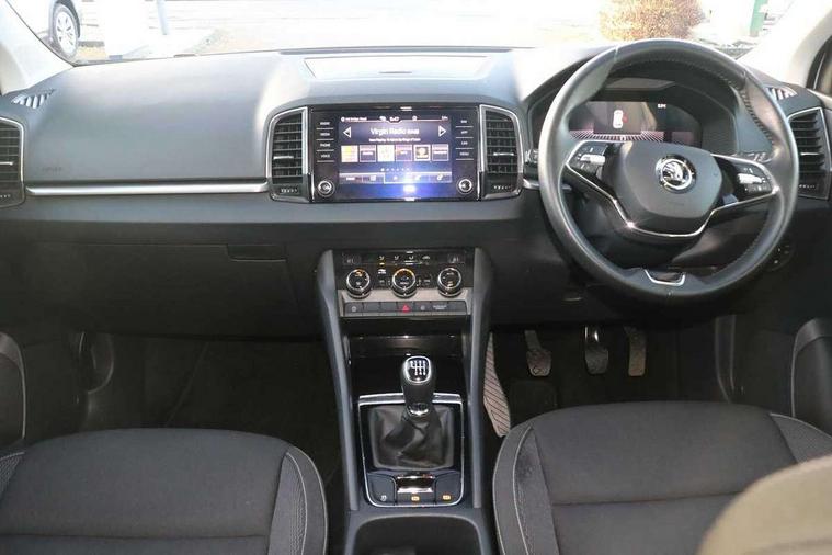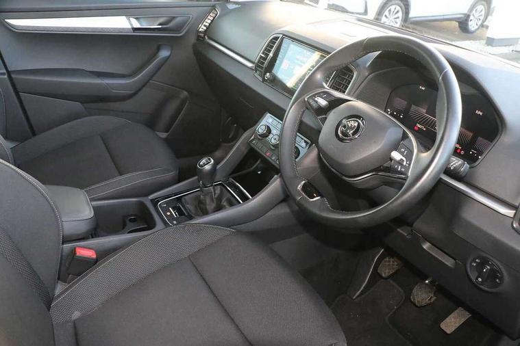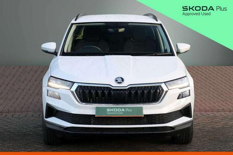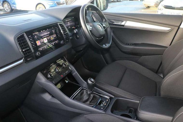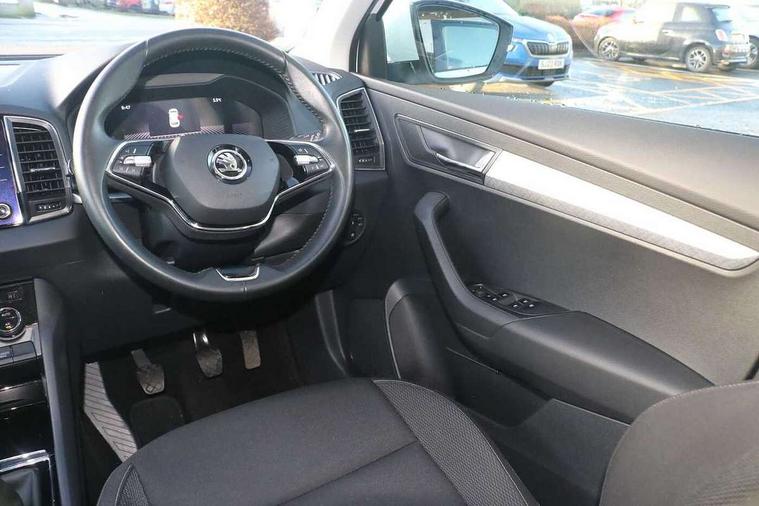 8" Digital display, Amundsen satellite navigation with 8" touchscreen display with maps Europe, WLAN and web radio, Care connect, Driver fatigue sensor, Emergency services call system, Outside temperature gauge, Service interval indicator, SmartLink wireless for Apple and wired for Android, Start/stop system with regenerative braking, USB C Port x 2 in front centre console, 8 speakers, DAB radio with Bluetooth, USB connection, Acoustic glass, Aero front windscreen wipers with intermittent function, Auto dimming rear view mirror with light and rain sensors, Black electric window control buttons, Body colour door mirrors and handles, Dynamic headlight range control with cornering light function, Electric front and rear windows with child proof lock, Electrically adjustable heated folding and auto dimming door mirrors, Front fog lights, Heated rear windscreen, LED daytime running lights, LED Headlights, LED rear lights with high functionality welcome effect and dynamic indicators, Light assistant (coming/leaving home/tunnel light), Plastic scuff plates, Privacy glass, Rear side wing doors, Rear window wiper with washer system and intermittent control, Safety reflectors on front doors, 1.5 litre bottle holders in driver and front passenger door panels, 12V socket in boot, 12v socket in front centre armrest with storage compartment and rear air vents, 2 x Tablet holder, 3 rear height adjustable headrests, 3 seat bench in 2nd row, 4 foldable roof handles with rear coat hooks, Black floor carpet, Chrome inner door handles, Double sided boot floor, Driver/front passenger reading lights, Foldable hooks in the boot, Folding tables on the front seat backrests, Front head restraints, Height adjustable driver and passenger seat, Height adjustable front three point seats belts with tensioners, Height/reach adjust steering wheel, Ice scraper, Illuminated glovebox, Illuminated luggage compartment, Isofix child seat preparation for front passenger seat, Isofix child seat preparation outer rear, Manual lumbar support for front seats, Pearl grey interior ceiling, Pen holder, Pollen filter, Rear boot cover, Rear reading lights, Rubbish bin door, Safety vest holder, Single front passenger seat, Storage box in upper central dashboard closed, Sunvisors with illuminated vanity mirrors, Textile floor mats, Ticket holder, Umbrella under passenger seat, Boot pack - Karoq, Automatic door unlocking in case of crash, Automatic fuel cut off in case of crash, Child locks on rear doors, Driver airbag, Electronic parking brake with auto hold function, Emergency rear braking signal, ESC including ABS, MSR, ASR, EDS, HBA, DSR, RBS, MKB and traction control, Front side airbags, Hill hold control, Knee airbags, Passenger airbag with switch-off function, Pedestrian monitor, Seatbelt reminder signalisation and pretensioner for all seats, Three point seatbelts rear, Two tone horn, Tyre pressure display, Tyre pressure monitor, Alarm with interior monitoring, back up horn and tilt sensor with safe function, Electronic engine immobiliser, Remote central locking with 2 remote folding keys, Black centre console, Chrome framed air vents, Satin black dashboard, Satin black door trim, Anti-theft wheel bolts protection, Storage on wheel cover, Tool kit,