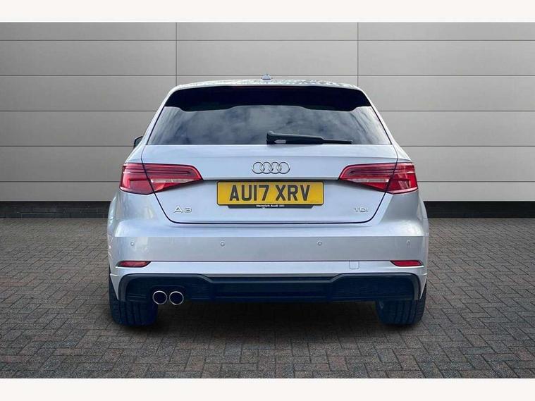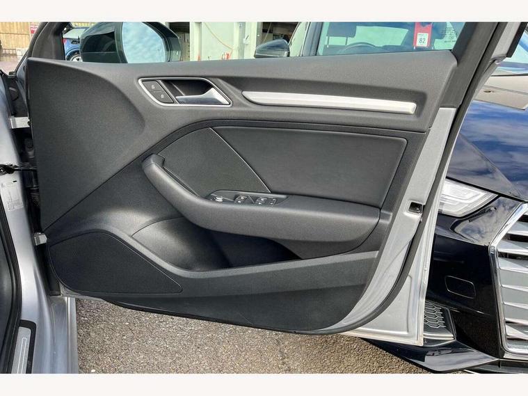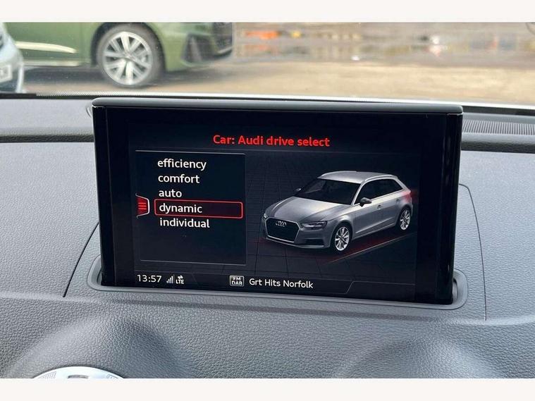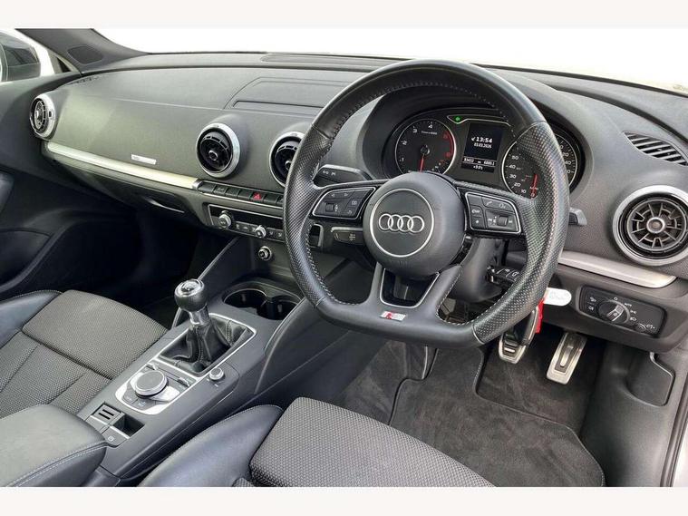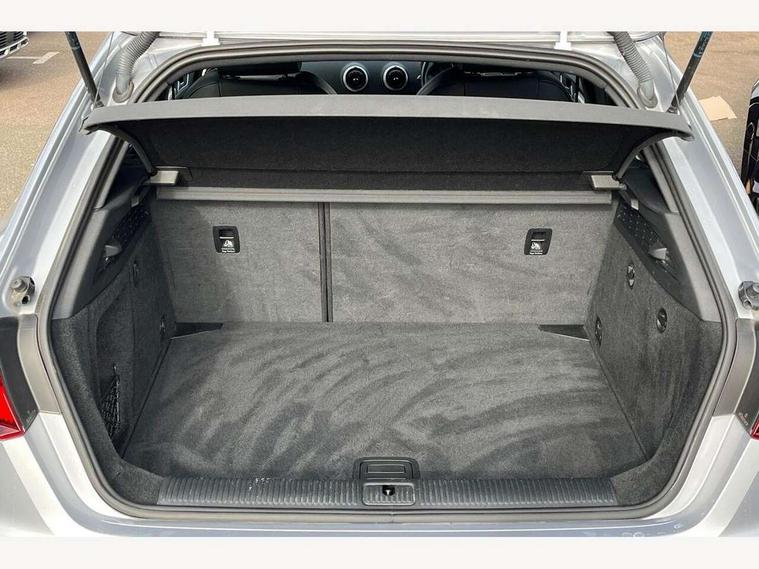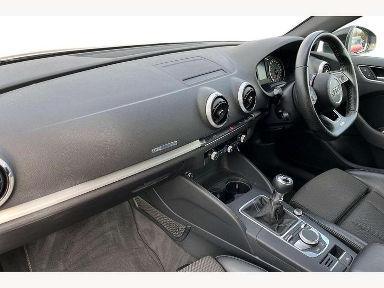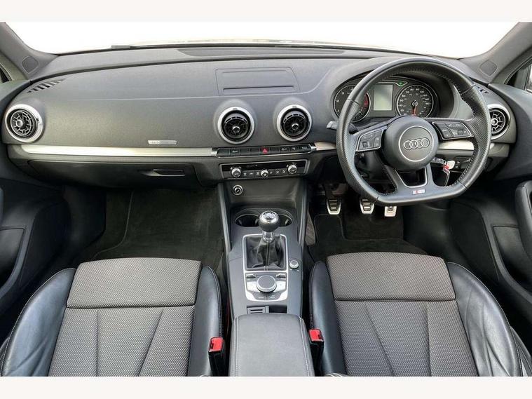 Audi connect, Audi drive select, Audi smartphone interface, Colour driver's information system display, Mobile telephone preparation - bluetooth interface, Service interval indicator, Speed limit display, Voice control system, Diesel particulate filter, 2 USB ports, Audi music interface, Auxiliary input socket, DAB Digital radio, Black door mirrors, Black window surrounds, Body colour bumpers with black insert, Body colour roof spoiler, Chrome exhaust tailpipes, Electric front windows, Electric operated/heated door mirrors, Electric rear windows, Heated windscreen washer jets, LED daytime running lights, Matt black radiator grille, Privacy glass, Rear wiper, S Line body styling, Sport specific side air inlet grille and diffuser insert, 3 adjustable rear headrests, 3 spoke flat bottomed multi-function leather steering wheel, 4 lashing points to secure luggage, Adjustable front armrest, Black cloth headlining, Dual zone electronic climate control, Front and rear interior lights with delay, Front passenger seat isofix location point, Front/rear floor mats, Height/depth adjustable steering column, Illuminated glovebox, ISOFIX child seat preparation+airbag deactivation, Jack and tool kit, Stainless steel pedals, Storage compartment in centre console, Storage compartment under front seats, Storage compartments in doors, Black styling pack - A3/S3, LED interior light pack - A3/RS3, Light and rain sensor pack - A3 Hatchback/Sportback, Storage and luggage pack - A3/RS3, 3 point seatbelts on all seats, ABS/EBD, Active bonnet, Active front headrests, ASR, Curtain airbags, Driver and passenger side airbags, Driver/Front Passenger airbags, Drivers knee airbag, EDL, Electromechanical parking brake, ESC - Electronic Stability Control + traction control, Front passenger airbag deactivation, Manual rear child locks, Multi-Collision braking, Seatbelt warning, Tyre pressure monitor, Warning triangle and first aid kit, Anti theft alarm, Anti-theft wheel bolts, Remote control central locking, Thatcham category 1 alarm + immobiliser, Aluminium air vent surrounds, Aluminium trim elements, 18" 10 spoke design alloy wheels in matt titanium look with diamond cut finish, Space saver spare wheel,