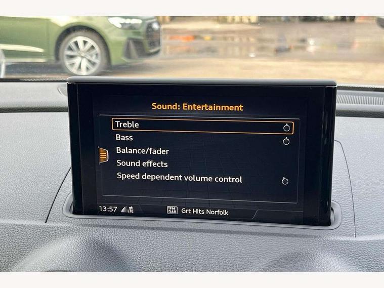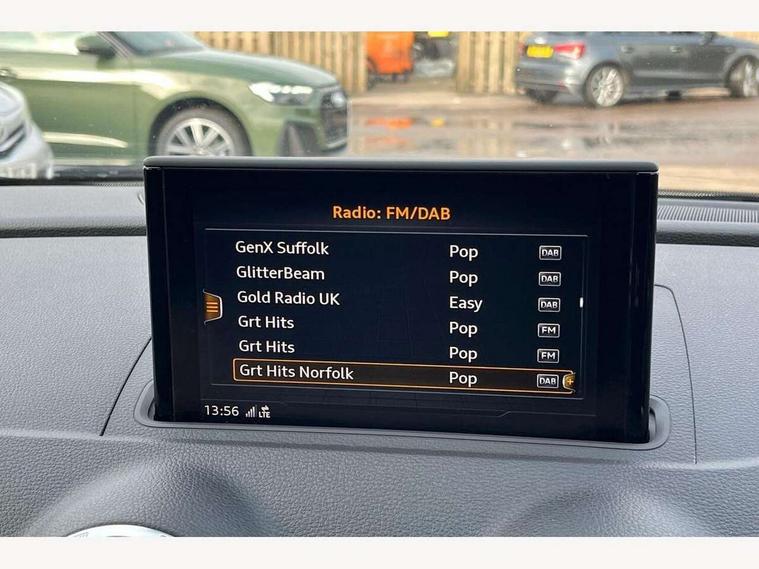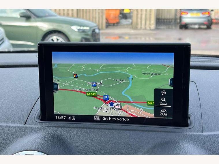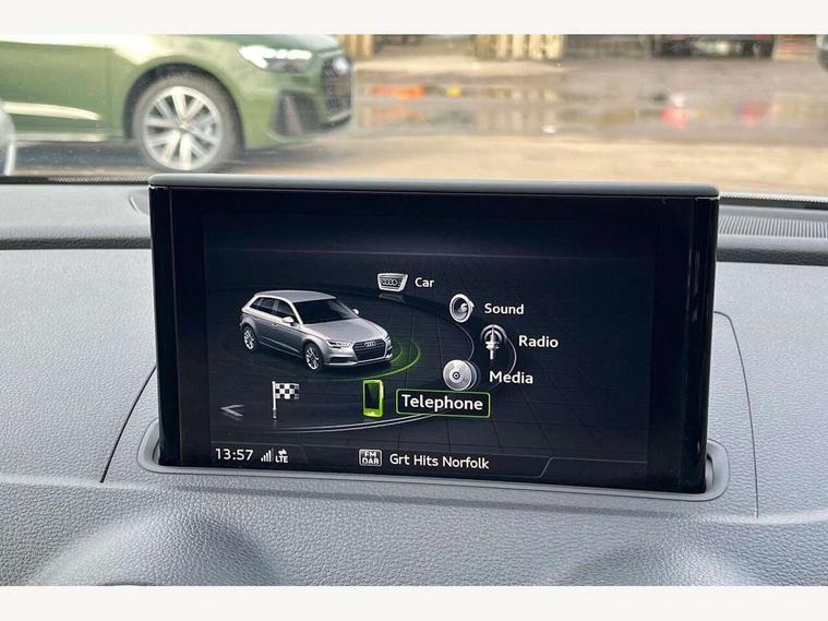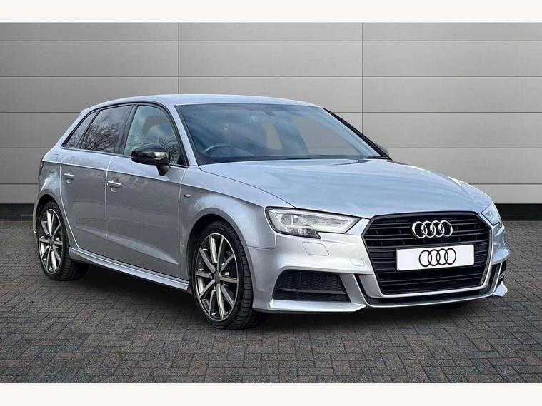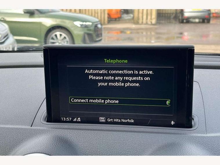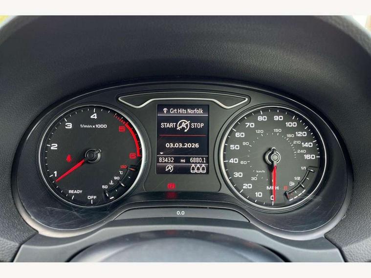 Audi connect, Audi drive select, Audi smartphone interface, Colour driver's information system display, Mobile telephone preparation - bluetooth interface, Service interval indicator, Speed limit display, Voice control system, Diesel particulate filter, 2 USB ports, Audi music interface, Auxiliary input socket, DAB Digital radio, Black door mirrors, Black window surrounds, Body colour bumpers with black insert, Body colour roof spoiler, Chrome exhaust tailpipes, Electric front windows, Electric operated/heated door mirrors, Electric rear windows, Heated windscreen washer jets, LED daytime running lights, Matt black radiator grille, Privacy glass, Rear wiper, S Line body styling, Sport specific side air inlet grille and diffuser insert, 3 adjustable rear headrests, 3 spoke flat bottomed multi-function leather steering wheel, 4 lashing points to secure luggage, Adjustable front armrest, Black cloth headlining, Dual zone electronic climate control, Front and rear interior lights with delay, Front passenger seat isofix location point, Front/rear floor mats, Height/depth adjustable steering column, Illuminated glovebox, ISOFIX child seat preparation+airbag deactivation, Jack and tool kit, Stainless steel pedals, Storage compartment in centre console, Storage compartment under front seats, Storage compartments in doors, Black styling pack - A3/S3, LED interior light pack - A3/RS3, Light and rain sensor pack - A3 Hatchback/Sportback, Storage and luggage pack - A3/RS3, 3 point seatbelts on all seats, ABS/EBD, Active bonnet, Active front headrests, ASR, Curtain airbags, Driver and passenger side airbags, Driver/Front Passenger airbags, Drivers knee airbag, EDL, Electromechanical parking brake, ESC - Electronic Stability Control + traction control, Front passenger airbag deactivation, Manual rear child locks, Multi-Collision braking, Seatbelt warning, Tyre pressure monitor, Warning triangle and first aid kit, Anti theft alarm, Anti-theft wheel bolts, Remote control central locking, Thatcham category 1 alarm + immobiliser, Aluminium air vent surrounds, Aluminium trim elements, 18" 10 spoke design alloy wheels in matt titanium look with diamond cut finish, Space saver spare wheel,