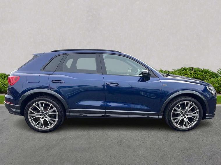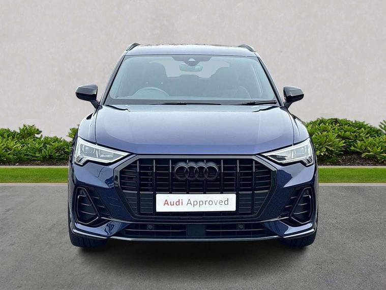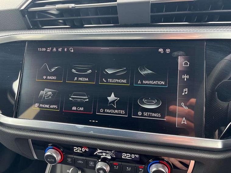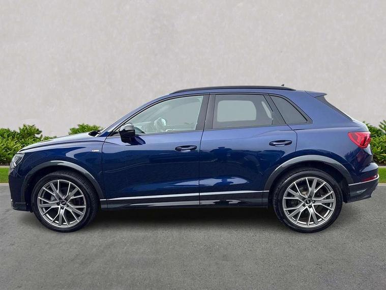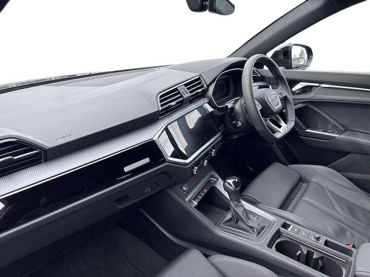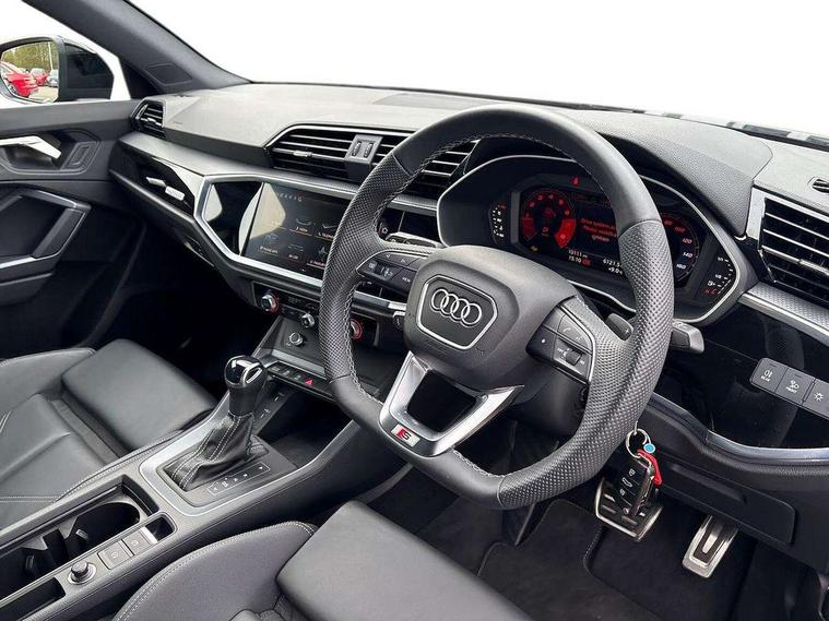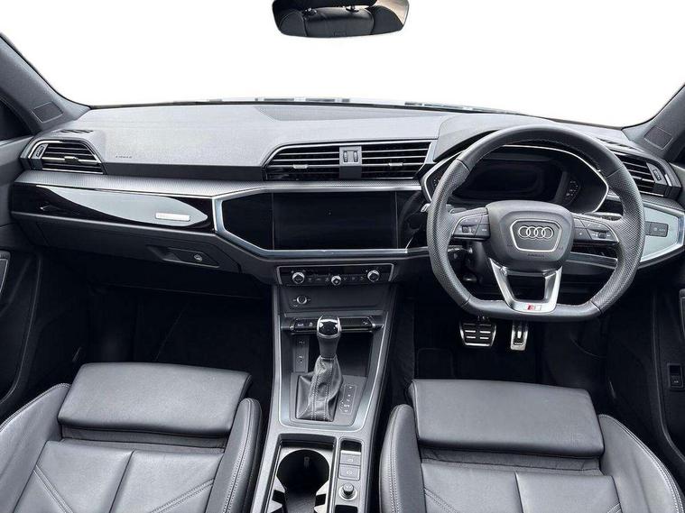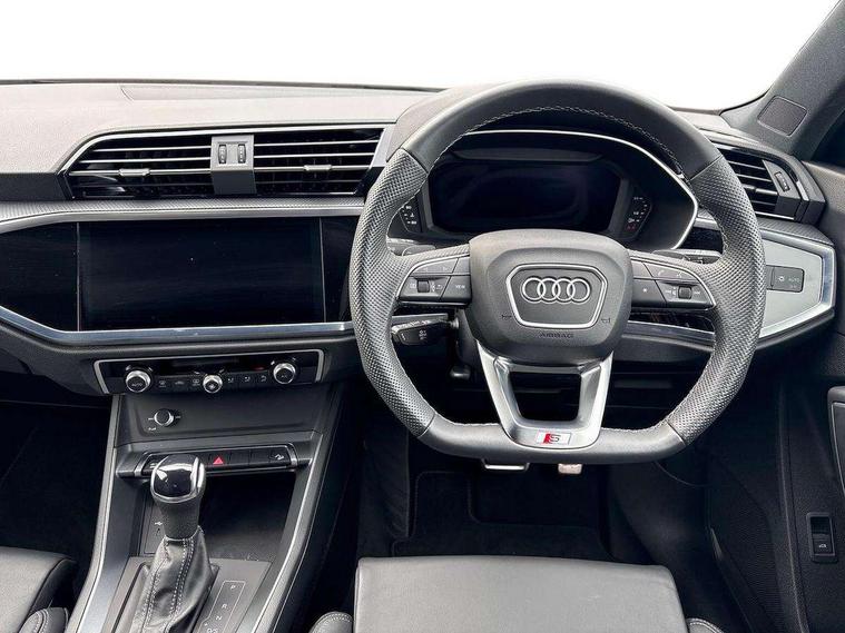 Amazon alexa Integration, Audi connect safety and service, Audi drive select, Audi lane departure warning, Audi smartphone interface includes wireless Apple carplay/Android Auto, Audi Virtual Cockpit - 10.25" display, Bluetooth interface, Camera based traffic sign recognition, Distraction and Fatigue warning, Legal emergency call, MMI Navigation Plus with high resolution 10.1 inch touchscreen colour display, Power operated tailgate, Progressive steering, Service interval indicator, Start stop system with recuperation, Voice control system with natural language interaction, Sports suspension, 2 USB-C ports with charge and data functions, 6 passive loudspeakers, DAB digital radio module, Acoustic windscreen, Audi Beam uses LEDs to project the Audi logo onto the ground as you exit your Q3, Auto dimming door mirrors, Auto dimming frameless rear view mirror, Black roof rails, Electrically folding, adjustable and heated door mirrors with integrated LED side indicators and kerb view function for passenger side, Front and rear electric windows, Front fog lights, Grille vertical bars in aluminium silver/Matt, High gloss black finish B and C pillars, LED Dynamic rear indicators, LED headlights with LED daytime running lights, LED rear lights, LED third brake light, Privacy glass dark tinted rear and rear-side windows (from B-pillar backwards), Rain and light sensors, Rear diffuser grille in grained matt black, Rear diffuser strip in matt anthracite black, Rear side wing doors, Rear wiper, S line bumpers in contrasting Manhattan grey, Variable front intermittent wipers, 12V socket in rear centre console, 3 seat bench in 2nd row, 40:20:40 folding with manual adjustment for 60:40 forwards/backwards position and backrest angle, Adjustable rear seat bench/backrest with centre armrest and cupholder, Black cloth headlining, Dual zone electronic climate control, Electric lumbar support, Front and rear black floor mats with contrast stitching in rock grey, Front and rear headrests, Front centre armrest, Height and reach adjustable steering wheel, Illuminated door sill trims with S logo, ISOFIX child seat mounting for front passenger with airbag deactivation and outer rear seat including top tether attachment point for outer rear seats, Manual front seats with height adjustment, Perforated leather gearknob, Single front passenger seat, Stainless steel luggage compartment sill finisher, Stainless steel pedals, Twin leather upholstery with front sport seats + S embossing, Black styling pack - Q3, Non smoking pack - Q3, 3x3 point rear seatbelts, 6 airbags - Driver, front passenger, curtain and side windows, Audi pre-sense front with pedestrain and cyclist recognition, Electrically operated child locks on rear doors, Electromechanical parking brake, Electronic stabilisation control including ABS, ASR and EDL, Front seatbelt reminder, Hill descent control, Hill hold assist, Pre sense basic, Seatbelt monitoring, Tyre pressure warning, Warning triangle and first aid kit, Anti theft alarm, Anti theft wheel bolts, Immobiliser, Remote central locking, Aluminium look interior elements, Detail dashboard around MMI touch colour display in glass look, black with surround in aluminium look, Leatherette door armrest, Piano black inlay,