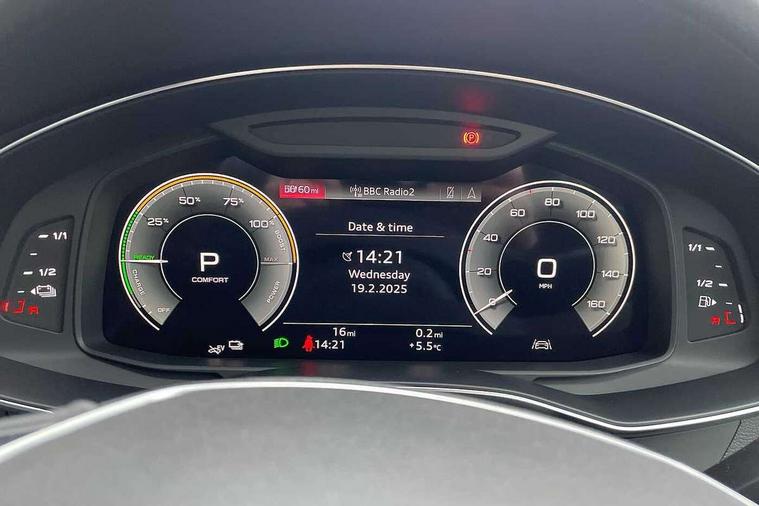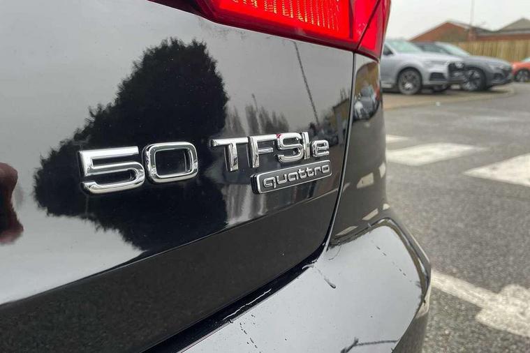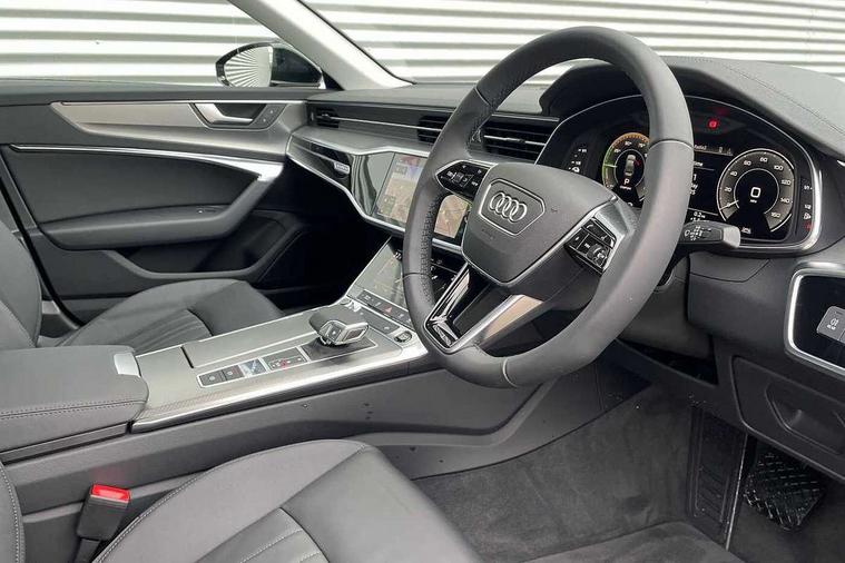 Audi connect safety and service (e-call), Audi connect with Amazon Alexa Integration, Audi drive select, Audi parking system plus - acoustic and visual park assist system for front and rear, Audi smartphone interface includes wireless Apple carplay/Android Auto, Audi virtual cockpit, Automatic start/stop system with coasting functionality, Bluetooth interface, Camera based traffic sign recognition, Cruise control + speed limiter, Electric boot lid release, Lane departure warning system, MMI navigation plus with 10.1" and 8.6" touch screens, Progressive steering, Rear view camera, Service interval indicator, Voice control system, 3 pin 10 amp domestic charging cable, 52 litre fuel tank, 7.4 kW onboard charger, Compact charging system, Hybrid propulsion system, Industrial connector CEE 32A, 230V, long and straight for the e-tron charging system, Mode 3 charging cable for public charging (AC), Standard suspension, Type 2 socket for AC charging, Audi front music interface, Audi sound system, Auxiliary input socket, DAB Digital radio, USB connection, Body coloured door mirrors, Daytime running lights, Electric front/rear windows, Electrically adjustable heated and folding + automatically dimming exterior mirrors with memory function, Frameless auto dimming interior rear view mirror, Front intermittent wipers, Heat insulating darkened glass in side and rear windows, Heat insulating glass in windshield, LED rear lights with dynamic indicators, LED third brake light, Matrix LED headlights, Matt black rear diffuser with diffuser strip and tailpipes in chrome, Matt black side air intake grille with inlay in matt aluminium, Privacy glass, Radiator grille in anthracite black matt, single frame in chrome and horizontal struts in matt aluminium silver, Rain and light sensors, Rear boot, Rear side wing doors, 3 spoke high multi-function leather steering wheel with shift paddles, 4 zone deluxe automatic climate control, 40/20/40 split folding 3 rear seat bench in 3 parts with rear centre armrest, Audi phone box light, Door sill trims with aluminium inlay, Electrically adjustable front seats including seat height, fore/aft position, backrest angle and 4-way lumbar with memory for driver's seat, Front and rear floor mats, Front centre armrest, Front head restraints, Heated front seats, Height/reach adjust steering wheel, Illuminated sun visors with vanity mirrors, Leather gear knob, Lunar silver cloth headlining, Rear headrests, Single front passenger seat, Tool kit and car jack, Twin leather upholstery, LED Interior Ambient Lighting Pack - A6, Non smoking pack - A6, 3 point seatbelts on all seats, Airbags - Front side, front and rear including head, Audi pre-sense front, EBD - Electronic brakeforce distribution, Electromechanical parking brake, Electronic Stability Control (ESC) including ABS, ASR and EDL, Extended pedestrian protection measures, ISOFIX child seat mounting for front passenger seat and ISOFIX child seat mounting with Top Tether for outer rear seats, Manual child proof rear door locks, Seatbelt monitoring, Tyre pressure warning light, Warning triangle and first aid kit, Anti theft alarm with tow away protection, Anti-theft wheel bolts and wheel loosening detection, Immobiliser, Keyless Go, Remote central locking, Aluminium fragment inlay, 18" 5 arm design cast aluminium alloy wheels, Tyre repair kit,