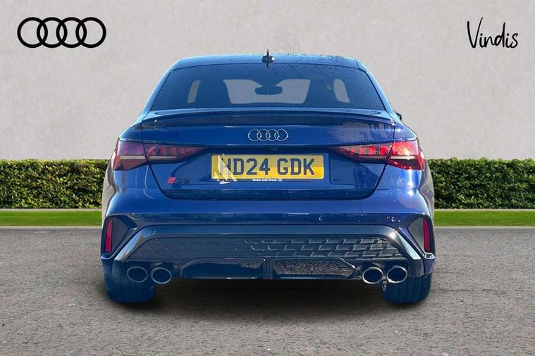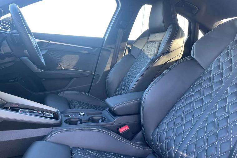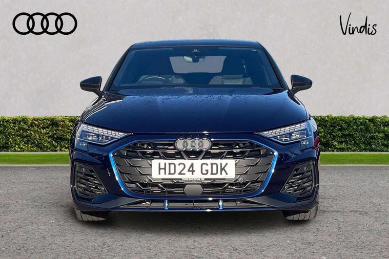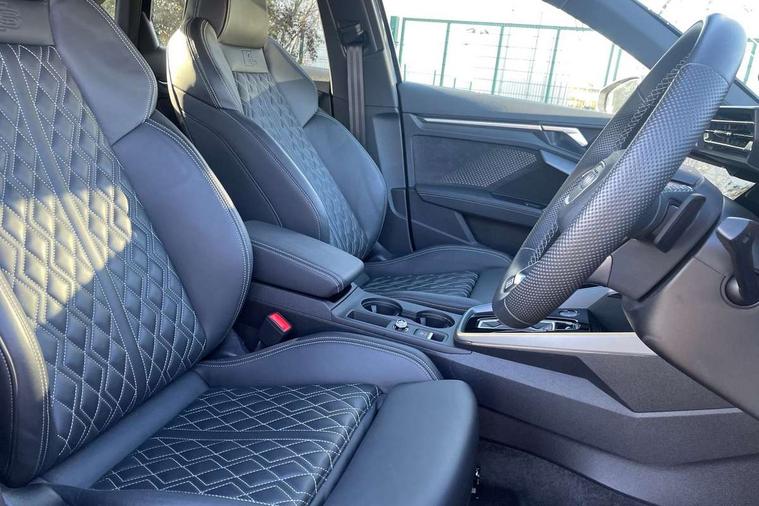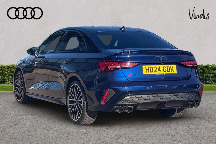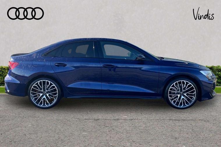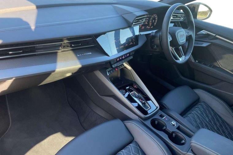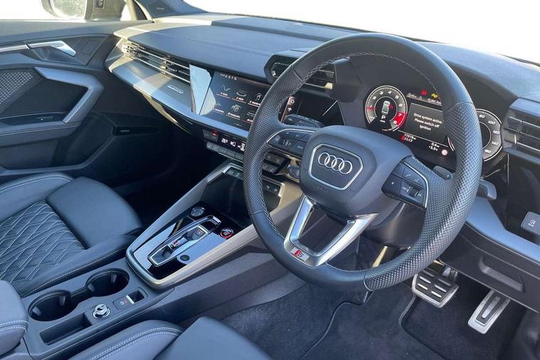 Adjustable speed limiter, Audi drive select, Audi smartphone interface with app store includes wireless Apple carplay, Android auto and Amazon alexa integration, Audi virtual cockpit plus - 12.3" full HD resolution dynamic digital instrument cluster, Automatic start/stop system with recuperation, Bluetooth interface, Camera based traffic sign recognition, Collision avoidance assistant, Distraction and Fatigue warning, e-Call (emergency call), Electromechanical power speed sensitive steering, Lane departure warning system, MMI Navigation Plus with high resolution 10.1" colour touch screen display, Park Assist with parking system Plus, Progressive steering, Service indicator, Trip computer, Voice control system with natural language interaction, S suspension with damper control, Audi Phonebox light with wireless charging, DAB Digital radio, USB ports with charging function in the rear, 3rd brake light, Anthracite grey Audi rings (front and rear), Audi Beam uses LEDs to project Vorsprung onto the ground as you exit your S3, Auto dimming frameless rear view mirror, Black accents front and rear bumpers including air inlets, Black accents in front grille and frame, Black accents window trims strips, Carbon door mirror housings, Electrically adjustable/heated/folding/dimming door mirrors with kerb view includes integrated LED indications + kerb view function for passenger side, Exterior model badging, Front electric windows, Headlight washers, Heat insulating glass windscreen, Illuminated door sills with aluminium inserts at the front with S logo, LED daytime running lights, Light and rain sensors, Privacy glass - dark tinted rear window, rear door and side windows, Rear boot, Rear electric windows, Rear side wing doors, S grille, S3 front bumper with S specific air intake grilles, 12V socket and storage compartment in front centre console, 3 seat bench in 2nd row, 3 spoke leather multifunction steering wheel with gear shift paddles, 3-zone deluxe automatic air conditioning, 4 way electrically adjustable lumbar support for driver and front passenger, 40/20/40 split folding rear seat bench, Black cloth headlining, Fine Nappa leather upholstery with front sports seats S embossed logo, Front and rear centre armrest in artificial leather, Front and rear headrests, Front/rear floor mats, Heated front seats, Height and reach adjustable steering wheel, Manual boot compartment lid, S badging on the steering wheel, Seat side bolsters, Single front passenger seat, Stainless steel pedals and front footrest in black, Aluminium interior elements pack - A3 Saloon, Extended ambient lighting package Pro - S3, Storage package - A3 Saloon, Technology package pro - A3 S Tronic, 3x3 point rear seat belts, Driver and front passenger airbag with passenger airbag deactivation, Electronic Stabilisation Control (ESC) including ABS, ASR and EDL, First aid kit with warning triangle and 2 safety vests, Front side airbags with head airbags and interaction airbag, Hill hold assist, Pre-sense front with pedestrian and cyclist detection, Seatbelt monitoring, Tyre pressure loss indicator, Anti theft alarm, Anti-theft wheel bolts, Electronically operated child locks, Immobiliser, Remote control central locking, Dash & door inlays in carbon atlas structure, 19" Multi spoke S design gloss turned alloy wheels in anthracite black,