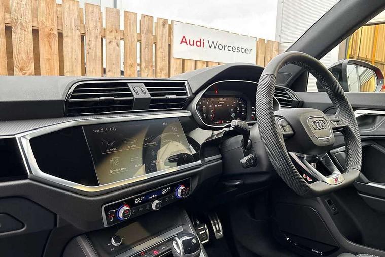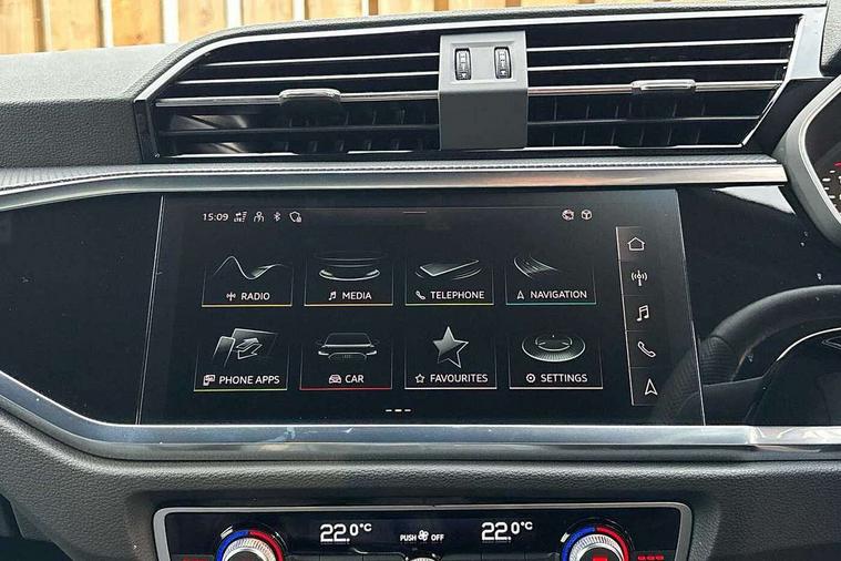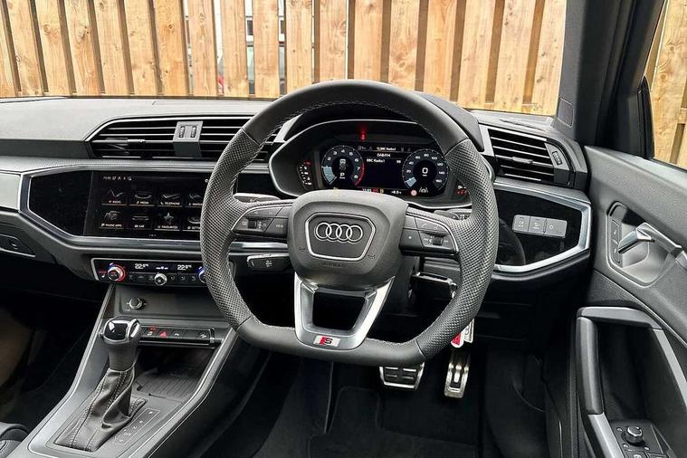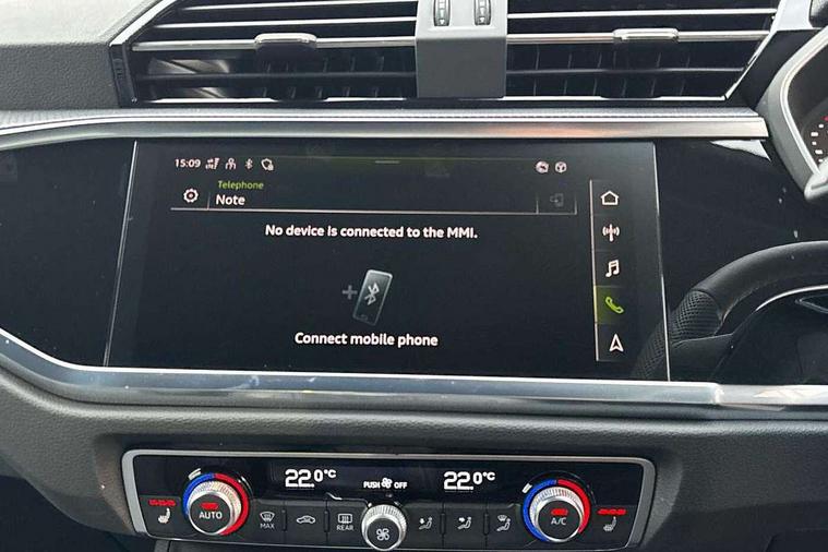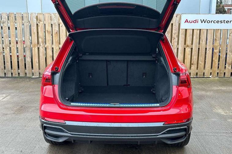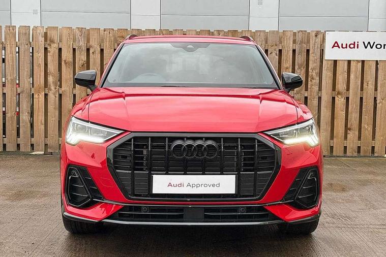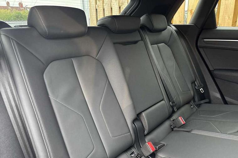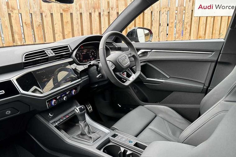Amazon alexa Integration, Audi connect safety and service, Audi drive select, Audi lane departure warning, Audi smartphone interface includes wireless Apple carplay/Android Auto, Audi Virtual Cockpit - 10.25" display, Bluetooth interface, Camera based traffic sign recognition, Distraction and Fatigue warning, Legal emergency call, MMI Navigation Plus with high resolution 10.1 inch touchscreen colour display, Power operated tailgate, Progressive steering, Service interval indicator, Start stop system with recuperation, Voice control system with natural language interaction, Sports suspension, 2 USB-C ports with charge and data functions, 6 passive loudspeakers, DAB digital radio module, Acoustic windscreen, Audi Beam uses LEDs to project the Audi logo onto the ground as you exit your Q3, Auto dimming door mirrors, Auto dimming frameless rear view mirror, Black roof rails, Electrically folding, adjustable and heated door mirrors with integrated LED side indicators and kerb view function for passenger side, Front and rear electric windows, Front fog lights, Grille vertical bars in aluminium silver/Matt, High gloss black finish B and C pillars, LED Dynamic rear indicators, LED headlights with LED daytime running lights, LED rear lights, LED third brake light, Privacy glass dark tinted rear and rear-side windows (from B-pillar backwards), Rain and light sensors, Rear diffuser grille in grained matt black, Rear diffuser strip in matt anthracite black, Rear side wing doors, Rear wiper, S line bumpers in contrasting Manhattan grey, Variable front intermittent wipers, 12V socket in rear centre console, 3 seat bench in 2nd row, 40:20:40 folding with manual adjustment for 60:40 forwards/backwards position and backrest angle, Adjustable rear seat bench/backrest with centre armrest and cupholder, Black cloth headlining, Dual zone electronic climate control, Electric lumbar support, Front and rear black floor mats with contrast stitching in rock grey, Front and rear headrests, Front centre armrest, Height and reach adjustable steering wheel, Illuminated door sill trims with S logo, ISOFIX child seat mounting for front passenger with airbag deactivation and outer rear seat including top tether attachment point for outer rear seats, Manual front seats with height adjustment, Perforated leather gearknob, Single front passenger seat, Stainless steel luggage compartment sill finisher, Stainless steel pedals, Twin leather upholstery with front sport seats + S embossing, Black styling pack - Q3, Non smoking pack - Q3, 3x3 point rear seatbelts, 6 airbags - Driver, front passenger, curtain and side windows, Audi pre-sense front with pedestrain and cyclist recognition, Electrically operated child locks on rear doors, Electromechanical parking brake, Electronic stabilisation control including ABS, ASR and EDL, Front seatbelt reminder, Hill descent control, Hill hold assist, Pre sense basic, Seatbelt monitoring, Tyre pressure warning, Warning triangle and first aid kit, Anti theft alarm, Anti theft wheel bolts, Immobiliser, Remote central locking, Aluminium look interior elements, Detail dashboard around MMI touch colour display in glass look, black with surround in aluminium look, Leatherette door armrest, Piano black inlay,