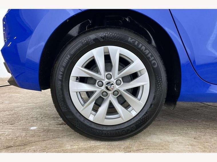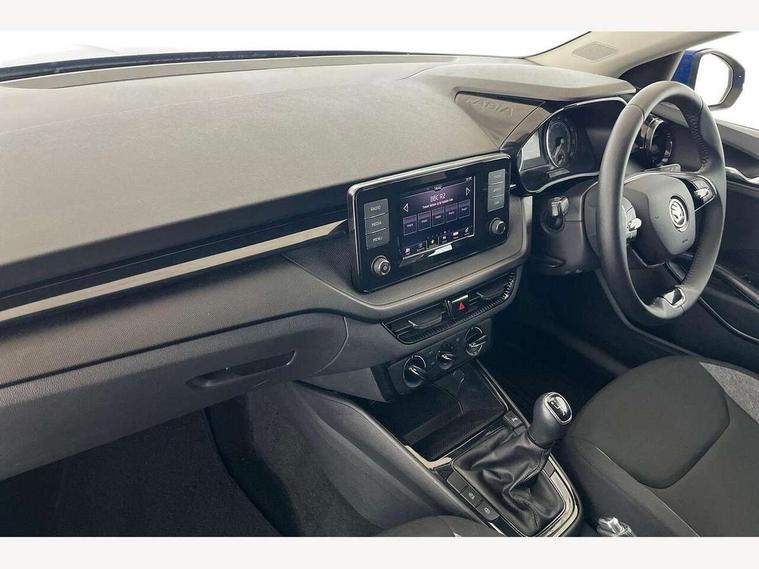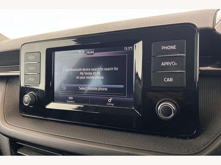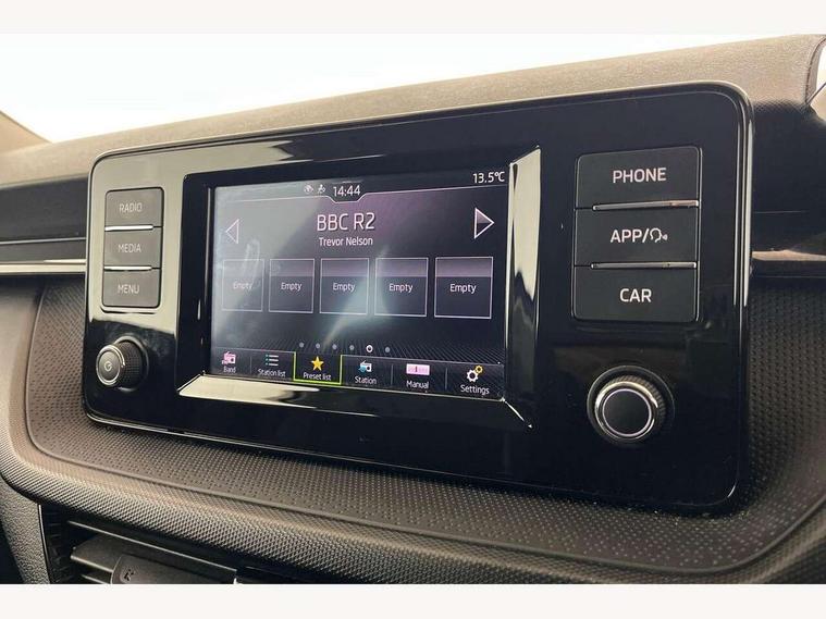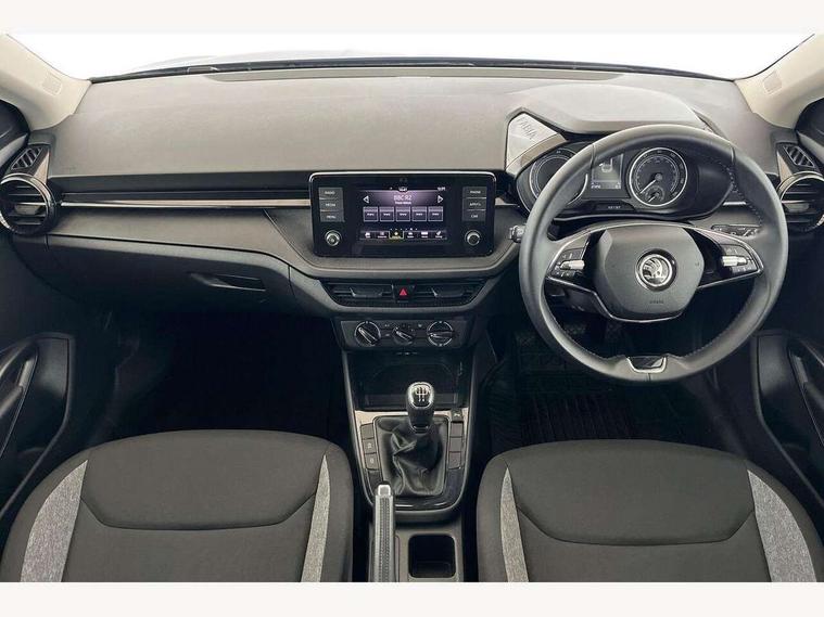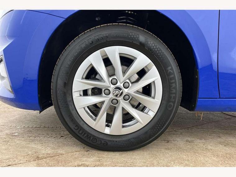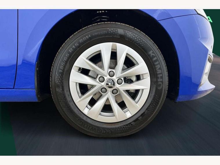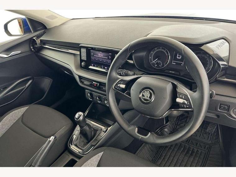 Bluetooth connection, Driver alert system - DAS, Electromechanical power steering, Exterior temperature gauge, Lane assist including road edge detection, Multifunction trip computer in black and white, Service interval indicator, Speed limiter, 2x USB-C in the front (for data transmission and charging), 4 speakers in front, Auxiliary socket for external MP3 player, DAB digital radio reception, Radio Swing with 6.5" colour display, Basic LED Headlights, Basic rear lights, Body colour door mirrors, Body coloured bumpers, Dimming rear view mirror with black frame, Door mirror integrated indicators, Electrically adjustable and heated door mirrors, Electrically adjustable front windows with function auto up/down, Front fog lights, Front window wiper intermittent control, Headlight range control - Automatic, Ice scraper in fuel cap, LED daytime running lights with coming and leaving home feature, Mechanical adjustable rear windows, Rain sensor, Rear LED fog light, Rear side wing doors, Rear window wiper with washing nozzles, Roof mounted spoiler, SKODA tailgate lettering in chrome, Third brake light, 2 reading lights in front and 2 reading lights in rear, 2 spoke leather multifunction steering wheel, 3 rear headrests, Backrest split and folding, Central console with fixed cup holder and storage box, Chrome handbrake release button, Fabric upholstery, Gearshift knob/handle in leather, Grain satin black interior door handles, Hand brake lever handle in leather, Height adjustable front headrests, Height adjustable front seats, Height adjustable steering wheel, ISOFIX and TopTether anchorage points to the outer rear seats, ISOFIX and TopTether on the front passenger seat, Luggage compartment lighting, Manual air conditioning, Manually adjustable lumbar support in front seats, Pollen filter, Rear seat bench unsplit, Single front passenger seat, Storm grey headlining, Sun visors with mirror and airbag label on passenger side, Ticket holder, 3-point height adjustable front seats belts with pretensioner and force limiter, Automatic warning lights in case of crash, Driver and passengers airbag with switch off function, e-Call+, ESC including ABS, MSR, ASR, EDS, HBA and XDS, Front and rear seat belt warning, FRONT ASSIST (AEB City and AEB Inter Urban), Front side airbags, Head airbags, One tone horn, Pedestrian protection, Three rear 3-points safety seat belts with pretensioner and force limiter including stop function for outer rear seat belts, Tyre pressure monitoring system, Anti-theft alarm system including immobiliser, interior monitoring, backup horn, and towing protection, Central locking with radio remote control, interior controls, SAFE function and 2 foldable keys, Black painted air vents, Glossy black decorative trim, Grain satin black central console cover, Grain satin black lower decorative trim, Satin black door and side trim panel in front, Anti-theft wheel bolts protection, Super-low rolling resistance tyres,