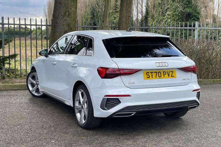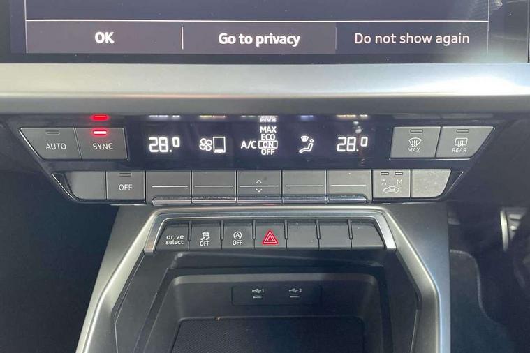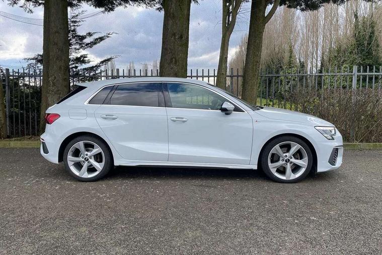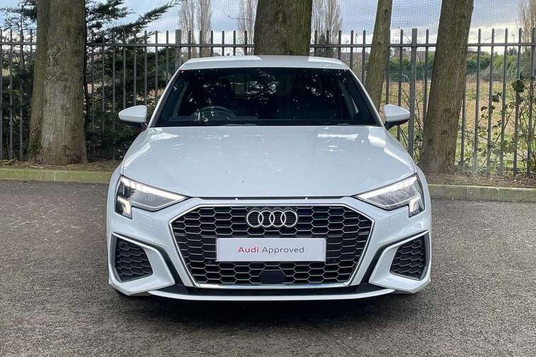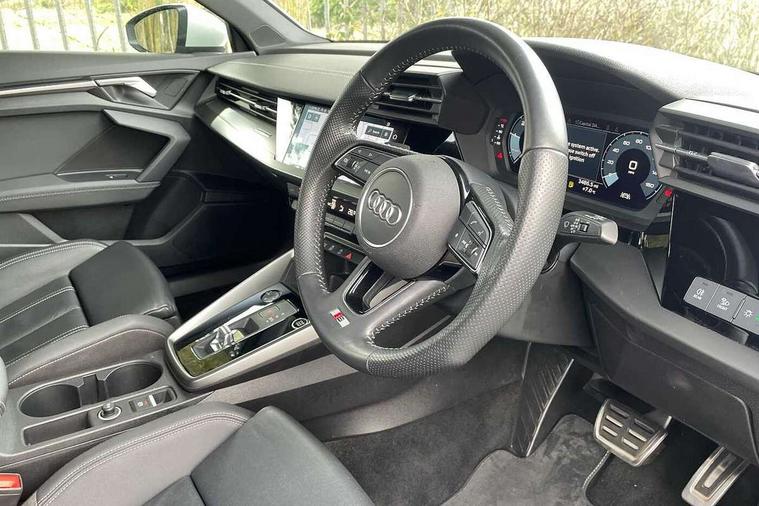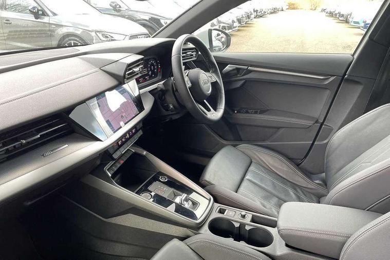 Audi connect emergency call and service, Audi drive select (Auto, Comfort, Dynamic, Efficiency and Individual), Audi smartphone interface, Audi Virtual Cockpit - 10.25" digital and colour instrument cluster, Automatic start/stop system with recuperation, Bluetooth interface, Collision avoidance assistant, Electromechanical power speed sensitive steering, Lane departure warning system, MMI Navigation Plus with high resolution 10.1" colour touch screen display, Service indicator, Trip computer, Voice control system with natural language interaction, 1xUSB-A and 1xUSB-C connection, 6 passive loudspeakers, DAB Digital radio, Acoustic glass windscreen, Aluminium window trim, Auto dimming frameless rear view mirror, Body colour exterior mirrors, Electrically adjustable/heated/folding/dimming door mirrors with kerb view includes integrated LED indications + kerb view function for passenger side, Front electric windows, Illuminated aluminium inserts front door sills with S logo, LED daytime running lights, Light and rain sensors, Privacy glass - dark tinted rear window, rear door and side windows, Rear electric windows, Rear side air outlets in grained matt black, Rear wiper, S line bumpers, S roof spoiler, 12V socket and storage compartment in front centre console, 40/20/40 split folding rear seat bench with cupholder, Black cloth headlining, Dual zone electronic climate control, Front and rear centre armrest in leather, Front and rear headrests, Front/rear floor mats, Height and reach adjustable steering wheel, Interior lighting - glove compartment light and right hand side, Luggage compartment floor covering, Manual boot compartment lid, Manually adjustable front seats, Seat side bolsters, Stainless steel pedals and front footrest, Twin leather upholstery with front sports seats S embossed logo, Aluminium interior elements pack - A3 Sportback, S line styling pack - A3 Sportback, 3x3 point rear seat belts, Driver and front passenger airbag with passenger airbag deactivation, Electronic Stabilisation Control (ESC) including ABS, ASR and EDL, First aid kit with warning triangle and 2 safety vests, Front side airbags with head airbags and interaction airbag, Hill hold assist, Pre-sense front with pedestrian and cyclist detection, Seatbelt monitoring, Tyre pressure loss indicator, Anti theft alarm, Anti-theft wheel bolts, Electronically operated child lock, Immobiliser, Remote control central locking, Accent surfaces in the dashboard and centre console in platinum grey silk effect paint finish, Dark spectrum aluminium inlays,