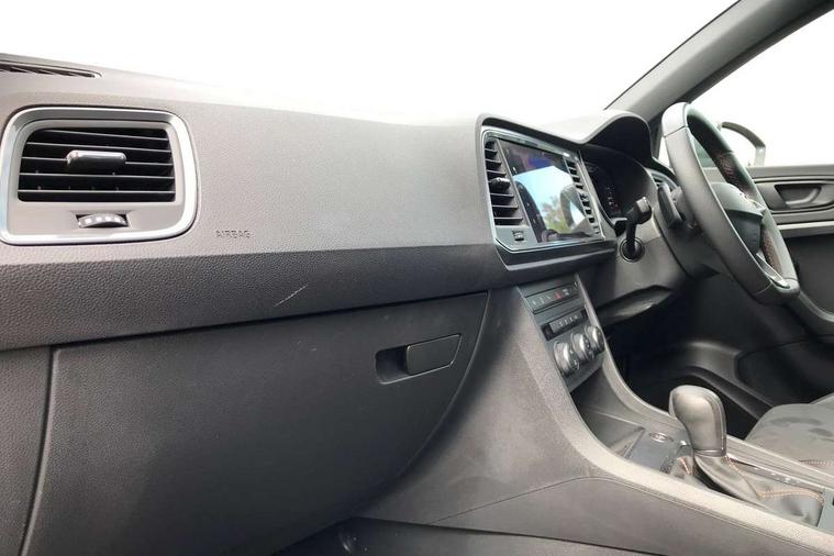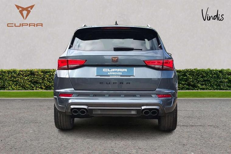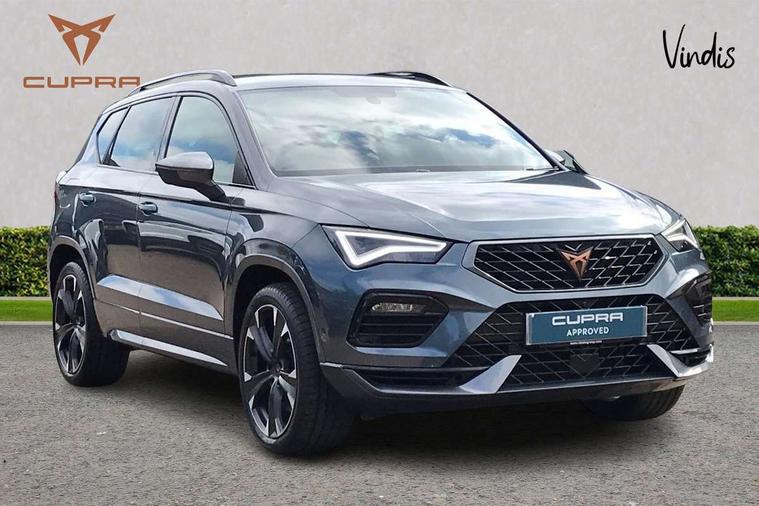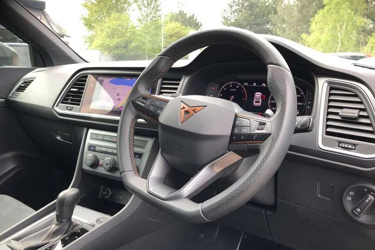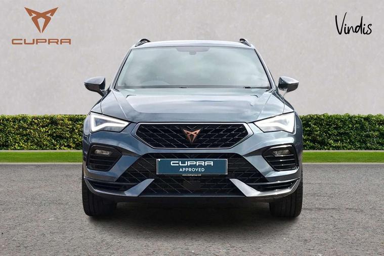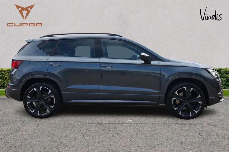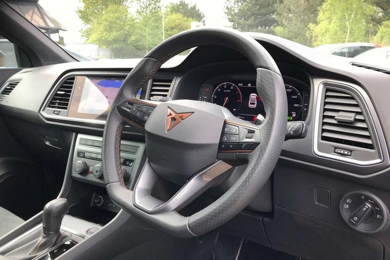 Cruise control system with speed limiter, Digital cockpit, Outside temperature gauge, Progressive power assisted steering, Rear view camera, SEAT drive profile CUPRA, Normal, Sport and Individual modes, steering/throttle response, gearshift mode, sound actuator and dynamic chassis control, Self parking functionality (includes front and rear parking sensors), Top view camera, Trip computer, Wireless full link smartphone integration, Wireless phone charger, CUPRA sport suspension, Steering wheel mounted audio/phone controls, Body colour bumpers with dark aluminium diffusor, Body coloured wheel arch surrounds, Dark tinted rear windows, Daytime running lights, Door mirrors with welcome CUPRA light silhouette, Dynamic headlight range control with self adjusting whilst driving, Electric adjustable/heated/folding door mirrors, Front and rear electric windows, Front frame grill in Dark aluminium brilliant, Full LED headlamps with lens and LED front fog lamps with cornering function, Gloss black door mirrors, Gloss black roof rails, Gloss black side mouldings, Gloss black side window trim, Illuminated aluminium front door sill, LED rear tail lights with dynamic indicators, Rear fog lights, Rear spoiler, Rear wash/wipe, Specific CUPRA design front bumper, Visible twin black exhaust pipes in both sides with dark aluminium diffuser, 12v socket in front, 60/40 split folding rear seat, Aluminium pedals, Dual zone climate control, Front and rear head restraints, Front bucket seats in Alcantara upholstery, Front centre armrest, Front seat back storage pockets, Height adjustable driver and passenger seat with lumbar adjustment, ISOFIX points in outer rear seats with top tether anchorage points, Leather steering wheel and gear knob, Multicoloured ambient lighting with LED interior illumination, Rear armrest and easy back seat release mechanism from boot, Steering wheel mounted gearshift paddles, Storage compartment in roof console for sunglass, Storage compartment under driver's seat, Convenience pack - Ateca, Interior lighting pack - Ateca, Navigation system plus pack - Cupra Ateca, 3x3 point rear seatbelts, ABS, Traction control system (TCS), Electronic stability control (ESC) and Electronic differential lock system (XDS), Airbags - Driver and front passenger airbag with deactivation, front side, two curtain and driver's knee airbags, Black brake callipers with CUPRA logo, Electric parking brake with auto hold function, Front and rear seatbelt reminder, Front assist with autonomous emergency braking, Hill hold control, Tiredness recognition system, Traction control, Tyre pressure monitoring system, Alarm, Keyless entry, Locking wheel bolts,
