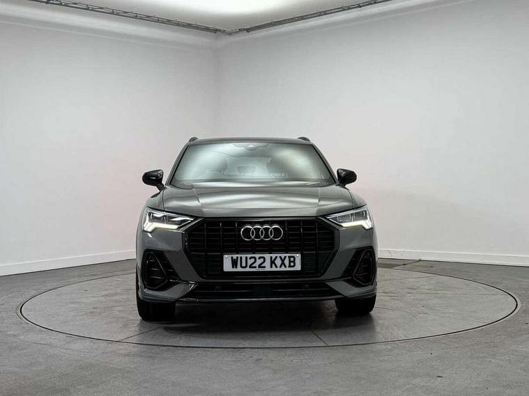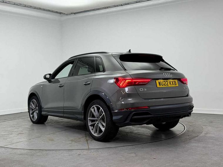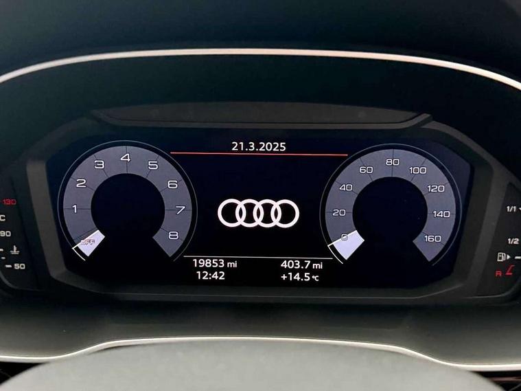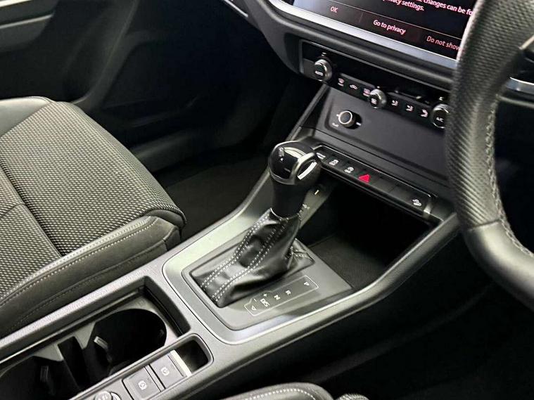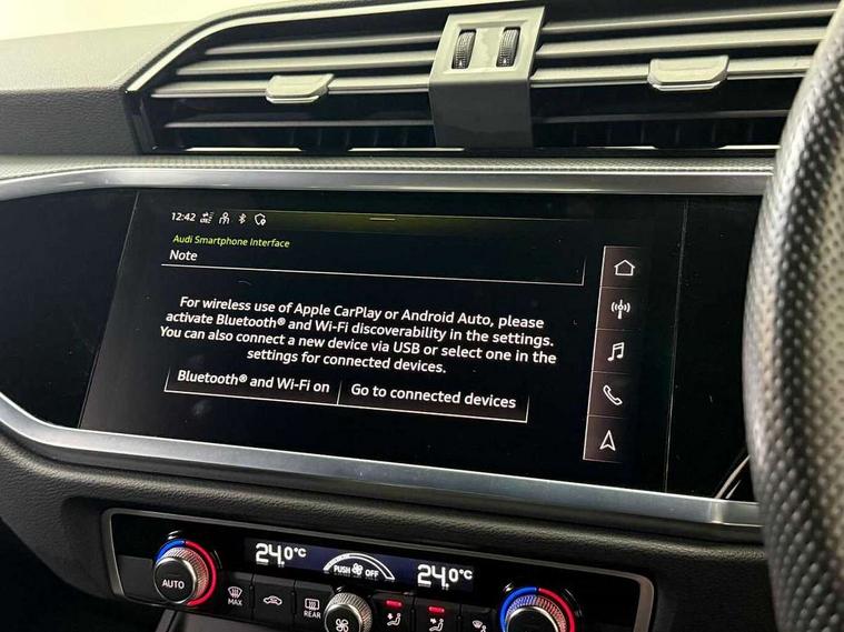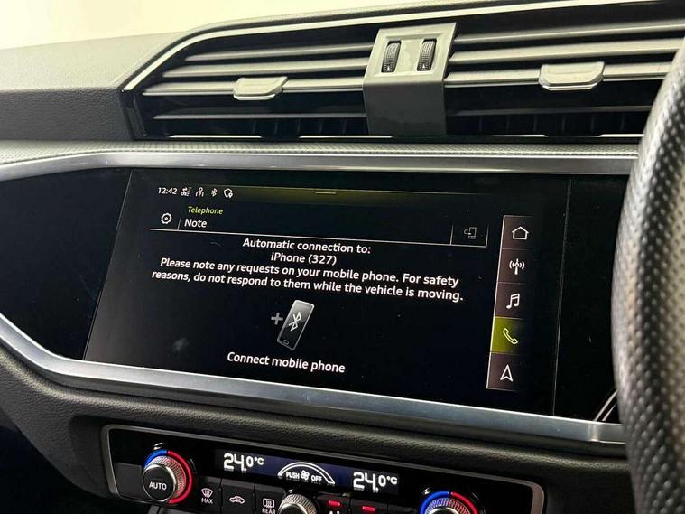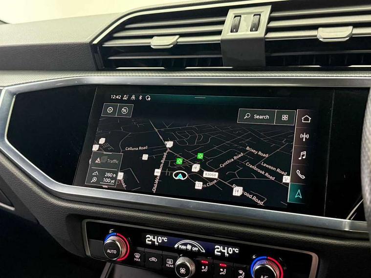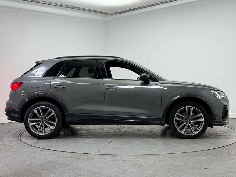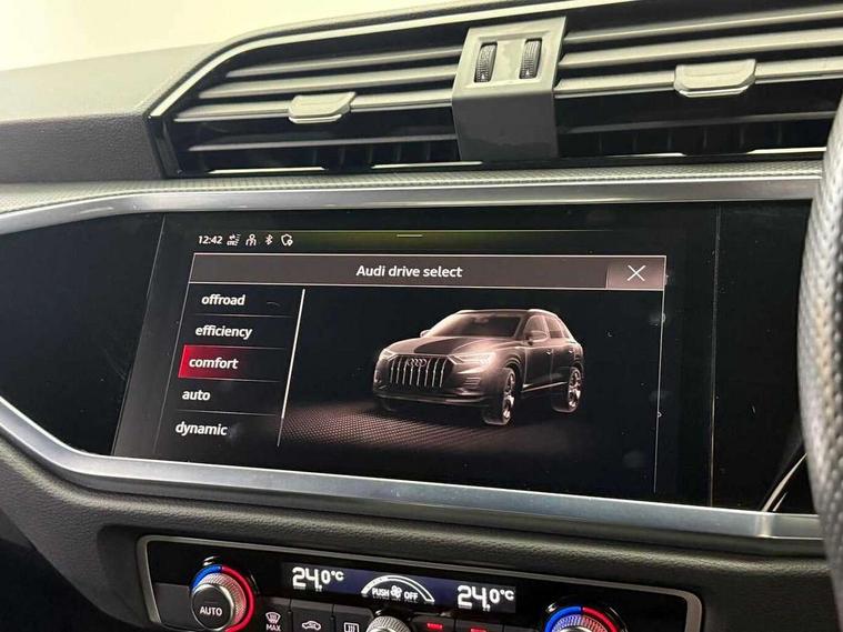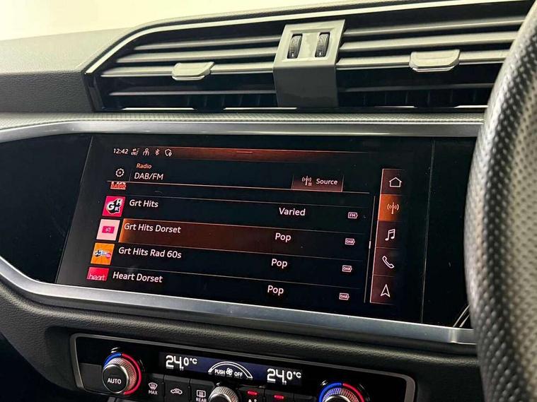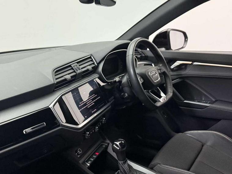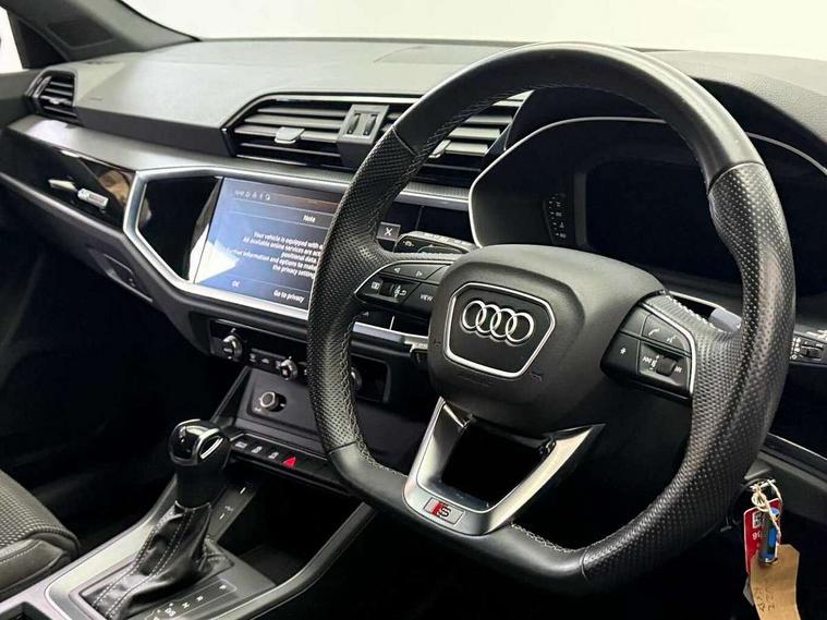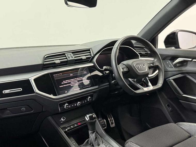 Amazon alexa Integration, Audi connect safety and service (e-call), Audi drive select, Audi lane departure warning, Audi smartphone interface includes wireless Apple carplay/Android Auto, Audi Virtual Cockpit - 10.25" display, Bluetooth interface, Camera based traffic sign recognition, MMI Navigation Plus with high resolution 10.1 inch touchscreen colour display, Power operated tailgate, Progressive steering, Service interval indicator, Start stop system with recuperation, Voice control system with natural language interaction, 48V Mild hybrid technology, Sports suspension, 2 USB-C ports with charge and data functions, 6 passive loudspeakers, DAB digital radio module, Acoustic windscreen, Auto dimming frameless rear view mirror, Black roof rails, Electrically folding, adjustable and heated door mirrors with integrated LED side indicators and kerb view function for passenger side, Front and rear electric windows, Front fog lights, Grille vertical bars in aluminium silver/Matt, High gloss black finish B and C pillars, LED headlights with LED daytime running lights and dynamic rear indicator, LED rear lights, Privacy glass dark tinted rear and rear-side windows (from B-pillar backwards), Rain and light sensors, Rear diffuser strip in matt titanium black, Rear side wing doors, Rear wiper, S line bumpers in contrasting Manhattan grey, Third brake light, Tinted rear windows, Variable front intermittent wipers, 12V socket in rear centre console, 3 seat bench in 2nd row, 40:20:40 folding with manual adjustment for 60:40 forwards/backwards position and backrest angle, Adjustable rear seat bench/backrest with centre armrest and cupholder, Black cloth headlining, Dual zone electronic climate control, Front and rear black floor mats with contrast stitching in rock grey, Front and rear headrests, Front and rear roof module including reading lights, Front centre armrest, Glove compartment lighting, Height and reach adjustable steering wheel, Illuminated door sill trims with S logo, ISOFIX child seat mounting for front passenger with airbag deactivation and outer rear seat including top tether attachment point for outer rear seats, Luggage compartment light, Manual front seats with height adjustment, Perforated leather gearknob, Single front passenger seat, Stainless steel luggage compartment sill finisher, Stainless steel pedals, Black styling pack - Q3, Non smoking pack - Q3, 3x3 point rear seatbelts, 6 airbags - Driver, front passenger, curtain and side windows, Audi pre-sense front with pedestrain and cyclist recognition, Electrically operated child locks on rear doors, Electromechanical parking brake, Electronic stabilisation control including ABS, ASR and EDL, Front seatbelt reminder, Hill descent control, Hill hold assist, Pre sense basic, Seatbelt monitoring, Tyre pressure warning, Warning triangle and first aid kit, Anti theft alarm, Anti theft wheel bolts, Immobiliser, Remote central locking, Detail dashboard around MMI touch colour display in glass look, black with surround in aluminium look, Leatherette door armrest, Piano black inlay, Tool kit, Tyre repair kit,