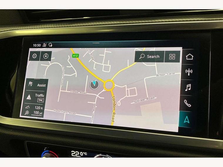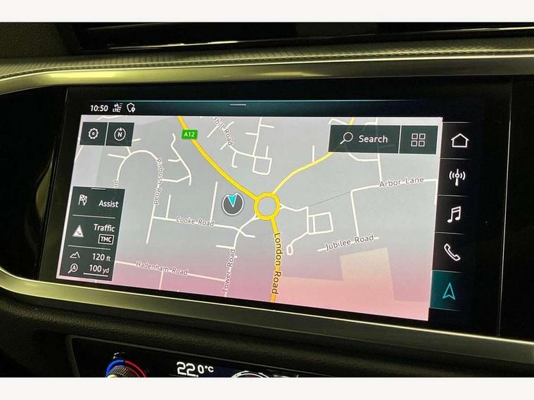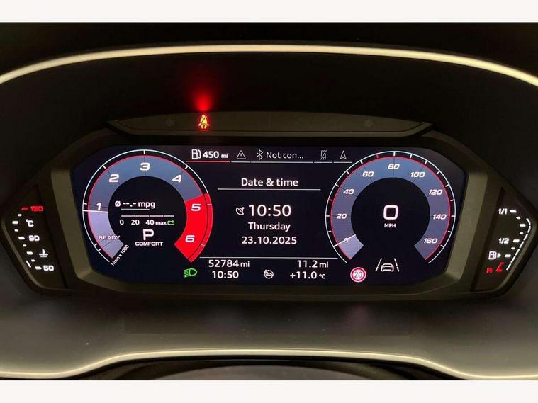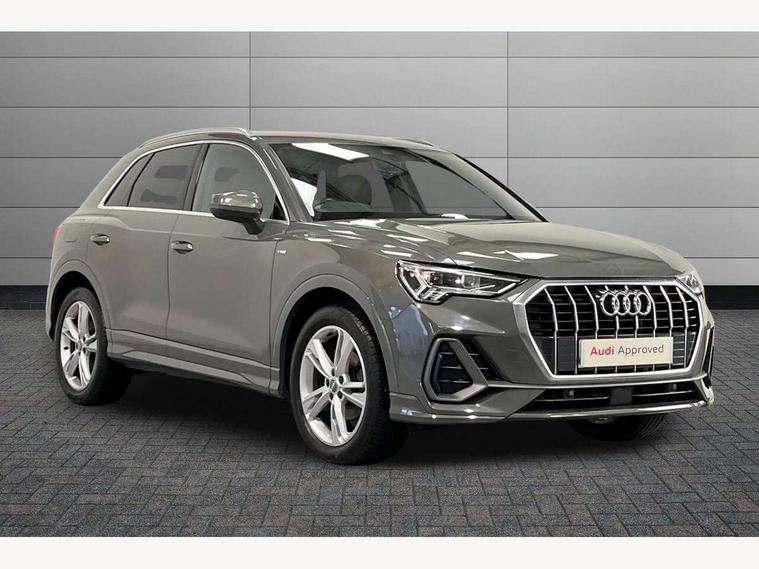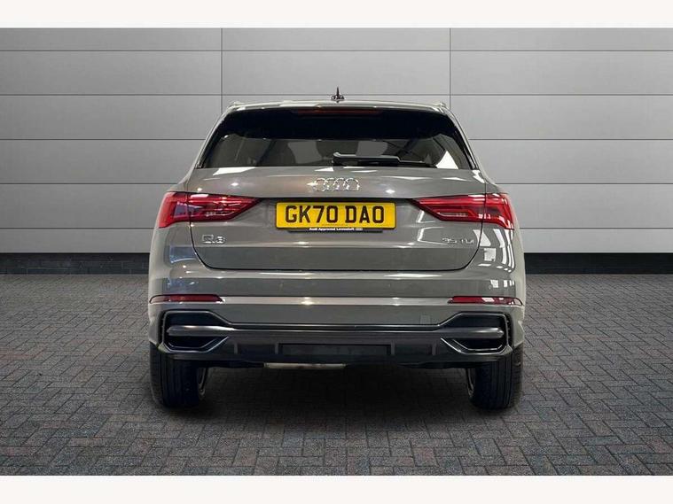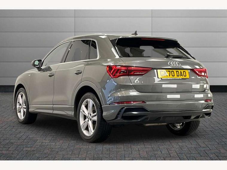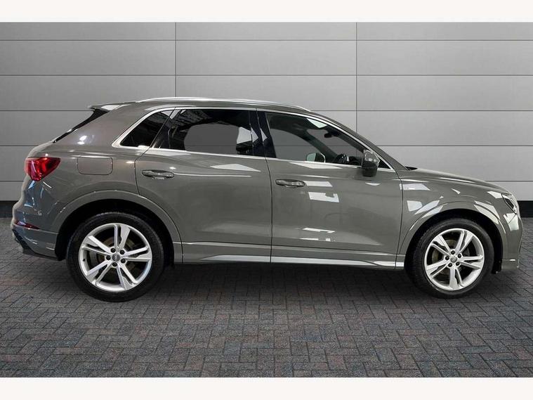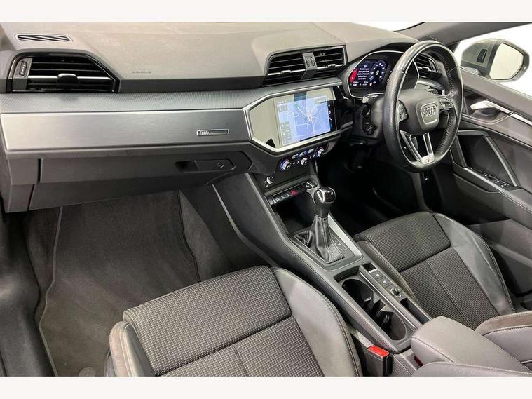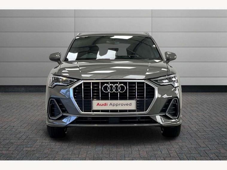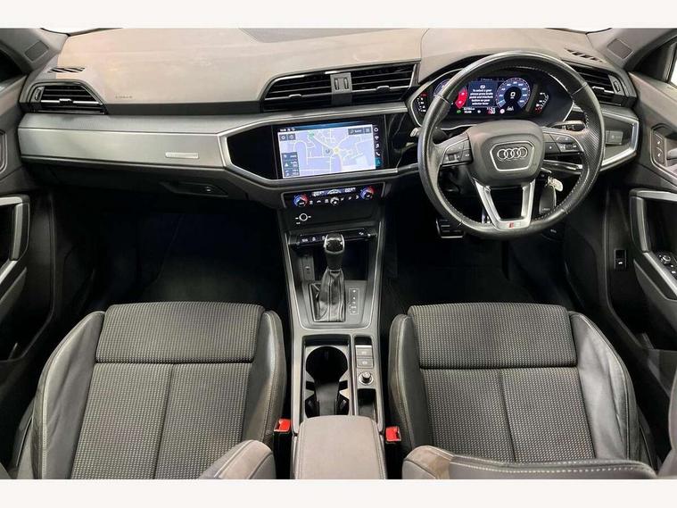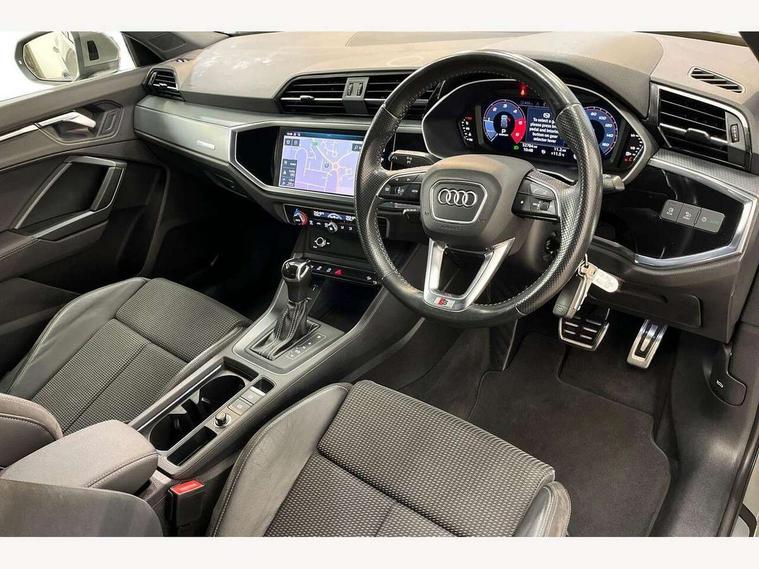 Audi connect safety and service (e-call), Audi drive select, Audi lane departure warning, Audi side assist, Audi smartphone interface includes wireless Apple carplay/Android Auto, Audi Virtual Cockpit - 10.25" display, Bluetooth interface, Camera based traffic sign recognition, MMI Navigation Plus with high resolution 10.1 inch touchscreen colour display, Power operated tailgate, Progressive steering, Service interval indicator, Start stop system with recuperation, Voice control system with natural language interaction, Diesel particulate filter, Sports suspension, 1 x USB type C and 1 USB type A charging points, 6 passive loudspeakers, DAB digital radio module, Acoustic windscreen, Aluminium roof rails, Aluminium window trim, Auto dimming frameless rear view mirror, Body coloured bumpers, Electrically folding, adjustable and heated door mirrors with integrated LED side indicators and kerb view function for passenger side, Front and rear electric windows, Front fog lights, Front side air inlets in matt platinum grey, Front spoiler blade in matt platinum grey, Grille vertical bars in aluminium silver/Matt, High gloss black finish B and C pillars, LED headlights with LED daytime running lights and dynamic rear indicator, LED rear lights, Privacy glass dark tinted rear and rear-side windows (from B-pillar backwards), Rain and light sensors, Rear diffuser strip in matt titanium black, S line badges on front wings, S Line front and rear bumpers, Side skirt insert in matt Platinium grey, Silver chrome grille surround, Titanium black radiator grille, 12V socket in rear centre console, 40:20:40 folding with manual adjustment for 60:40 forwards/backwards position and backrest angle, Adjustable rear seat bench/backrest with centre armrest and cupholder, Black cloth headlining, Dual zone electronic climate control, Front and rear black floor mats with contrast stitching in rock grey, Front and rear headrests, Front and rear roof module including reading lights, Front centre armrest, Glove compartment lighting, Height and reach adjustable steering wheel, Illuminated door sill trims with S logo, ISOFIX child seat mounting for front passenger with airbag deactivation and outer rear seat including top tether attachment point for outer rear seats, Luggage compartment light, Manual front seats with height adjustment, Perforated leather gearknob, Stainless steel luggage compartment sill finisher, Stainless steel pedals, Non smoking pack - Q3, 3x3 point rear seatbelts, 6 airbags - Driver, front passenger, curtain and side windows, Audi pre-sense front with pedestrain and cyclist recognition, Electrically operated child locks on rear doors, Electromechanical parking brake, Electronic stabilisation control including ABS, ASR and EDL, Hill descent control, Hill hold assist, Pre sense basic, Seatbelt monitoring, Tyre pressure warning, Warning triangle and first aid kit, Anti theft alarm, Anti theft wheel bolts, Remote central locking, Dark matt brushed aluminium inlay, Detail dashboard around MMI touch colour display in glass look, black with surround in aluminium look, Leatherette door armrest,