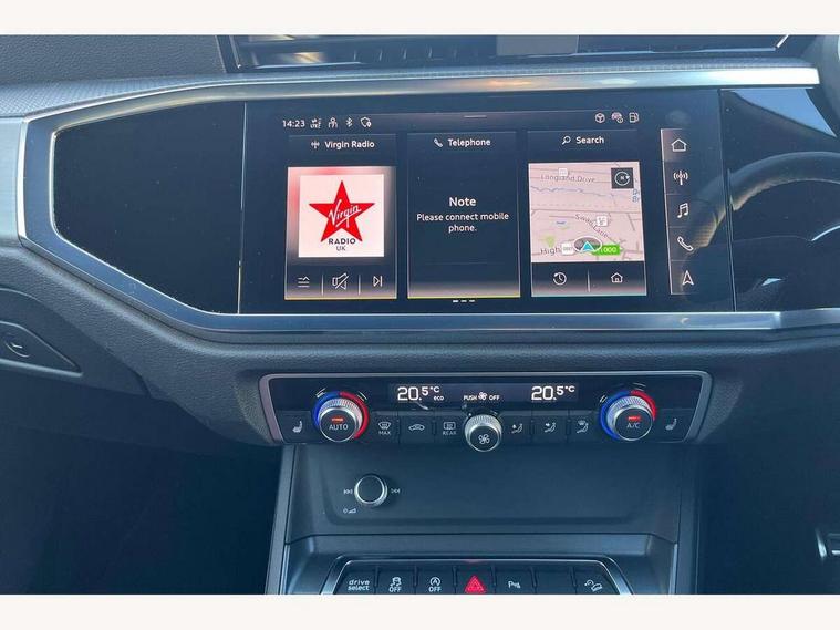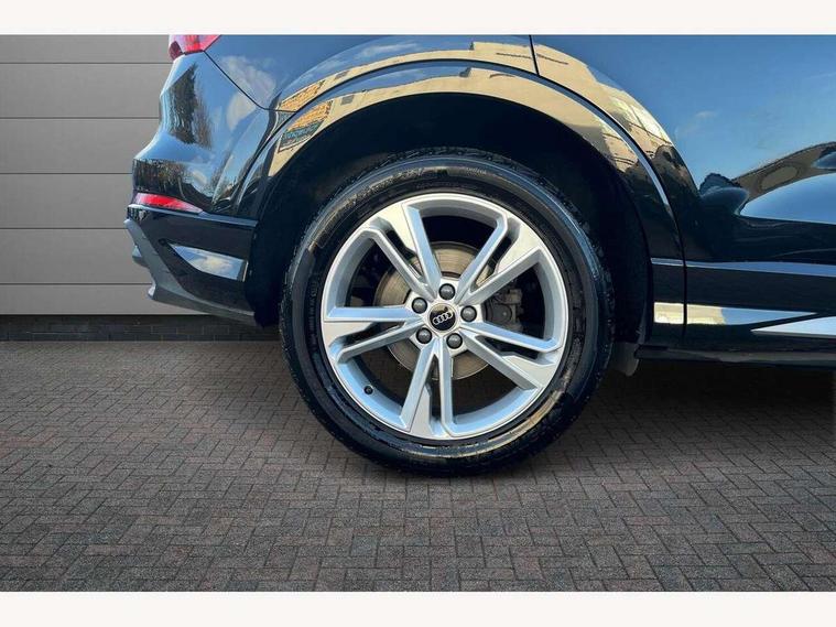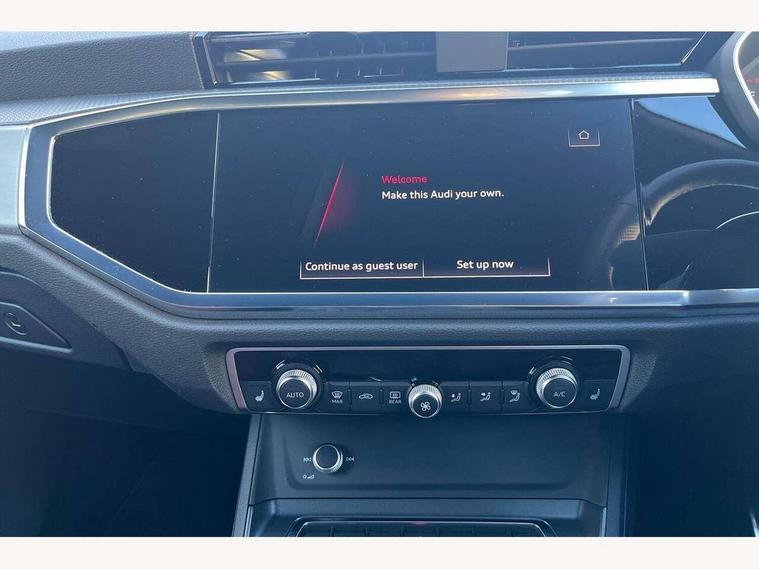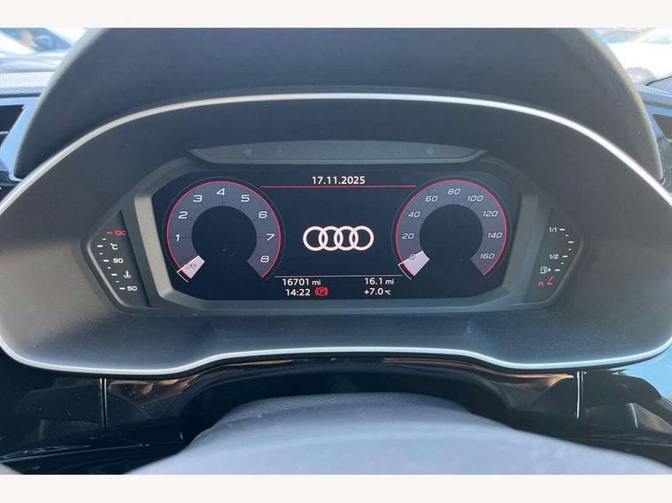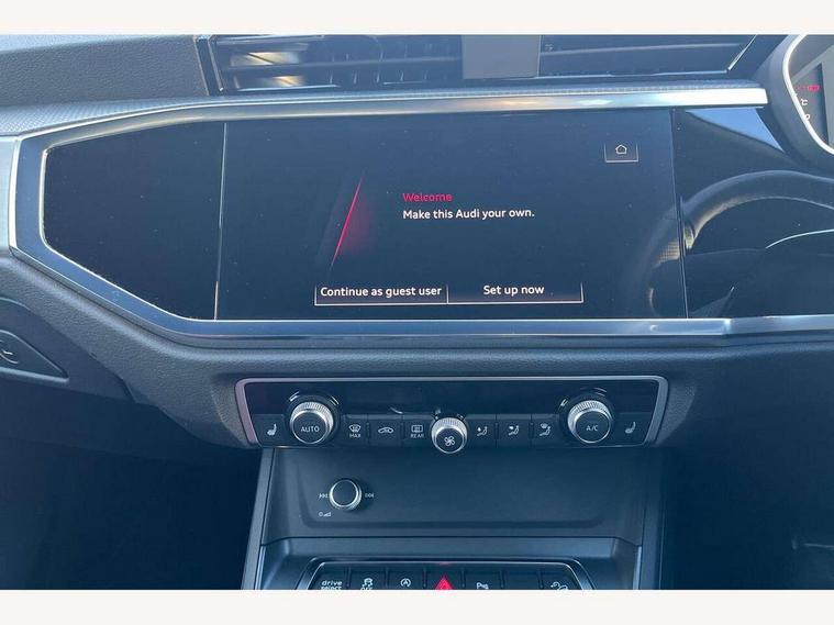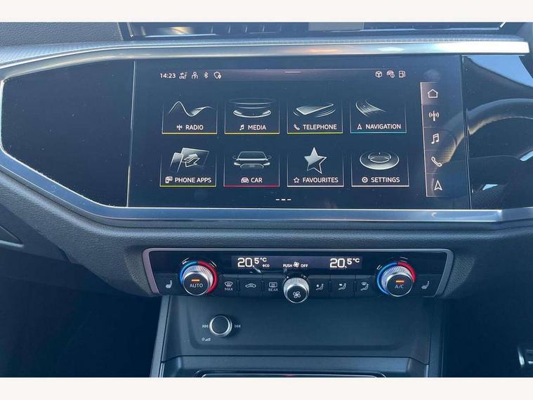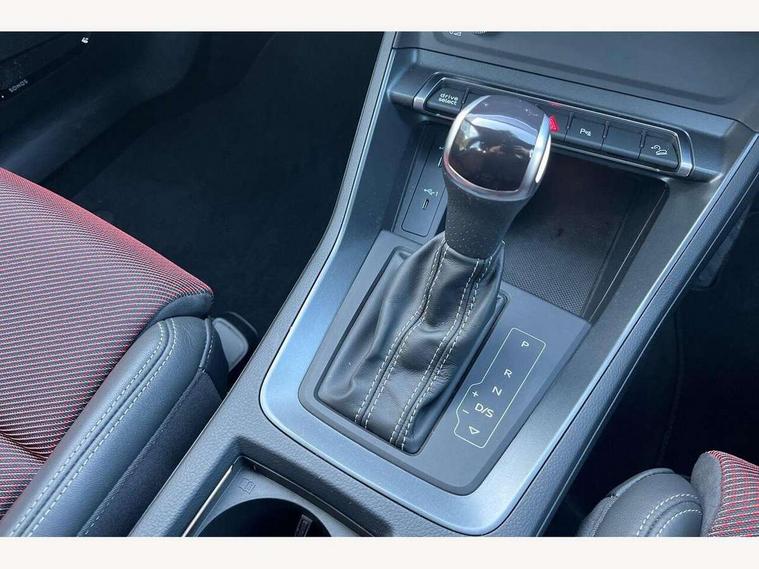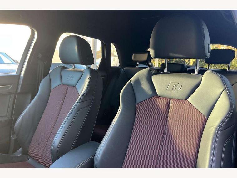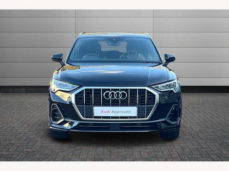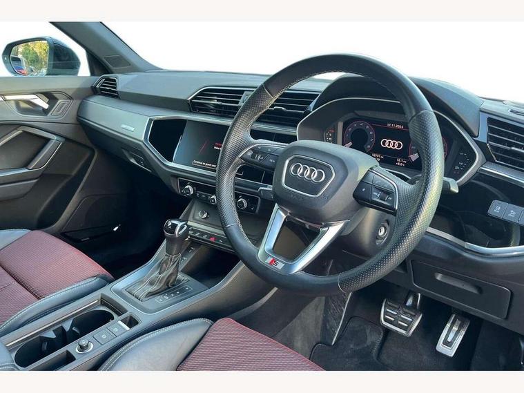 Amazon alexa Integration, Audi drive select, Audi lane departure warning, Audi smartphone interface includes wireless Apple carplay/Android Auto, Audi Virtual Cockpit - 10.25" display, Bluetooth interface, Camera based traffic sign recognition, Legal emergency call, MMI Navigation Plus with high resolution 10.1 inch touchscreen colour display, Power operated tailgate, Progressive steering, Service interval indicator, Start stop system with recuperation, Voice control system with natural language interaction, Sports suspension, 2 USB-C ports with charge and data functions, 6 passive loudspeakers, DAB digital radio module, Acoustic windscreen, Aluminium roof rails, Aluminium window trim, Anthracite black radiator grille, Auto dimming frameless rear view mirror, Body colour front spoiler blade, Body coloured bumpers, Electrically folding, adjustable and heated door mirrors with integrated LED side indicators and kerb view function for passenger side, Front and rear electric windows, Front fog lights, Front side air inlets in matt platinum grey, Grille vertical bars in aluminium silver/Matt, High gloss black finish B and C pillars, LED Dynamic rear indicators, LED headlights with LED daytime running lights, LED rear lights, LED third brake light, Privacy glass dark tinted rear and rear-side windows (from B-pillar backwards), Rain and light sensors, Rear diffuser grille in grained matt black, Rear diffuser strip in matt anthracite black, Rear side wing doors, Rear wiper, S line badges on front wings, S Line front and rear bumpers, Side skirt insert in matt Platinium grey, Variable front intermittent wipers, 12V socket in rear centre console, 3 seat bench in 2nd row, 3 spoke leather multifunction steering wheel features S badging and grips in perforated leather with contrast stitching, 40:20:40 folding with manual adjustment for 60:40 forwards/backwards position and backrest angle, Adjustable rear seat bench/backrest with centre armrest and cupholder, Black cloth headlining, Dual zone electronic climate control, Front and rear black floor mats with contrast stitching in rock grey, Front and rear headrests, Front and rear roof module including reading lights, Front centre armrest, Glove compartment lighting, Height and reach adjustable steering wheel, Illuminated door sill trims with S logo, ISOFIX child seat mounting for front passenger with airbag deactivation and outer rear seat including top tether attachment point for outer rear seats, Luggage compartment light, Manual front seats with height adjustment, Perforated leather gearknob, Single front passenger seat, Stainless steel luggage compartment sill finisher, Stainless steel pedals, Ambient lighting pack - Q3, Non smoking pack - Q3, 3x3 point rear seatbelts, 6 airbags - Driver, front passenger, curtain and side windows, Audi pre-sense front with pedestrain and cyclist recognition, Electrically operated child locks on rear doors, Electromechanical parking brake, Electronic stabilisation control including ABS, ASR and EDL, Front seatbelt reminder, Hill descent control, Hill hold assist, Pre sense basic, Seatbelt monitoring, Tyre pressure warning, Warning triangle and first aid kit, Anti theft alarm, Anti theft wheel bolts, Immobiliser, Remote central locking, Aluminium look interior elements, Dark matt brushed aluminium inlay, Detail dashboard around MMI touch colour display in glass look, black with surround in aluminium look, Leatherette door armrest,