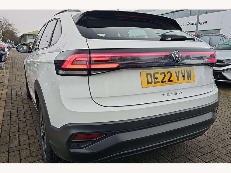 App-Connect including App-Connect Wireless, Driver alert system, e-Call (emergency call), Power Steering, Travel assist including emergency assist, Washer fluid level indicator, Wireless Charging including Bluetooth, Start-stop system with battery regeneration (recuperation - energy recovery during braking), Digital radio reception (DAB+), Diversity antenna for FM reception, WeConnect plus, Ambient lighting with logo projection, Aspherical driver's exterior mirror, Auto headlights, Body coloured bumpers, Body coloured exterior mirror housings and door handles, Electric windows, External USB type C socket and charging sockets, Front fog lamps with cornering function, Headlight range control, Heat insulating glass windscreen, LED headlamps, LED rear combination lamp, LED third brake light, Left convex exterior mirror, Power folding adjustable/heated exterior mirrors and front passenger exterior mirror lowering function, Rear fog light on one side, reversing light on both sides, Rear side wing doors, Rear wash/wipe with intermittent wipe setting, 'Slash/ Austin' Cloth upholstery, 12V socket in centre console, 2 front reading lights, 3 rear head restraints, 3 seat bench in 2nd row, Black carpets, Child seat anchor for child seat system i-Size, 2x top tether and child seat anchor in front on front passenger side, Door and side trim panels in titan black, Driver and front passenger seat height adjustment, Front centre armrest, Handbrake lever handle in leather, Height and reach adjustable steering wheel, Leather trimmed gear knob, Leather wrapped multifunction steering wheel, Luggage compartment floor, Luggage compartment light, Lumbar support for driver's and front passengers seat, Seat covers in titanium black, Single front passenger seat, Split folding backrest with centre armrest and unsplit rear seat bench, Storage compartment under front seats, Sun visors with illuminated vanity mirrors, Chrome Package - Taigo, Drivers assistance pack - Taigo, Light and Sight pack including High beam assist - Taigo, 2 x 3-point seatbelts/outer rear seats with ECE label, 3-point seat belts in front with pretensioner and height adjustment, 3-point seatbelt for centre rear seat, Driver and front passenger airbags with front passenger airbag de-activation, front side and curtain airbags, Driver and front passenger safety-optimised head restraints, Electronic stability control, Extended and predictive pedestrian/ cyclist protection, Front and rear disc brakes, Front curtain and side airbags with center airbag, Hill start assist, Manual rear child locks, Single tone horn, Tyre pressure loss indicator, Anti-theft alarm system with interior monitoring, backup horn, and towing protection, Anti-theft wheel bolts, Lava stone black gloss/matt decorative inserts in dash and front door panels, Low rolling resistance tyres,