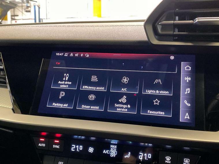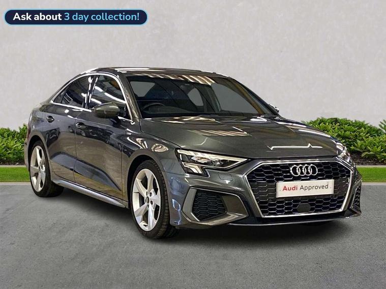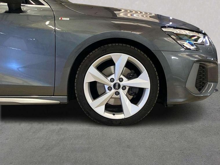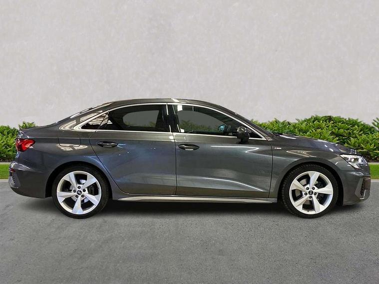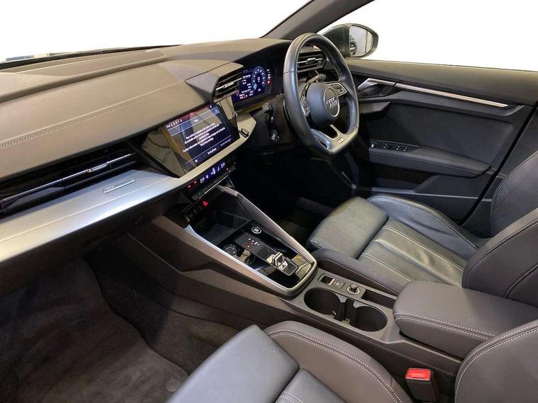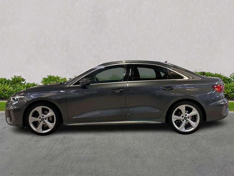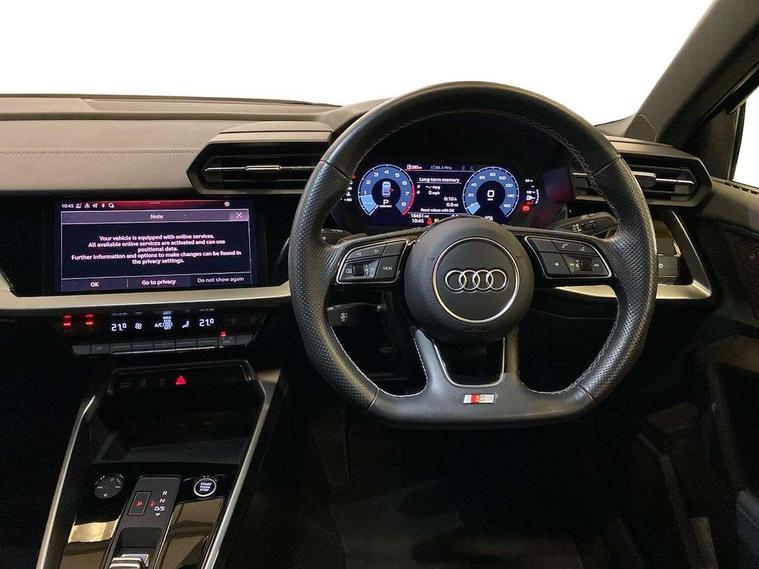 Audi connect emergency call and service, Audi drive select (Auto, Comfort, Dynamic, Efficiency and Individual), Audi smartphone interface, Audi Virtual Cockpit - 10.25" digital and colour instrument cluster, Automatic start/stop system with recuperation, Bluetooth interface, Collision avoidance assistant, Electromechanical power speed sensitive steering, Lane departure warning system, MMI Navigation Plus with high resolution 10.1" colour touch screen display, Service indicator, Voice control system with natural language interaction, 1xUSB-A and 1xUSB-C connection, 6 passive loudspeakers, CD player, DAB Digital radio, Acoustic glass windscreen, Aluminium window trim, Auto dimming frameless rear view mirror, Body colour exterior mirrors, Electrically adjustable/heated/folding/dimming door mirrors with kerb view includes integrated LED indications + kerb view function for passenger side, Front electric windows, Illuminated door sills with aluminium inserts at the front with S logo, LED daytime running lights, Light and rain sensors, Model and engine designation badges at rear, Privacy glass - dark tinted rear window, rear door and side windows, Rear electric windows, S line bumpers, S roof spoiler, 12V socket and storage compartment in front centre console, 40/20/40 split folding rear seat bench with cupholder, Black cloth headlining, Dual zone electronic climate control, Front and rear centre armrest in leather, Front and rear headrests, Front/rear floor mats, Height and reach adjustable steering wheel, Interior lighting - glove compartment light and right hand side, Luggage compartment floor covering, Manual boot compartment lid, Manually adjustable front seats, Seat side bolsters, Stainless steel pedals and front footrest, Twin leather upholstery with front sports seats S embossed logo, Aluminium interior elements pack - A3 Saloon, S line styling pack - A3 Saloon, 3x3 point rear seat belts, Driver and front passenger airbag with passenger airbag deactivation, Electronic Stabilisation Control (ESC) including ABS, ASR and EDL, First aid kit with warning triangle and 2 safety vests, Front side airbags with head airbags and interaction airbag, Hill hold assist, Pre-sense front with pedestrian and cyclist detection, Seatbelt monitoring, Tyre pressure loss indicator, Anti theft alarm, Anti-theft wheel bolts, Electronically operated child lock, Immobiliser, Remote control central locking, Aluminium air vent surrounds, Aluminium trim elements, Dark spectrum aluminium inlays, accent surfaces in the dashboard and centre console in platinum grey silk effect paint finish,