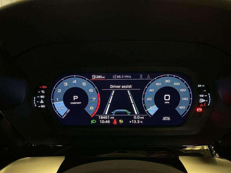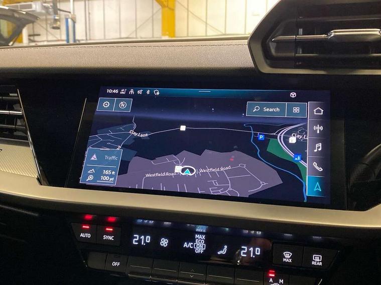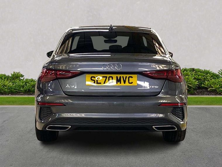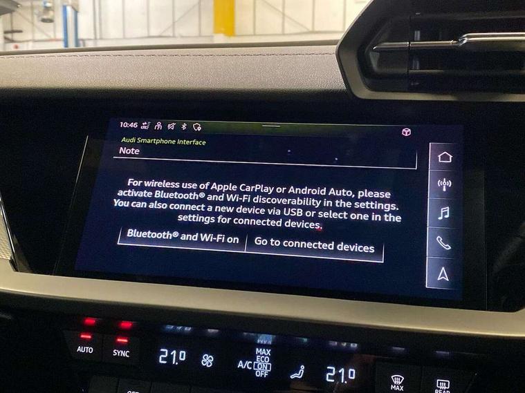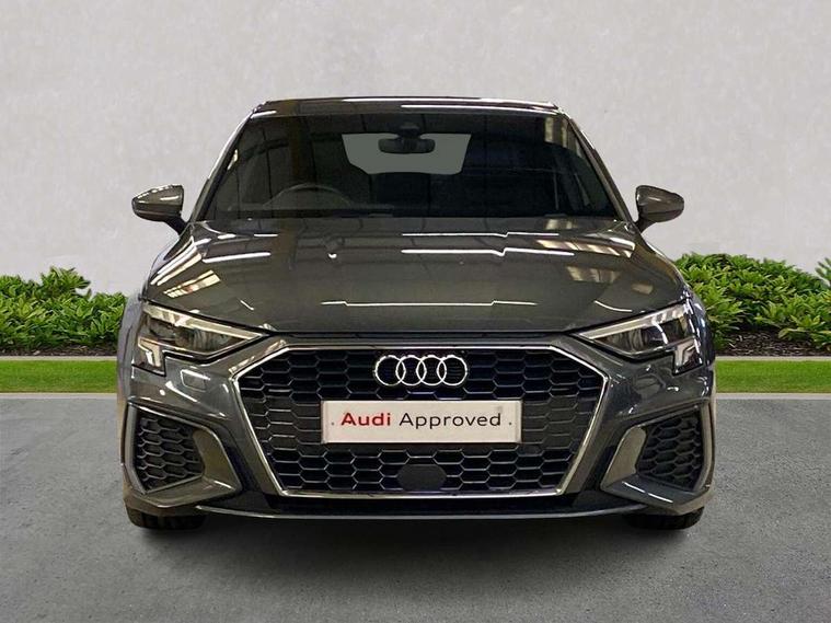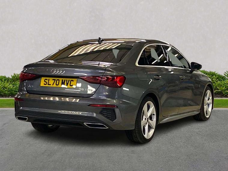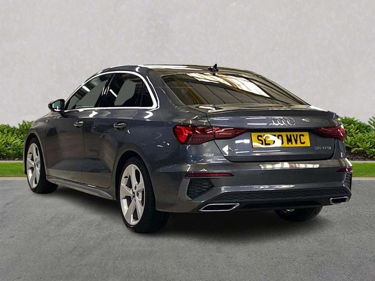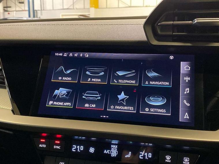 Audi connect emergency call and service, Audi drive select (Auto, Comfort, Dynamic, Efficiency and Individual), Audi smartphone interface, Audi Virtual Cockpit - 10.25" digital and colour instrument cluster, Automatic start/stop system with recuperation, Bluetooth interface, Collision avoidance assistant, Electromechanical power speed sensitive steering, Lane departure warning system, MMI Navigation Plus with high resolution 10.1" colour touch screen display, Service indicator, Voice control system with natural language interaction, 1xUSB-A and 1xUSB-C connection, 6 passive loudspeakers, CD player, DAB Digital radio, Acoustic glass windscreen, Aluminium window trim, Auto dimming frameless rear view mirror, Body colour exterior mirrors, Electrically adjustable/heated/folding/dimming door mirrors with kerb view includes integrated LED indications + kerb view function for passenger side, Front electric windows, Illuminated door sills with aluminium inserts at the front with S logo, LED daytime running lights, Light and rain sensors, Model and engine designation badges at rear, Privacy glass - dark tinted rear window, rear door and side windows, Rear electric windows, S line bumpers, S roof spoiler, 12V socket and storage compartment in front centre console, 40/20/40 split folding rear seat bench with cupholder, Black cloth headlining, Dual zone electronic climate control, Front and rear centre armrest in leather, Front and rear headrests, Front/rear floor mats, Height and reach adjustable steering wheel, Interior lighting - glove compartment light and right hand side, Luggage compartment floor covering, Manual boot compartment lid, Manually adjustable front seats, Seat side bolsters, Stainless steel pedals and front footrest, Twin leather upholstery with front sports seats S embossed logo, Aluminium interior elements pack - A3 Saloon, S line styling pack - A3 Saloon, 3x3 point rear seat belts, Driver and front passenger airbag with passenger airbag deactivation, Electronic Stabilisation Control (ESC) including ABS, ASR and EDL, First aid kit with warning triangle and 2 safety vests, Front side airbags with head airbags and interaction airbag, Hill hold assist, Pre-sense front with pedestrian and cyclist detection, Seatbelt monitoring, Tyre pressure loss indicator, Anti theft alarm, Anti-theft wheel bolts, Electronically operated child lock, Immobiliser, Remote control central locking, Aluminium air vent surrounds, Aluminium trim elements, Dark spectrum aluminium inlays, accent surfaces in the dashboard and centre console in platinum grey silk effect paint finish,