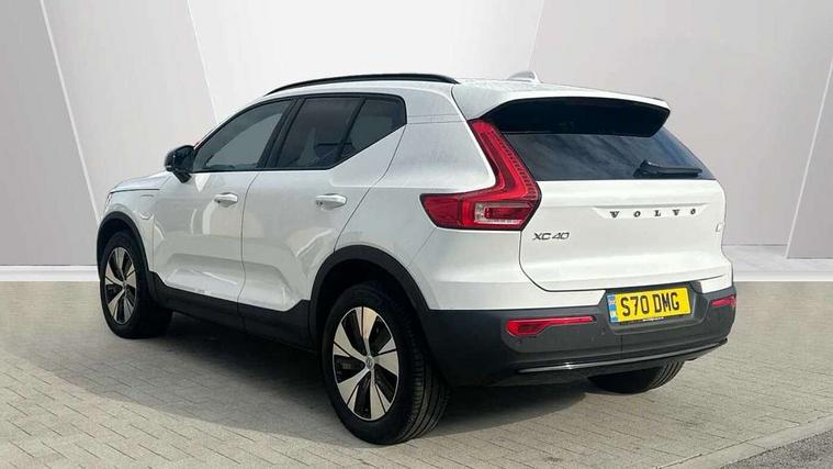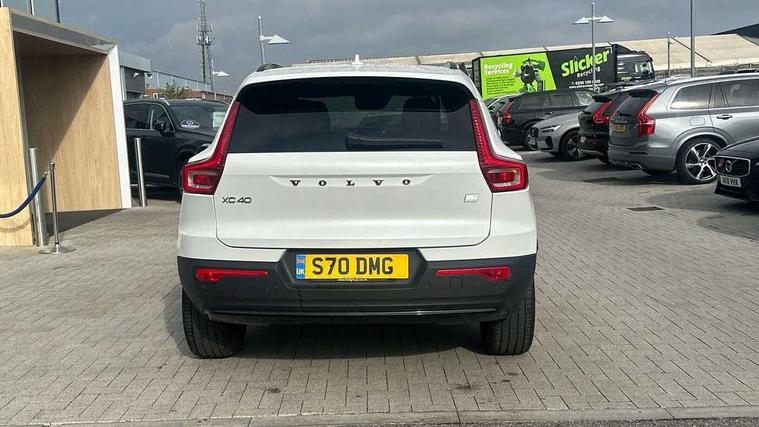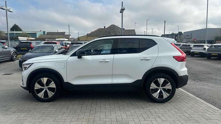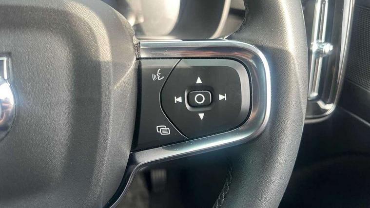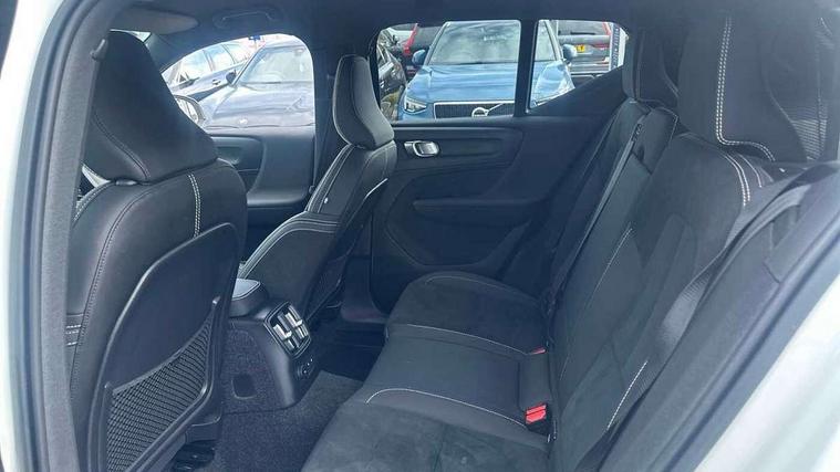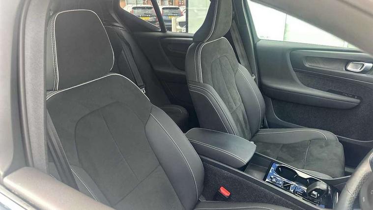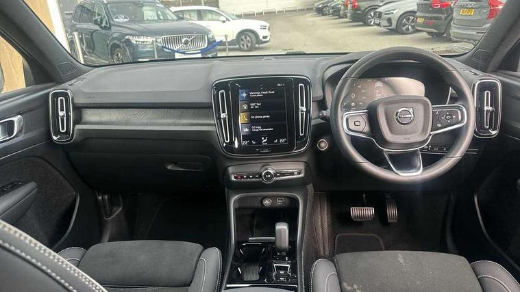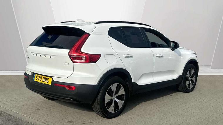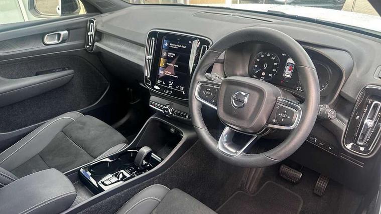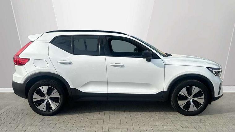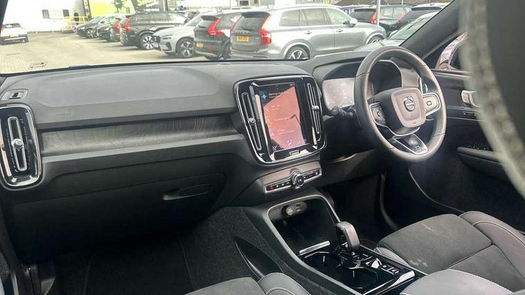12.3" Active TFT crystal driver's instrument display, 9" centre console portrait touch screen, Adjustable steering wheel force, Bluetooth hands free telephone kit, Drive mode selector, E-call, eCall emergency call system, Front park assist, Hands free power tailgate, Lane keep assist with driver alert control, Oncoming Lane Mitigation, Rear park assist, Sensus navigation with European mapping and traffic information, Speed limiter, Speed sensitive steering, Voice activated control for key functions, Wireless Smartphone Integration includes Apple CarPlay and Android auto, Wireless/Inductive Mobile Phone Charging, 3.7 kW monophase on board charger, 7m 10amp charge cable with 3 pin plug and 7m 1 phase 16amp type 2/mode 3 charge cable, Dynamic chassis, Electric front axle drive, Recharging port located in nearside front wing, DAB Digital radio, Low speed exterior sound speaker, Sensus connect with high performance sound, 8 speakers/250W, front USB and 2 rear type C USB, Steering wheel mounted remote controls, Adaptive brake lights with high level LED brake lights, Auto dimming interior mirror, Automatic headlamp levelling, Automatic LED Headlights + Active high beam incorporating daytime running lights, Front and rear electric windows, Front recharge aluminium tread plates, High gloss black front and rear skid plate, High gloss black mesh front grille with high gloss black surround, High gloss black window trim, Home safe and approach lighting, Integrated roof rails in high gloss black, LED front fog lights, Puddle lights, Rain sensor with automatic windscreen wiper activation, Rear side wing doors, Rear wiper, Roof antenna, Roof spoiler, Visible VIN plate, 12V socket in front tunnel console and cargo compartment, 2 zone electronic climate control with clear zone air quality system and pollen filter, 3 seat bench in 2nd row, 3 Spoke tailored steering wheel with chrome trim, 60/40 versatile split folding rear seat, A-pillar parking ticket holder, Ambient front door and instrumental panel lighting, C-pillar Recharge logo, Centre console cupholders and storage, Floor mats, Front door pocket and front cupholder illumination, Front footwell illumination, Front headrests, Front reading light and theatre lighting, Front seat cushion extensions, Front tunnel pocket, Glovebox bag hook, Height adjustable passenger seat, Height/reach adjustable steering column, High gloss centre tunnel deco, Illuminated glovebox, Illuminated luggage compartment, Illuminated tailgate, Illuminated vanity mirrors, Isofix attachments on rear seats, Load protection net, Multi directional lumbar support, Power driver seat with memory + exterior mirrors memory, Rear armrest / integral cup holders / storage tray, Rear headrests, Rear reading and courtesy lights, Single front passenger seat, Underfloor cargo storage, Climate pack - XC40, 3x3 point rear seatbelts, City safety includes pedestrian, cyclist and large animal detection and front collision warning with full auto brake, Drivers knee airbag, Dual stage driver/passenger airbags, Electronic parking brake with auto hold, First aid kit, Front and outer rear seatbelt reminder and pretensioners, Front seats SIPS airbags, Hill descent control, Hill start assist, Inflatable curtain, Passenger airbag cut-off device, Power child locks on rear doors, Road sign information display, Run off Road Mitigation, Run off Road Protection, SIPS (Side Impact Protection System), Slippery road and hazard light alert, Stability and Traction Control with Spin control, Engine Drag Control and Corner Traction Control, Tyre pressure monitoring system, Vehicle deceleration control with Anti-lock Brake System, Electronic Brake Distribution and Emergency Brake Assist, Warning triangle, WHIPS whiplash protection system - front, Anti-theft alarm including immobiliser/volume sensor + level sensor, Care key with user defined top speed, Key integrated remote control central locking + fuel flap with deadlocking system and auto open/close power windows, Keyless drive includes keyless entry and keyless start, Locking wheel nuts, Private locking for tailgate,