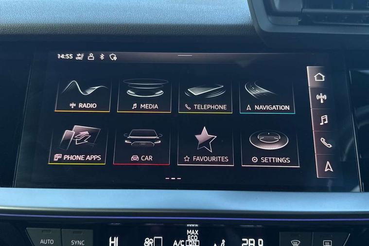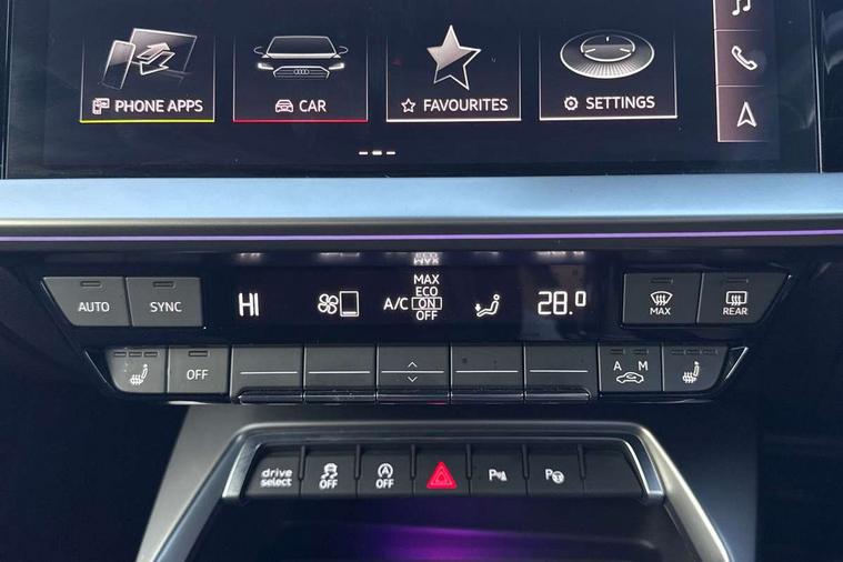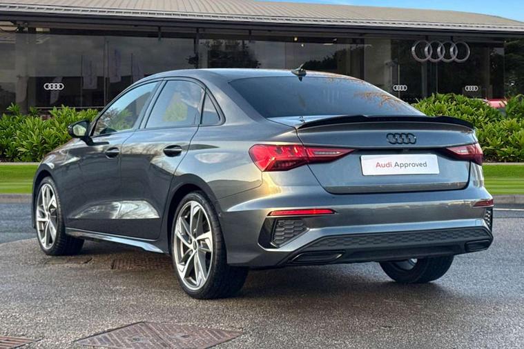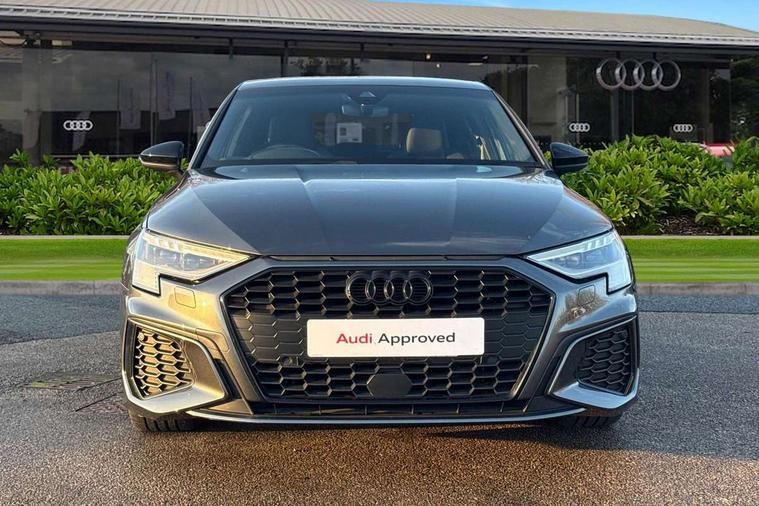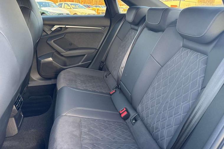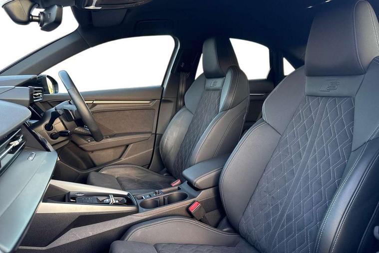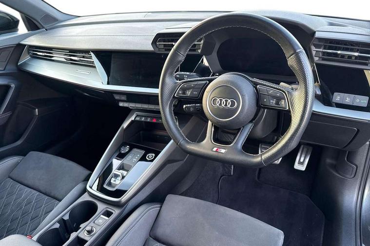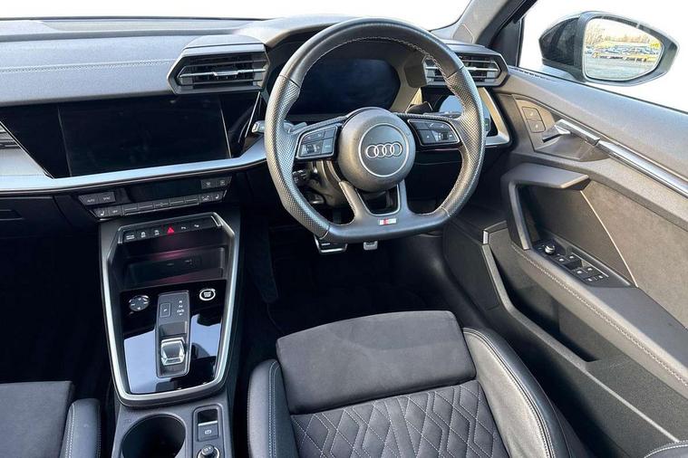 Audi connect emergency call and service, Audi drive select (Auto, Comfort, Dynamic, Efficiency and Individual), Audi smartphone interface, Audi virtual cockpit plus - 12.3" dynamic digital instrument cluster, Automatic start/stop system with recuperation, Bluetooth interface, Collision avoidance assistant, Electromechanical power speed sensitive steering, Lane departure warning system, MMI Navigation Plus with high resolution 10.1" colour touch screen display, Service indicator, Voice control system with natural language interaction, Sports suspension, 2x USB Type C ports (for charging and data transfer), 6 passive loudspeakers, CD player, DAB Digital radio, 3rd brake light, Acoustic glass windscreen, Audi matrix LED headlights, LED rear lights, dynamic front and rear indicators and headlight cleaning system, Auto dimming frameless rear view mirror, Electrically adj heated/folding + automatically dimming exterior mirrors + automatic kerb side function for passenger side exterior mirror, Front electric windows, Illuminated door sills with aluminium inserts at the front with S logo, Integrated LED indicators in door mirrors, LED daytime running lights, Light and rain sensors, Model and engine designation badges at rear, Privacy glass - dark tinted rear window, rear door and side windows, Rear electric windows, S roof spoiler, 12V socket and storage compartment in front centre console, 4 way electrically adjustable lumbar support for driver and front passenger, 40/20/40 split folding rear seat bench with cupholder, Black cloth headlining, Dual zone electronic climate control, Electrically adjustable front seats, Front and rear centre armrest in leather, Front and rear headrests, Front/rear floor mats, Heated front seats, Height and reach adjustable steering wheel, Interior lighting - glove compartment light and right hand side, Luggage compartment floor covering, Seat side bolsters, Stainless steel pedals and front footrest in black, Aluminium interior elements pack - A3 Saloon, Black styling pack - A3/S3, Dinamica microfibre/mono.pur 550 artificial leather pack - A3 Saloon, Extended ambient lighting pack - A3/S3 Saloon, LED interior lighting pack - A3 Saloon Edition 1/Vorsprung, 3x3 point rear seat belts, Driver and front passenger airbag with passenger airbag deactivation, Electronic Stabilisation Control (ESC) including ABS, ASR and EDL, First aid kit with warning triangle and 2 safety vests, Front side airbags with head airbags and interaction airbag, Hill hold assist, Pre-sense front with pedestrian and cyclist detection, Seatbelt monitoring, Tyre pressure loss indicator, Anti theft alarm, Anti-theft wheel bolts, Electronically operated child lock, Immobiliser, Remote control central locking, Aluminium air vent surrounds, Aluminium trim elements, Dark spectrum aluminium inlays, accent surfaces in the dashboard and centre console in platinum grey silk effect paint finish, 19" 5 arm trapezoid design alloy wheels in titanium matt grey with diamond cut finish,