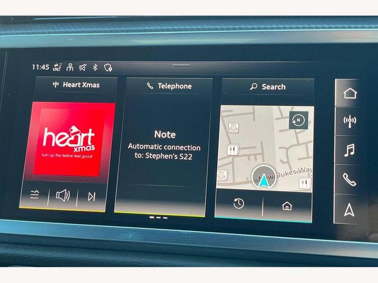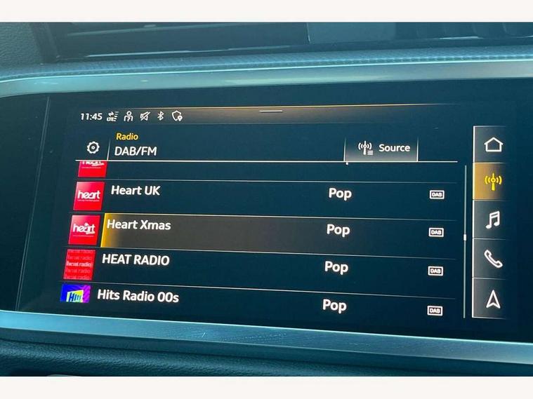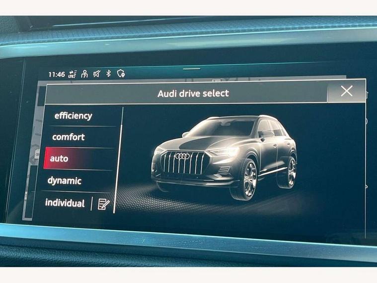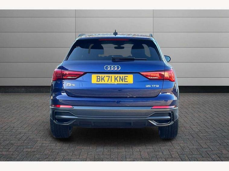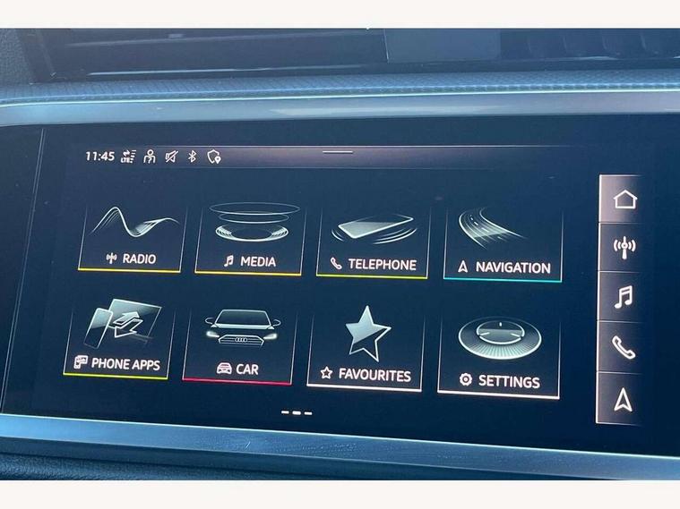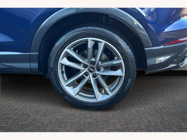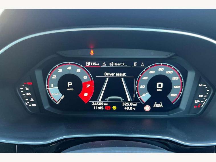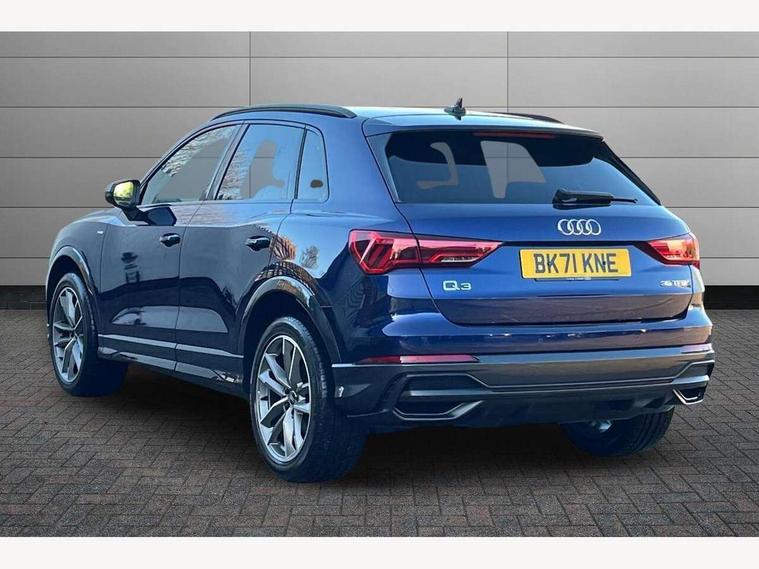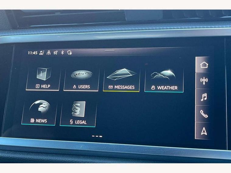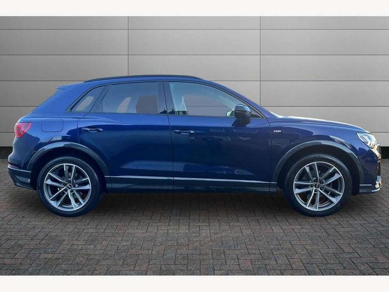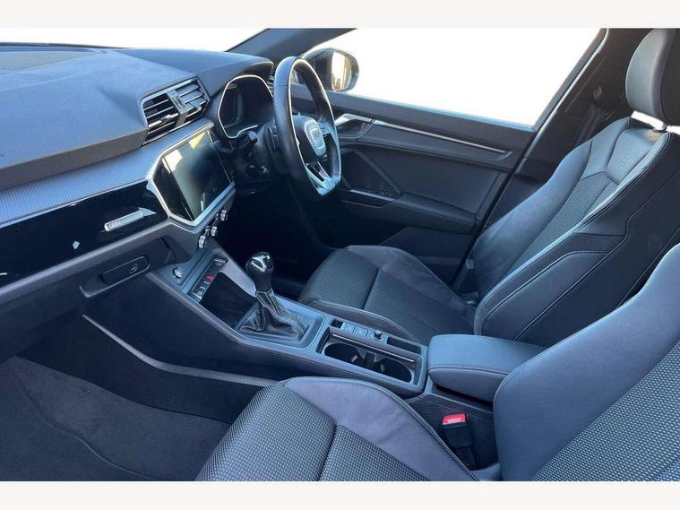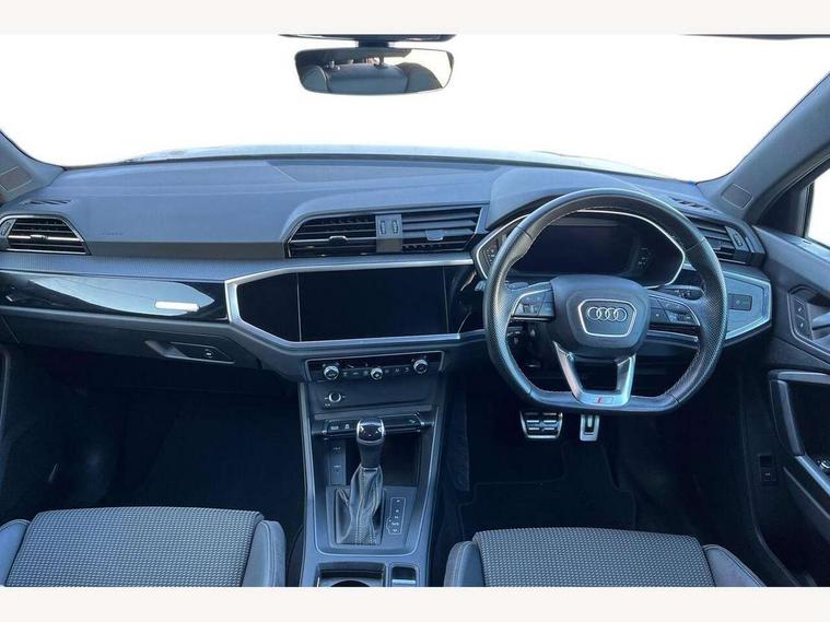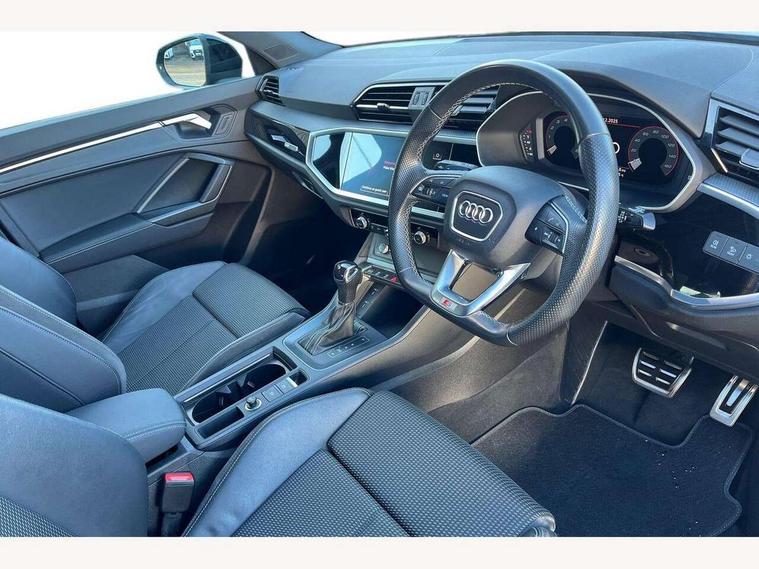 Amazon alexa Integration, Audi connect safety and service (e-call), Audi drive select, Audi lane departure warning, Audi smartphone interface includes wireless Apple carplay/Android Auto, Audi Virtual Cockpit - 10.25" display, Bluetooth interface, Camera based traffic sign recognition, MMI Navigation Plus with high resolution 10.1 inch touchscreen colour display, Power operated tailgate, Progressive steering, Service interval indicator, Start stop system with recuperation, Voice control system with natural language interaction, 48V Mild hybrid technology, Sports suspension, 2 USB-C ports with charge and data functions, 6 passive loudspeakers, DAB digital radio module, Acoustic windscreen, Auto dimming frameless rear view mirror, Black roof rails, Electrically folding, adjustable and heated door mirrors with integrated LED side indicators and kerb view function for passenger side, Front and rear electric windows, Front fog lights, Grille vertical bars in aluminium silver/Matt, High gloss black finish B and C pillars, LED headlights with LED daytime running lights and dynamic rear indicator, LED rear lights, Privacy glass dark tinted rear and rear-side windows (from B-pillar backwards), Rain and light sensors, Rear diffuser strip in matt titanium black, Rear side wing doors, Rear wiper, S line bumpers in contrasting Manhattan grey, Third brake light, Tinted rear windows, Variable front intermittent wipers, 12V socket in rear centre console, 3 seat bench in 2nd row, 40:20:40 folding with manual adjustment for 60:40 forwards/backwards position and backrest angle, Adjustable rear seat bench/backrest with centre armrest and cupholder, Black cloth headlining, Dual zone electronic climate control, Front and rear black floor mats with contrast stitching in rock grey, Front and rear headrests, Front and rear roof module including reading lights, Front centre armrest, Glove compartment lighting, Height and reach adjustable steering wheel, Illuminated door sill trims with S logo, ISOFIX child seat mounting for front passenger with airbag deactivation and outer rear seat including top tether attachment point for outer rear seats, Luggage compartment light, Manual front seats with height adjustment, Perforated leather gearknob, Single front passenger seat, Stainless steel luggage compartment sill finisher, Stainless steel pedals, Black styling pack - Q3, Non smoking pack - Q3, 3x3 point rear seatbelts, 6 airbags - Driver, front passenger, curtain and side windows, Audi pre-sense front with pedestrain and cyclist recognition, Electrically operated child locks on rear doors, Electromechanical parking brake, Electronic stabilisation control including ABS, ASR and EDL, Front seatbelt reminder, Hill descent control, Hill hold assist, Pre sense basic, Seatbelt monitoring, Tyre pressure warning, Warning triangle and first aid kit, Anti theft alarm, Anti theft wheel bolts, Immobiliser, Remote central locking, Detail dashboard around MMI touch colour display in glass look, black with surround in aluminium look, Leatherette door armrest, Piano black inlay, Tool kit, Tyre repair kit,