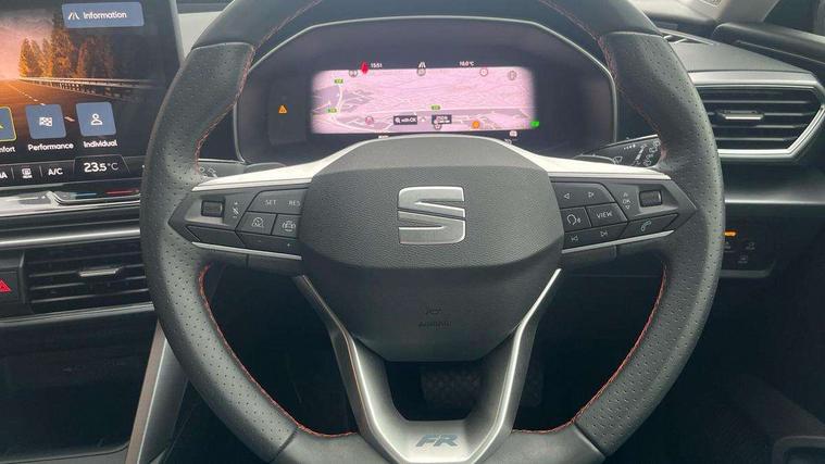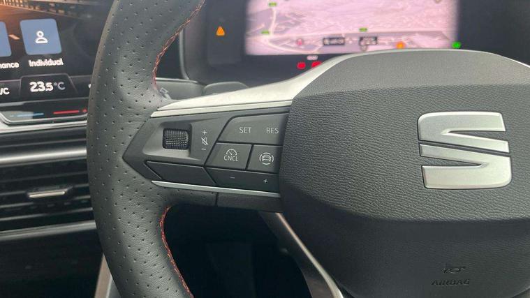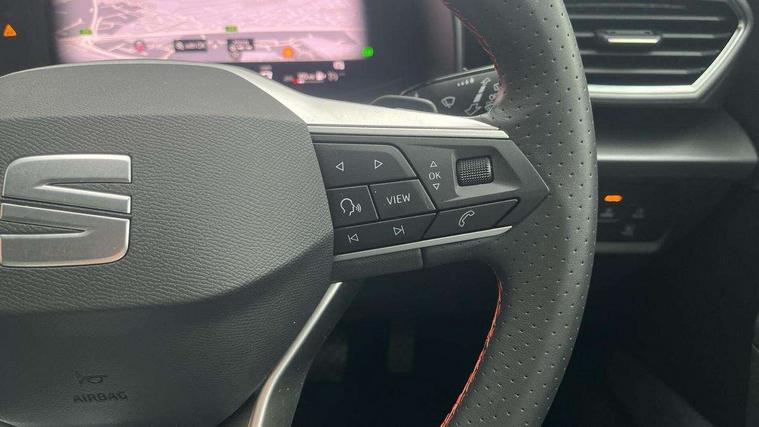 Digital cockpit with multifunction display, Driver attention alert with drowsiness warning, E-call, Front assist with forward collision warning braking reaction to vehicles, pedestrians and cyclists, Full link smartphone integration with Mirror Link, wireless Apple CarPlay and wired Google Android Auto, Intelligent speed assist, Lane assist, Lockable tailgate, Park assist (inc front/rear parking sensors), Power assisted speed sensitive electro-mechanical steering, Rear view camera, RPM, trip computer, outside temp gauge, instrument light brightness, low fuel warning light, lights on reminder, gearshift indicator, SEAT drive profile with 4 modes (Eco/Normal/Sport/Individual), throttle response and gearshift mode, Service interval indicator, Start/stop system with regenerative braking, Sports suspension, XDS electronic differential lock and dynamic traction support, 2 front and 2 rear USB-C ports, 7 speakers, Auxiliary input socket, Auto dimming rear view mirror, Body colour door handles, Body coloured bumpers, Cosmo grey exterior mirrors with integrated LED indicators, Dark tinted rear windows, Electric front/rear windows, Electrically adjustable, heated and folding door mirrors, FR sports bumper, Illuminated front door sill, LED front fog lamps, LED headlights and infinite rear tail lights, LED rear fog lamp, Rear side wing doors, Rear wash/wipe, Separate daytime running light with automatic headlight control and coming home feature, Third brake light, Welcome light silhouette from exterior mirrors, Windshield wiper intermittent control with light/rain sensor, 12v power point in centre console, 3 seat bench in 2nd row, 60/40 split rear bench seat with armrest, Ambient lighting with glovebox, footwell and single monocolour, Driver/passenger manual seat height adjustment, Dust/pollen filter, Folding boot cover, Front and rear height adjustable headrests, Front and rear reading lights X 4, Front centre armrest, Front seatback storage pockets, Grey headlining, Height/reach adjust steering wheel, ISOFIX points in outer rear seats with top tether anchorage points, Luggage tie-down hooks, Lumbar adjustment for front seats, Single front passenger seat, Sunvisors with covered illuminated mirror, Three zone climate control, Two tone cloth upholstery, Media system plus with navigation - Leon, 3 point seatbelts on all rear seats, ABS, Brake control system - ESC and brake booster, Child proof door locks, Driver and front passenger airbags with front passenger airbag de-activation, front side and curtain airbags, Electronic parking brake, Extended safety system - seat belt tensioner, window closure and hazard lights, Hill hold control, Rear disc brakes, Seat belt reminder for front and rear seats, Tyre pressure monitoring system, Anti theft alarm system with interior monitoring in cab, backup horn and towing protection, KESSY Go (Keyless start), Locking wheel bolts, Wireless phone charging, Chrome interior detailing, 17" Dynamic Bi-spoke alloy wheels with 91W tyres, Tool kit,