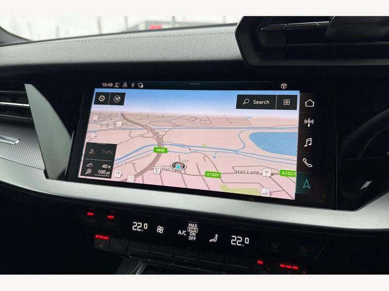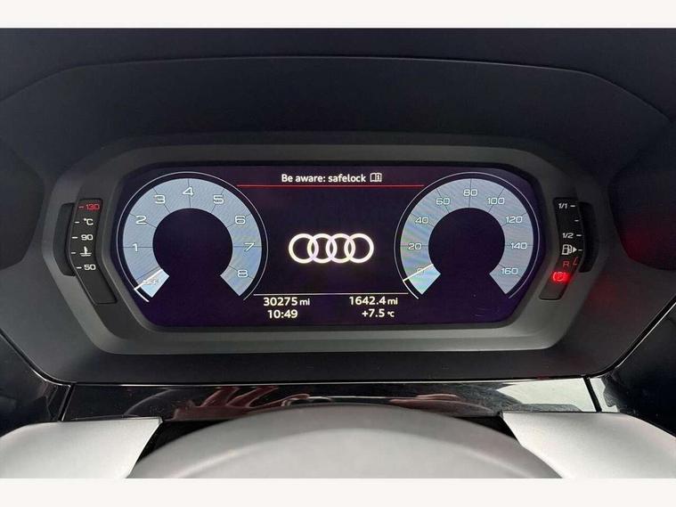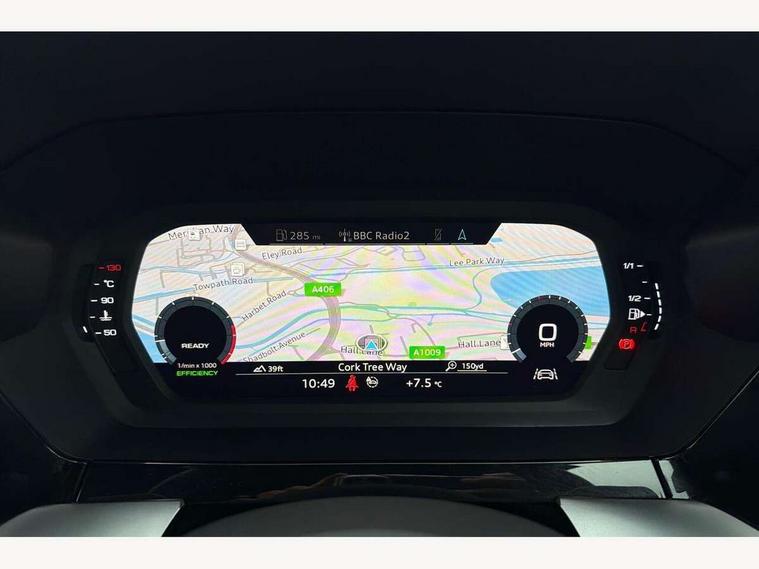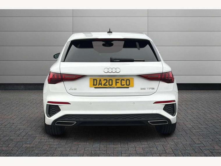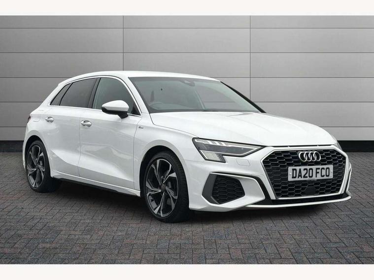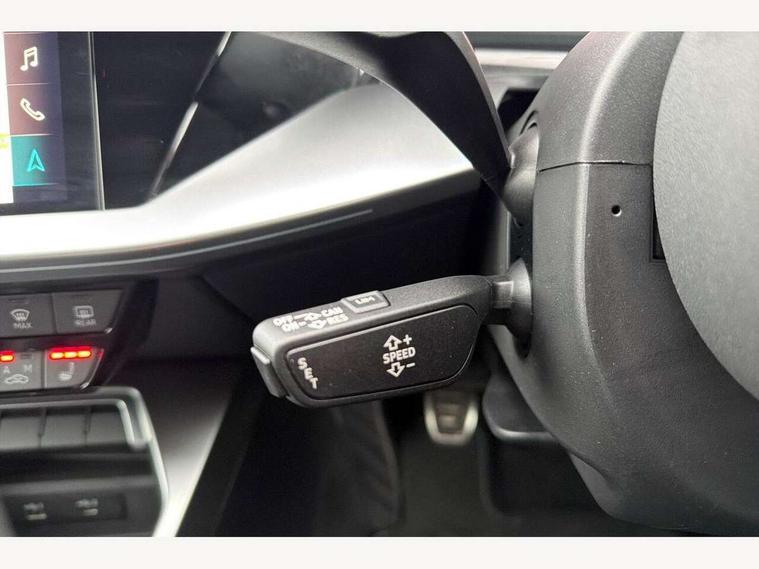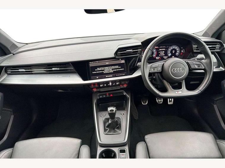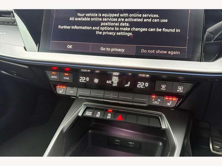 Audi connect emergency call and service, Audi drive select (Auto, Comfort, Dynamic, Efficiency and Individual), Audi smartphone interface, Audi Virtual Cockpit - 10.25" digital and colour instrument cluster, Automatic start/stop system with recuperation, Bluetooth interface, Collision avoidance assistant, Cruise control, Electromechanical power speed sensitive steering, Lane departure warning system, MMI Navigation Plus with high resolution 10.1" colour touch screen display, Rear parking sensors, Service indicator, Trip computer, Voice control system with natural language interaction, 1xUSB-A and 1xUSB-C connection, 6 passive loudspeakers, DAB Digital radio, Acoustic glass windscreen, Aluminium window trim, Auto dimming frameless rear view mirror, Body colour exterior mirrors, Electrically adjustable/heated/folding/dimming door mirrors with kerb view includes integrated LED indications + kerb view function for passenger side, Front electric windows, Illuminated aluminium inserts front door sills with S logo, LED daytime running lights, Light and rain sensors, Privacy glass - dark tinted rear window, rear door and side windows, Rear electric windows, Rear side air outlets in grained matt black, Rear wiper, S line bumpers, S roof spoiler, 12V socket and storage compartment in front centre console, 40/20/40 split folding rear seat bench with cupholder, Black cloth headlining, Dual zone electronic climate control, Front and rear centre armrest in leather, Front and rear headrests, Front/rear floor mats, Height and reach adjustable steering wheel, Interior lighting - glove compartment light and right hand side, Luggage compartment floor covering, Manual boot compartment lid, Manually adjustable front seats, Seat side bolsters, Stainless steel pedals and front footrest, Twin leather upholstery with front sports seats S embossed logo, Aluminium interior elements pack - A3 Sportback, S line styling pack - A3 Sportback, 3x3 point rear seat belts, Driver and front passenger airbag with passenger airbag deactivation, Electronic Stabilisation Control (ESC) including ABS, ASR and EDL, First aid kit with warning triangle and 2 safety vests, Hill hold assist, Pre-sense front with pedestrian and cyclist detection, Seatbelt monitoring, Tyre pressure loss indicator, Anti theft alarm, Anti-theft wheel bolts, Electronically operated child lock, Immobiliser, Remote control central locking, Accent surfaces in the dashboard and centre console in platinum grey silk effect paint finish, Dark spectrum aluminium inlays,
