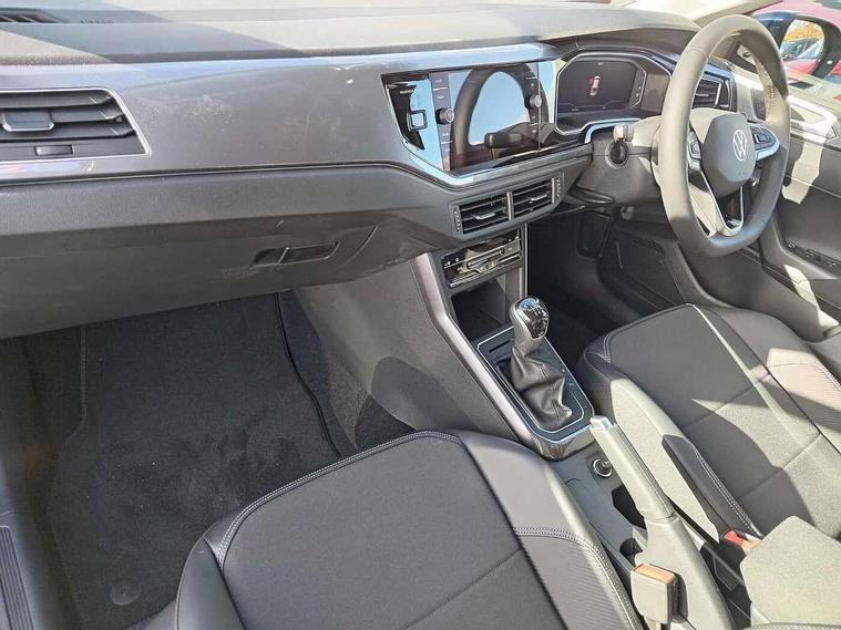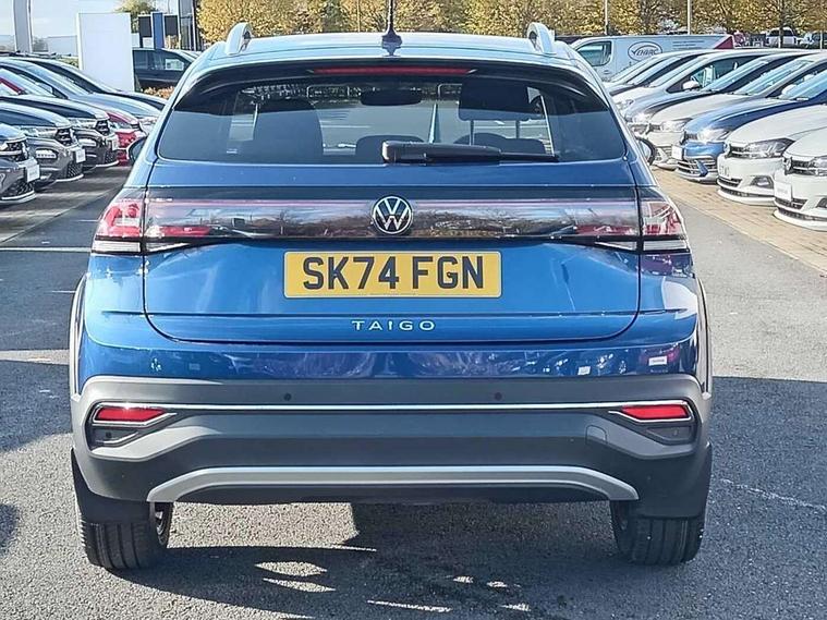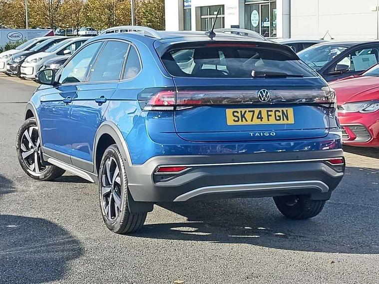Advanced driver attention and drowsiness monitor, App-Connect including App-Connect Wireless, Digital cockpit pro - 10.25" high resolution TFT dash display screen with customizable menus and information, e-Call (emergency call), Power Steering, Travel assist including emergency assist, Washer fluid level indicator, Wireless Charging including Bluetooth, Rear shock absorption, Start-stop system with battery regeneration (recuperation - energy recovery during braking), Digital radio reception (DAB+), Diversity antenna for FM reception, WeConnect plus, Ambient lighting with logo projection, Aspherical driver's exterior mirror, Auto headlights, Body coloured bumpers and radiator grille with chrome trim and front fog lamps with chrome bezel, Dual chrome twin tailpipes on left and right, Electric windows, External USB type C socket and charging sockets, LED rear combination lamp, LED third brake light, Left convex exterior mirror, Power folding adjustable/heated exterior mirrors and front passenger exterior mirror lowering function, Rear fog light on one side, reversing light on both sides, Rear side wing doors, Rear wash/wipe with intermittent wipe setting, 12V socket in centre console, 2 front reading lights, 3 rear head restraints, 3 seat bench in 2nd row, Air care climatronic air conditoning system with active combination filter and 2-zone temperature control, Black carpets, Child seat anchor for child seat system i-Size, 2x top tether and child seat anchor in front on front passenger side, Chrome bezel for instrument cluster, vents, door handles + gear shift, Driver and front passenger seat height adjustment, Front + rear carpet mats, Front centre armrest, Front footwell illumination, Front sports comfort seats, Height and reach adjustable steering wheel, Interior ambient lighting and surround lighting, Leather trimmed gear knob, Leather wrapped multifunction steering wheel, Luggage compartment floor, Luggage compartment light, Lumbar support for driver's and front passengers seat, Single front passenger seat, Split folding backrest with centre armrest and unsplit rear seat bench, Storage compartment under front seats, Sun visors with illuminated vanity mirrors, Chrome Package - Taigo, Drivers assistance pack - Taigo, IQ.LIGHT - LED matrix headlights pack - Taigo, Light and sight pack - Taigo, 2 x 3-point seatbelts/outer rear seats with ECE label, 3-point seat belts in front with pretensioner and height adjustment, 3-point seatbelt for centre rear seat, Adaptive driver and front passenger airbags with passenger airbag deactivation function, Driver and front passenger safety-optimised head restraints, Electronic stability control, Extended and predictive pedestrian/ cyclist protection, Front and rear disc brakes, Front curtain and side airbags with center airbag, Hill start assist, Manual rear child locks, Single tone horn, Tyre pressure loss indicator, Anti-theft alarm system with interior monitoring, backup horn, and towing protection, Anti-theft wheel bolts, Low rolling resistance tyres,