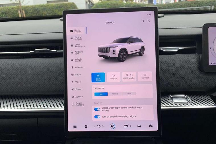 10.25" LCD instrument cluster, 13.2" portrait central LCD display, 3 driving modes Normal/Eco/Sport, 540 degree panoramic view camera with transparent view, Adaptive cruise control, Blind spot detection, Bluetooth handsfree system, Corner speed control assist, DAI Forward Departure System, Driver monitoring system, E-call safety system, Electric power steering, Emergency lane keep assist, Front and rear parking sensors, Front collision warning, ICA - integrated cruise assist, Integrated satellite navigation - Live traffic data with wifi hotspot, Intelligent active speed limit, Intelligent elude system, Intelligent speed assist, Lane control assist, Lane departure prevention, Lane departure warning, Multiple collision defence system, Power tailgate, Rear crossing traffic braking, Rear crossing traffic warning, Remote engine start, Remote HVAC start, Speed limiter, Traffic jam avoidance assistant, Traffic sign recognition, Wireless Apple CarPlay/Android Auto, Wireless mobile phone charging - 50w capacity, cooled, Independent rear suspension, 2 x Front USB, 1 x Type A, 1 x Type C (fast charging), 2 x Rear USB, 1 x Type A, 1 x Type C (fast charging), 6 speaker audio system, DAB Digital radio, Auto dimming rear view mirror, Auto full beam LED headlights, Auto wipers, Automatic headlights, Body colour door handles, Electrically adjustable, heated and folding door mirrors, Follow me home headlight function, Front fog lights, Full length panoramic sunroof with opening front section, Heated rear window, High level LED brake light, Integrated antenna, LED daytime running lights, LED rear lights, One touch window function for all doors, Privacy glass, Rear side wing doors, Roof rails, Silent glass - windscreen and front side windows, Single layer roof spoiler, Tinted rear windows, Windows opening via remote, 12V power outlet - Boot, 12v power outlet - front, 12V socket in luggage compartment, 3 seat bench in 2nd row, 4 way adjustable steering column, 4 way electric adjustable passenger seat, 6 way power adjustable driver seat, 60/40 split folding rear seat backrest, Driver and passenger sun visors with vanity mirror, Dual zone air conditioning with second row outlet, Front armrest with interal storage and upper storage tray, Front deluxe seats, Front headrests, Front reading light, Heated front seats, Luggage compartment light, Multi function steering wheel, Rear bench armrest with integrated cupholder, Rear headrests, Selectable multi colour ambient lighting, Single front passenger seat, Synthetic leather steering wheel, Synthetic leather upholstery, 2 x isofix, 3 point seatbelts on all seats, ABS/EBD, Autonomous emergency braking, BAS (Brake Assist System), Child locks, Door Opening Warning, Downhill assist, Dual front airbags, Electronic brake force distribution, Electronic parking brake with auto hold, Electronic Stability Programme, Front and rear side airbags, Front centre airbag, Knee airbags, Passenger airbag manual switch off, Power limited seatbelts with pre-tensioners, height adjustable with CLT, Tyre pressure monitoring system, Uphill assist, Anti theft alarm, Automatic door locking, Engine immobiliser, Keyless start button, PEPS (passive entry and passive start) with walkaway locking, Dark colour interior, 19" Alloy wheels, Tyre repair foam,