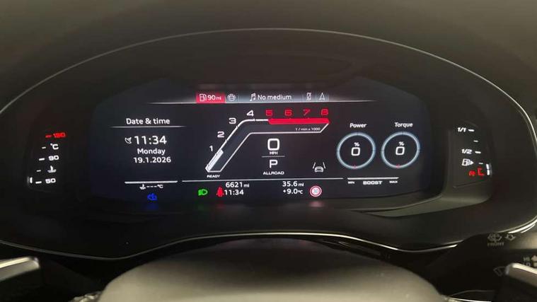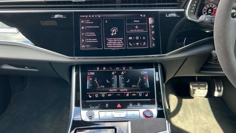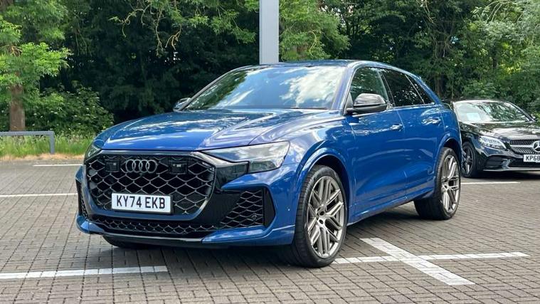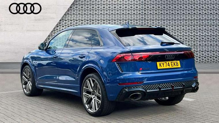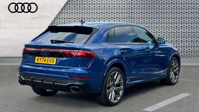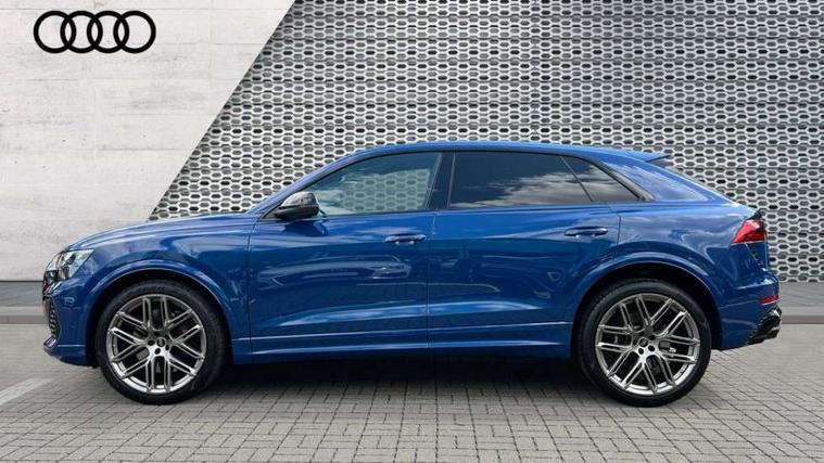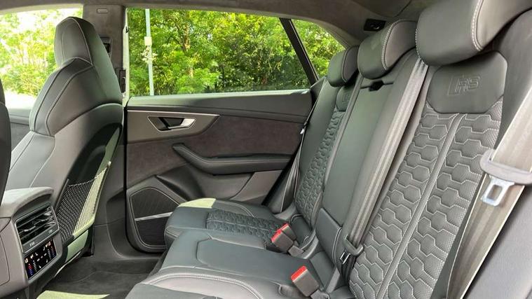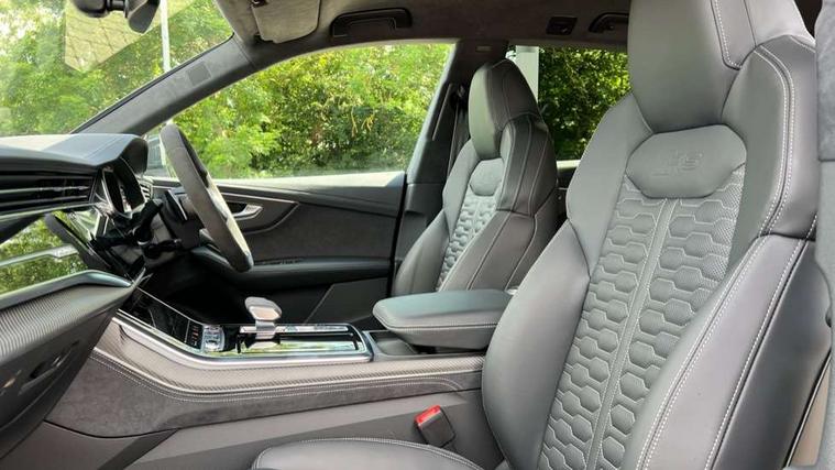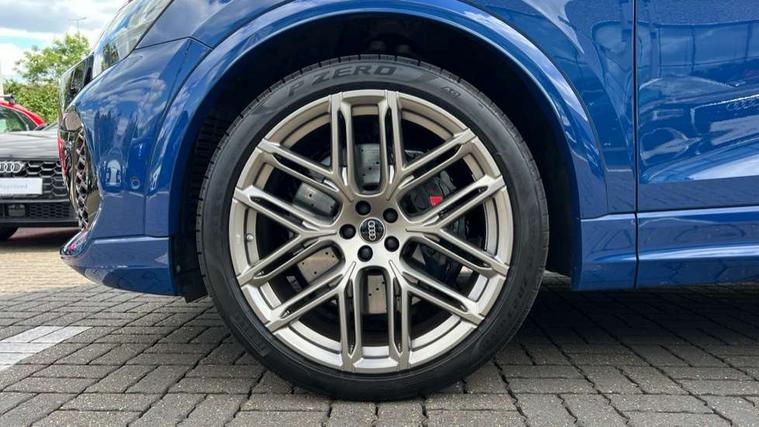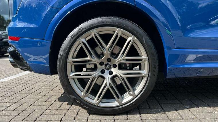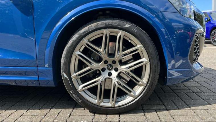 360 degree camera, All wheel steering, Audi active lane assist, Audi connect safety and service (e-call), Audi connect with Amazon Alexa Integration, Audi smartphone interface includes wireless Apple carplay/Android Auto, Audi virtual cockpit - 12.3" high resolution LCD display with fully customisable instrument cluster and RS specific menus and options, Automatic start/stop system, Bluetooth interface, Convenience key, Electro-mechanical PAS, Emergency assist, Head up Display, Intersection assist, MMI navigation plus with MMI touch, Natural voice recognition, On board computer, Operating buttons in black, glass look with haptic feedback, Park assist with parking system plus including 360 degree display with front, rear and side parking sensor, Power latching doors, Power operated tailgate, Remote park assist plus, RS Audi drive select, Service interval indicator, Speed limiter, 48V Mild hybrid technology, Electromechanical active roll stabilisation, Quattro all wheel drive with sport differential, RS specific Adaptive air suspension, Audi app store, Audi music interface - front 2 USB-C ports with charger and data functions, Aux-in socket, Bang & Olufsen 3D Premium Sound System with 17 speakers including centre speaker and subwoofer/ 16 channel amplifier with 730 watts sound output, DAB Digital radio, Audi HD Matrix LED headlights in RS specific design with Audi laser light, Auto dimming frameless rear view mirror, Black door mirrors, Digital OLED rear combination lamps, Electric front+rear windows, Electrically folding auto dimming/adjustable/heated door mirrors with memory function, LED side indicators and kerb view function for passenger side, Headlight washers, Heat insulating glass in windshield, Illuminated door sill trims with RS logo, LED 3rd brake light, LED entry lighting with RS projection in front and rear, LED signature daytime running lights, Preparation for trailer hitch, Privacy glass - dark tinted rear and rear side windows from B-pillar backwards, Rain and light sensors, Rear side wing doors, Rear wiper, RS badges on front wings, RS coming/leaving home animations in front and rear, RS manhattan grey front spoiler lip and rear diffuser insert, RS specific bumpers in full body colour paint finish, RS specific singleframe grille with honeycomb structure and large inserts, RS sport exhaust system with black exhaust tips, 3 bench rear seats in 2nd row, 3 spoke heated alcantara multi-function sport steering including paddle shift, 4 zone automatic climate control, 4-way lumbar support for front seats, 40:20:40 split folding rear bench seat, Audi phone box light, Black dinamica headlining, Comfort front centre armrest, Double sun visor with illuminated vanity mirror on driver and passenger side extendable, Driver and front passenger seat memory function for electrically adjustable front seats, Electric adjustable steering column with memory functionality, Electric sunblind for the rear side windows and manual sunblind for the rear window, Front head restraints, Heated front seats, Heated rear seats, ISOFIX child seat mounting for front passenger seat and 2 outer rear seats with top tether child seat mounting for all 3 rear seats, Massage and ventilation function for front seats, Net partition, Perforated Valcona leather upholstery + RS front super sports seats + honeycomb pattern with RS embossed logo, Premium air quality system with air ionizer and aromatization, Rear headrests, Seat cushion, Single front passenger seat, Stainless steel pedals, USB port with charge function in the front and rear seats, Black styling pack plus - RS Q8, City assist pack - Q8, Multi-coloured extended LED interior lighting pack - RS Q8, RS grey design pack - RS Q8, RS specific styling pack - RS Q8, Tour pack when bought with City assist pack- RS Q8, 3 point seatbelts on all seats, Audi pre sense front, Child locks on rear doors, Driver and front passenger, front side and curtain airbags, Electromechanical parking brake, Electronic Stability Control (ESC) including ABS, ASR and EDL, Front passenger airbag deactivation, Hill descent control, Hill hold assist, Predictive pedestrian protection, RS steel brakes and black brake callipers with RS logo, Seatbelt monitoring, Tyre pressure loss indicator, Warning triangle and first aid kit, Anti theft alarm with tow away protection, Anti-theft wheel bolts and wheel loosening detection, Immobiliser, Matte carbon twill inlays, 23" x 10.5J 6 Y twin spoke design Audi Sport alloy wheels in matt neodymium gold, Performance SUV tires by Pirelli, Tool kit, Tyre repair kit,