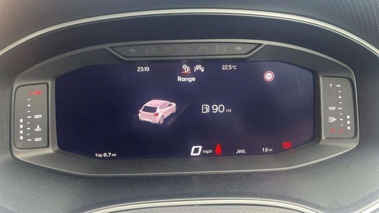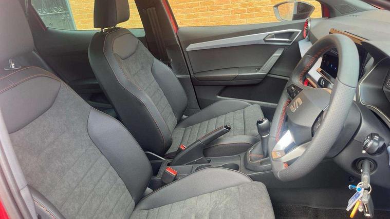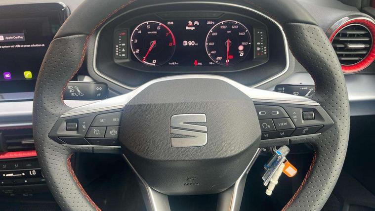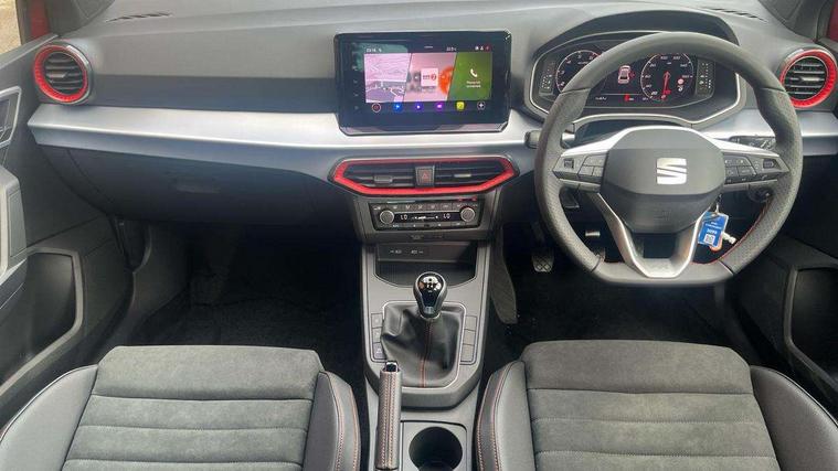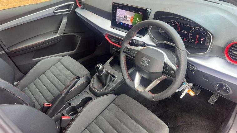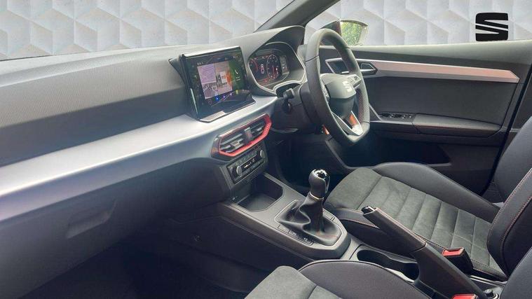 'Lights On' Reminder warning buzzer, 10" Digital cockpit, 9.2" touchscreen navigation system with type C USB socket, Voice control and DAB/AM/FM radio, Auto start and stop system, Bluetooth audio streaming with handsfree system, Digital clock, E-call, Full link smartphone integration with mirror link, wireless apple carplay, Google android auto + USB Type C cable for apple and android devices, Lane assist, Low fuel warning light, Outside temperature gauge, Power Steering, Rear parking sensor, Seat connect plus with safety, service, remote and online, SEAT logo boot release, Speed limiter, Traffic sign recognition, Trip computer, Sports suspension, 6 speakers, Auxiliary input socket, Radio/MP3 player, SD card slot, Steering wheel mounted controls, Anti theft roof antenna, Auto dimming rear view mirror, Automatic rain sensing wipers, Black door mirror caps, Body colour bumpers, Body colour door handles, Brilliant black window surrounds, Dark tinted rear windows, Electric adjustable/heated/folding door mirrors, Electric front windows, Electric headlight adjustment, Electric rear windows, Front/rear fog lights, FULL LED automatic headlights with dynamic headlight range control, coming and leaving home, LED daytime running lights, LED 3rd brake light, LED tail lights, Rear roof spoiler with FR twin exhausts, Rear side wing doors, Rear wiper, 3 seat bench in 2nd row, 60/40 split folding rear seat, Ambient interior lighting, Chrome detailing and black headlining, Comfort seats, Dual zone climate control with combination filter, Front courtesy lights, Front cupholders x 2, Front reading lights, Gear shift indicator, Glovebox, Height adjustable front and rear headrests (five), Height adjustable front seats, Height/reach adjust steering wheel, Illuminated air vent surrounds, Illuminated boot, Instrument lighting with brightness control, Isofix, Leather multifunction flat bottomed sports steering wheel, Microsuede cloth upholstery, Passenger sunvisor, Single front passenger seat, Storage pockets on back of front seats, Sunvisors with mirror and driver side card holder, Safety and driving pack (S) - Ibiza, 3 point seatbelts on all 3 rear seats, ABS, Active front headrests, Child locks on rear doors, Electronic stability control, Energy recovery system, Front driver and passenger side airbags with curtain airbag and front passenger airbag deactivation, Hill hold control, Multi-Collision braking, Seat belt reminder for front and rear seats, Tiredness recognition system, Tyre pressure monitoring system, Locking wheel bolts, Perimeter alarm and interior monitoring with backup horn and tow away protection, Remote central locking + deadlocks, 18" Performance machined alloy wheels in black and grey,