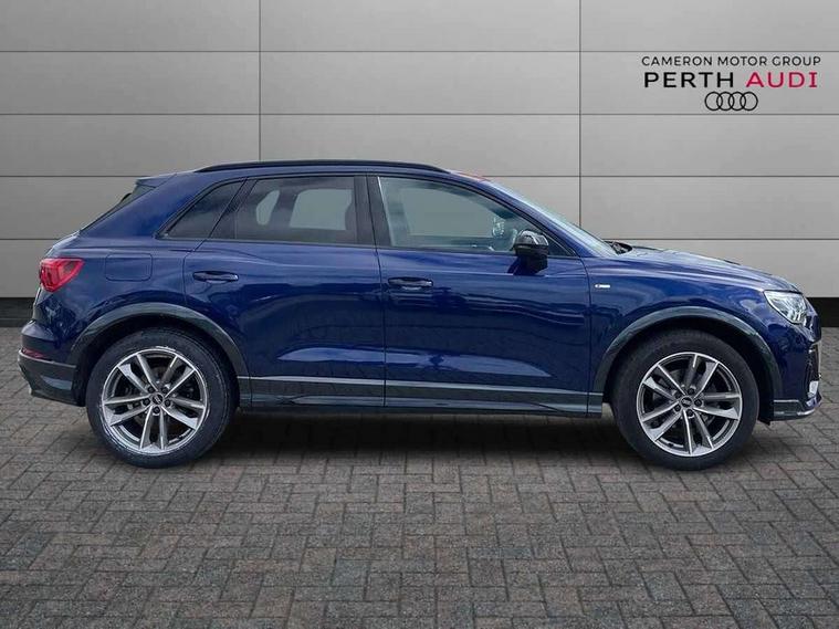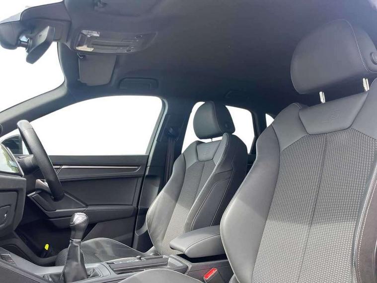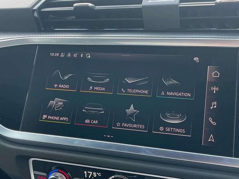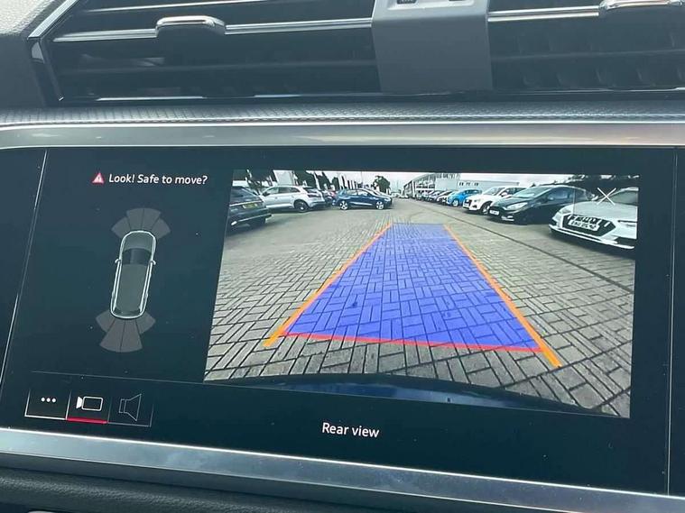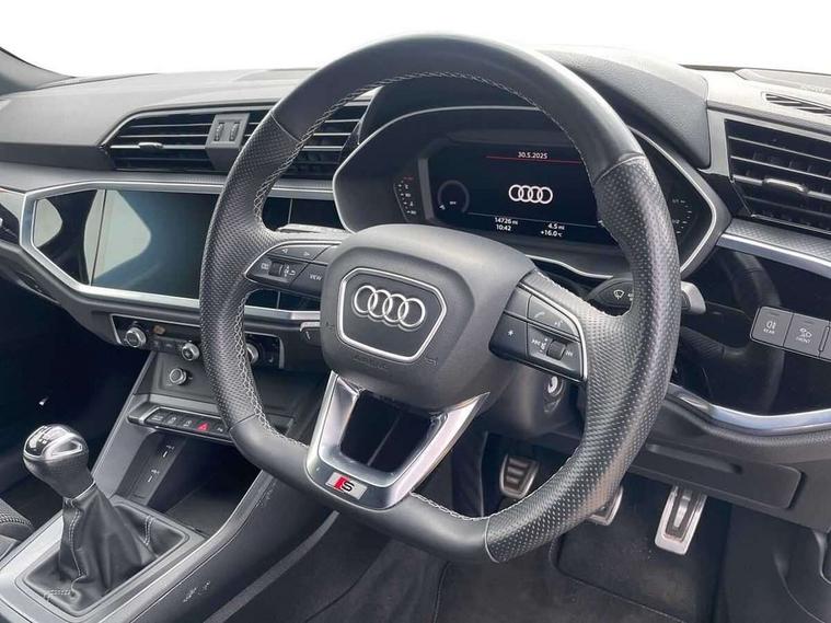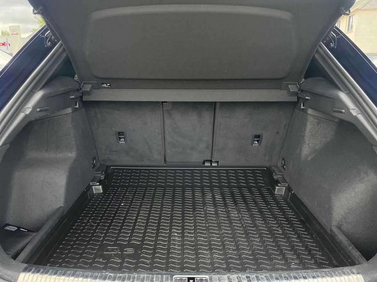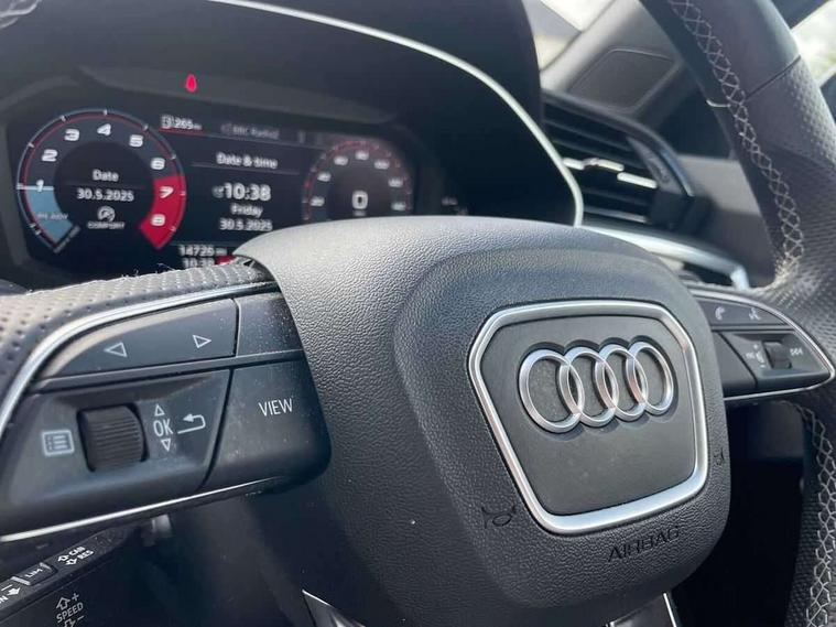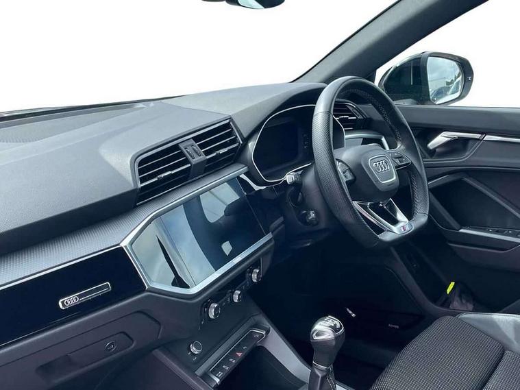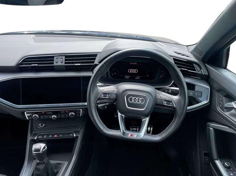 Amazon alexa Integration, Audi drive select, Audi lane departure warning, Audi smartphone interface includes wireless Apple carplay/Android Auto, Audi Virtual Cockpit - 10.25" display, Bluetooth interface, Camera based traffic sign recognition, Cruise control + speed limiter, Legal emergency call, MMI Navigation Plus with high resolution 10.1 inch touchscreen colour display, Power operated tailgate, Progressive steering, Rear parking sensors, Service interval indicator, Start stop system with recuperation, Voice control system with natural language interaction, Sports suspension, 2 USB-C ports with charge and data functions, 6 passive loudspeakers, DAB digital radio module, Acoustic windscreen, Auto dimming frameless rear view mirror, Black roof rails, Electrically folding, adjustable and heated door mirrors with integrated LED side indicators and kerb view function for passenger side, Front and rear electric windows, Front fog lights, Grille vertical bars in aluminium silver/Matt, High gloss black finish B and C pillars, LED headlights with LED daytime running lights, LED rear lights, LED third brake light, Privacy glass dark tinted rear and rear-side windows (from B-pillar backwards), Rain and light sensors, Rear diffuser grille in grained matt black, Rear diffuser strip in matt titanium black, Rear side wing doors, Rear wiper, S line bumpers in contrasting Manhattan grey, Variable front intermittent wipers, 12V socket in rear centre console, 3 seat bench in 2nd row, 3 spoke flat bottomed multi-function leather sport steering wheel, 40:20:40 folding with manual adjustment for 60:40 forwards/backwards position and backrest angle, Adjustable rear seat bench/backrest with centre armrest and cupholder, Black cloth headlining, Dual zone electronic climate control, Front and rear black floor mats with contrast stitching in rock grey, Front and rear headrests, Front and rear roof module including reading lights, Front centre armrest, Glove compartment lighting, Height and reach adjustable steering wheel, Illuminated door sill trims with S logo, ISOFIX child seat mounting for front passenger with airbag deactivation and outer rear seat including top tether attachment point for outer rear seats, Luggage compartment light, Manual front seats with height adjustment, Perforated leather gearknob, Single front passenger seat, Stainless steel luggage compartment sill finisher, Stainless steel pedals, Black styling pack - Q3, Non smoking pack - Q3, 3x3 point rear seatbelts, 6 airbags - Driver, front passenger, curtain and side windows, Audi pre-sense front with pedestrain and cyclist recognition, Electromechanical parking brake, Electronic stabilisation control including ABS, ASR and EDL, Front seatbelt reminder, Hill descent control, Hill hold assist, Manual child lock in rear doors, Pre sense basic, Seatbelt monitoring, Tyre pressure warning, Warning triangle and first aid kit, Anti theft alarm, Anti theft wheel bolts, Immobiliser, Remote central locking, Detail dashboard around MMI touch colour display in glass look, black with surround in aluminium look, Leatherette door armrest, Piano black inlay,