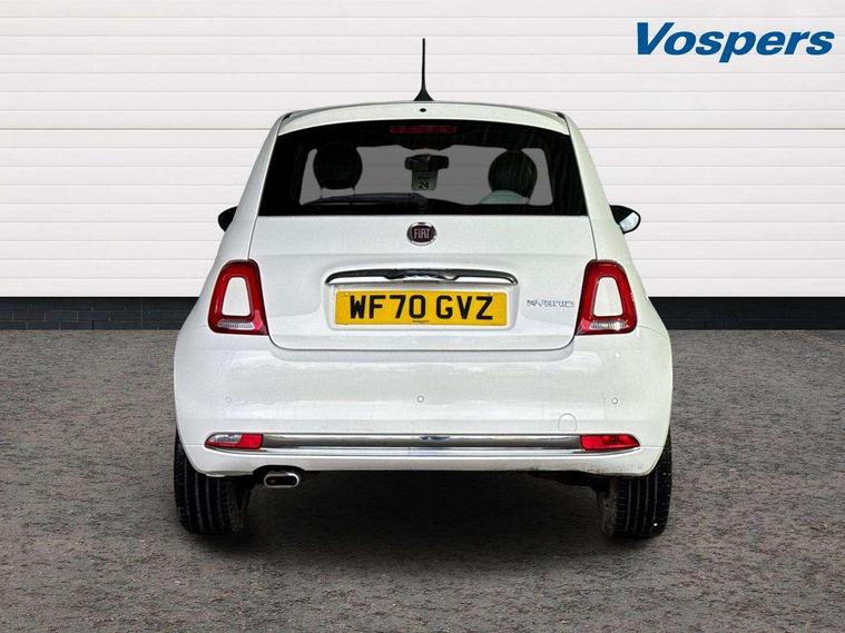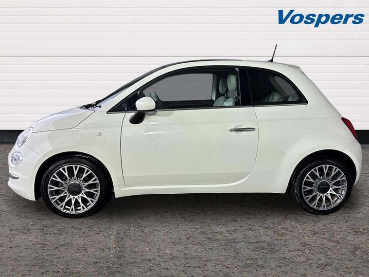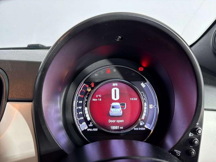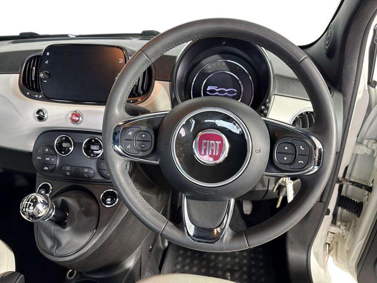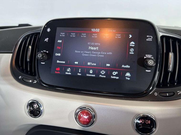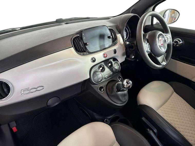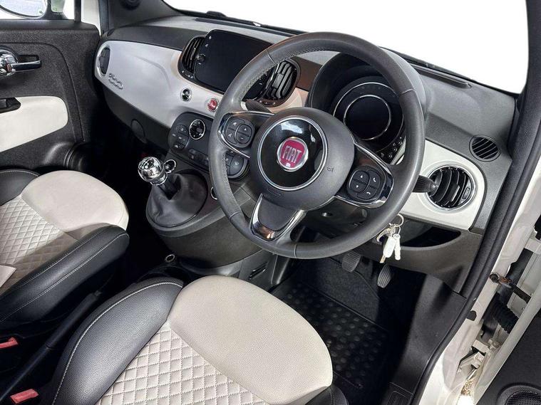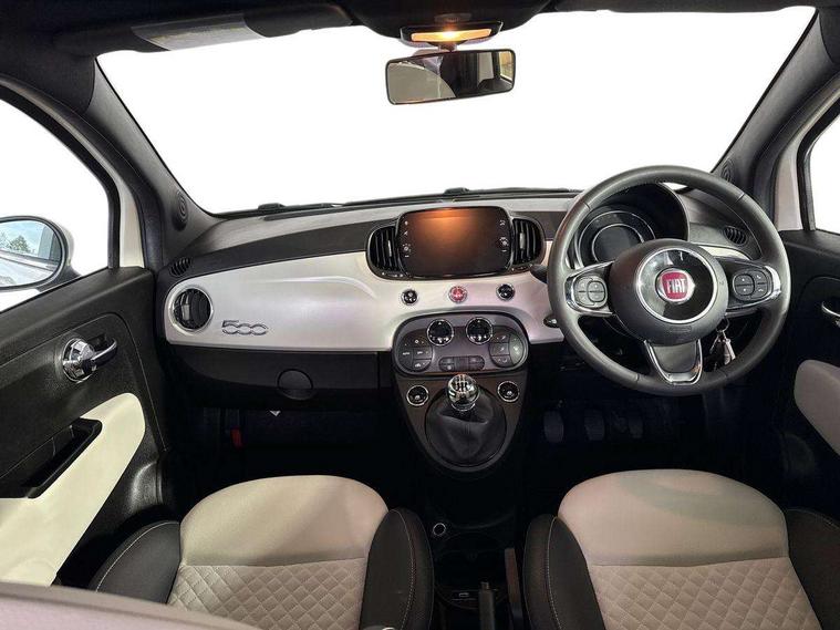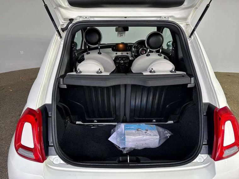 Matt white dashboard, Chrome pack - 500, Automatic door locking, Immobiliser, Locking fuel filler cap, Remote central locking, Rear speakers, 7 airbags - Driver, passenger, side, window and drivers knee airbags, ABS/EBD, Curtain airbags, ESC + ASR/MSR + HBA + Hill holder, Traction control, Tyre pressure monitoring system, Body colour bumpers, Chrome plated exterior door handles, Electric front windows, Front fog lights, Heat insulated glass, Heated rear windows with wash wipe, LED daytime running lights, 1 passenger grab handle, 50/50 split folding rear seats with height adjustable rear headrests, Auto climate control, Auxilliary 12V power socket, Front headrests, Height adjustable drivers seat, Height adjustable steering wheel, Isofix child seat preparation, Techno leather steering wheel with audio controls, 7" HD Touchscreen Radio with 3D Navigation, Bluetooth, USB, and DAB, 7" TFT instrument cluster, Apple car play/Android Auto, Cruise control, External temperature gauge, Power assist steering, Rear parking sensor, Speed limiter, Stop/start system, Trip computer,