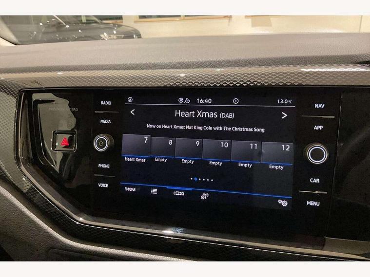 Advanced driver attention and drowsiness monitor, Bluetooth mobile phone interface, Dynamic road sign display, Emergency call service, Multifunction front facing camera for distance control, Park distance control, Power assisted speed sensitive steering, Predictive adaptive cruise control without follow-to-stop and speed limiter, Preparation for navigation system with media and internet package, Preparation for We connect and We connect plus, Rear view camera, Speedo and rev counter, electronic odometer, trip, service interval display and exterior temperature gauge, Standard rear axle, Travel Assist - Lane keeping system and traffic jam assist, Travel assist including emergency assist, Trip computer, Warning signal and warning light for front and rear seatbelts not fastened, Washer fluid level indicator, Wireless app connect, Front wheel drive, Rear shock absorpion, Start-stop system with battery regeneration (recuperation - energy recovery during braking), DAB Digital radio, Diversity antenna for FM reception, Front and rear 6 speakers, Automatic dimming interior rear view mirror, Automatic headlight control with LED separate daytime running lights with coming/leaving home function, Body colour bumpers with chrome inserts, Body colour door handles, Body colour door mirrors, Electric front windows, Engine badge deletion, Headlight range adjustment, Heat insulating and laminated safety glass windshield, LED Headlights, LED rear combination lamps, Power folding adjustable/heated exterior mirrors and front passenger exterior mirror lowering function, Rain sensor, Rear electric windows, Rear fog light, Rear side wing doors, Rear tinted glass from B-pillar backwards approx 65% tinted, Rear windscreen washer and wiper with interval delay, Third brake light, 12V power socket in centre console, 2 front and 2 rear reading lights with switch off delay and dimmer, 2 USB-C ports in the front, 2 USB-C charging sockets on the center console in the rear, 3 rear head restraints, 60/40 split folding rear seat and rear seat bench not split, Ceramique roof lining, Chrome plated radiator grille inserts, air vent surrounds and light switch surrounds, Door and side trim panel, Driver and front passenger seat height adjustment, Driver/passenger sunvisors with illuminated vanity mirrors, Front centre armrest, Front seat backrest storage pockets, Front standard seats, Handbrake lever handle in leather, Hartley/Thomas cloth upholstery, Headliner in recycled material, Isofix child seat preparation easy-fit (for two outer rear seats, and front passenger seat) compatible with I-size, Leather trimmed gear knob, Luggage compartment cover, Luggage compartment lighting, Removable luggage compartment floor, Single front passenger seat, Standard climatic zones, Standard pedal cluster, Three spoke leather wrapped multifunction steering wheel with shifting paddles, Light and vision pack - Polo, 3 point height adj front seatbelts + pretensioners, 3 point seat belt for centre rear seat, 3 point seatbelts, outer rear with ECE lable, ABS, Driver and front passenger airbag with front passenger airbag deactivation, Drivers and front passengers safety optimised head restraints, ESC (Electronic stability control) + EDL (Electronic Differntial lock) and ASR (Traction control), Extended and predictive pedestrian/ cyclist protection, Front assist with autonomous emergency braking (for Adaptive Cruise Control ACC up to 130 mph), Front curtain and side airbags with center airbag, Front disc brakes, Hill hold control, Manual child lock in rear doors, Rear drum brakes, Single tone horn, Tyre pressure loss indicator, Alarm with interior protection, Anti-theft alarm system with interior monitoring, backup horn, and towing protection, Anti-theft wheel bolts, Electronic engine immobiliser, Lava stone black gloss/matt decorative inserts in dash and front door panels, 16" Torsby alloy wheels, Low rolling resistance tyres,