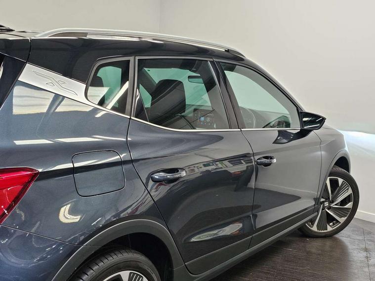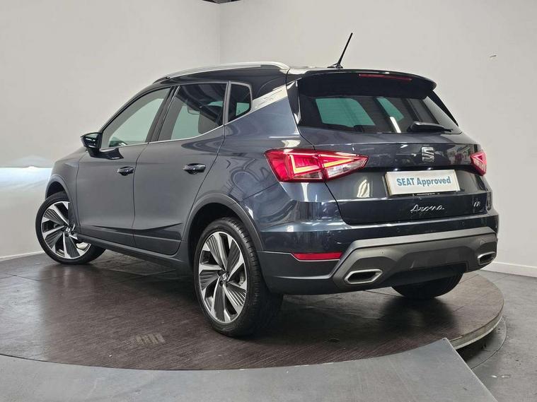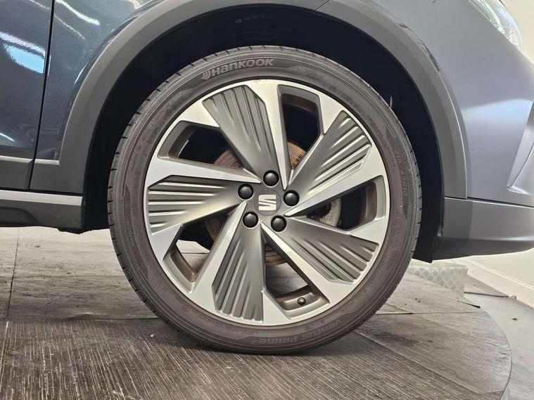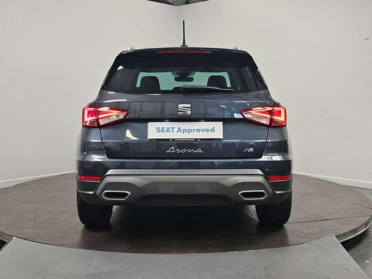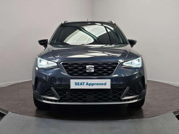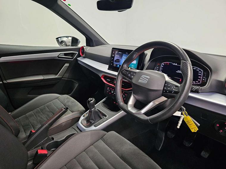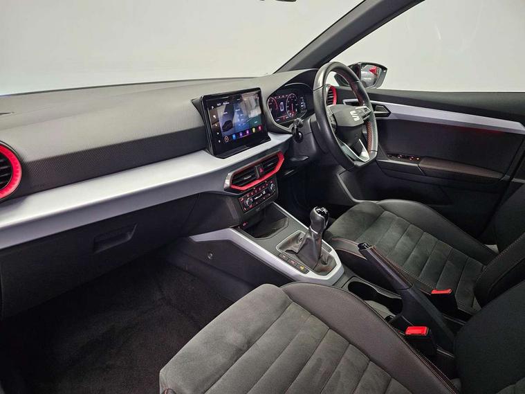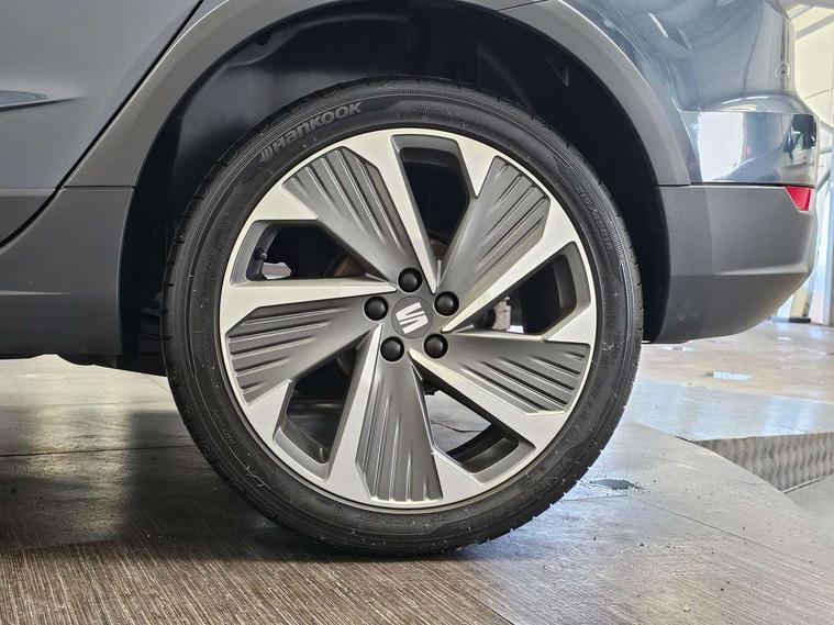 'Lights On' Reminder warning buzzer, 10" Digital cockpit, Digital clock, E-call, Electric speed sensitive power steering, Full Link Smartphone Integration with Mirror Link, Apple Car Play, Google Android Auto with USB Type C cable for Apple and Android compatibility, Low fuel warning light, Outside temperature display, Rear parking sensor, RPM counter, Seat connect with safety, service, remote and online, SEAT Drive profile - Four different models normal-sport-eco-individual, steering response, throttle response, Trip computer, Wireless phone charger, 9.2" colour touchscreen with navigation system, voice control and USB port (type c), Bluetooth interface for hands free and audio streaming, DAB digital radio and AM/FM radio, Steering wheel mounted audio controls, Anti theft roof antenna, Auto dimming interior rear view mirror, Automatic activation of hazard warning lights, Body coloured bumpers, Body coloured door handle inserts, Chrome roof rails and window surrounds, Dark tinted rear windows, Electric front/rear windows, Electrically adjustable, heated and folding door mirrors, Front fog lights with cornering function and rear fog light, FULL LED automatic headlights with dynamic headlight range control, coming and leaving home, LED daytime running lights, LED rear tail lights and licence plate lights, Protective side mouldings, Rain sensing wipers, Rear side wing doors, Rear spoiler, Rear window wash/wipe, Roof colour door mirrors, Third brake light, Twin exhaust pipe styling hidden exhaust pipe, Visible VIN plate, Windshield wiper with intermittent control and potentiometer, 2 cupholders, 3 seat bench in 2nd row, 60/40 split folding rear seat, Aircare filter, Black interior roof, Double boot floor, Driver sunvisor with covered mirror + card holder, Dual zone climate control, Front comfort seats, Front courtesy light with front reading lights, Front seat back storage pockets, Gear shift indicator, Heated front seats, Height adjustable front seats, Height/reach adjustable steering column, Illuminated boot, Instrument lighting with brightness control, Interior ambient lighting, Interior light in footwell, central console and door panel, ISOFIX points in outer rear seats with top tether anchorage points, Microsuede cloth upholstery, Passenger sunvisor with vanity mirror, Perforated flat bottomed leather steering wheel/gear knob/handbrake with red stitching and FR logo, Single front passenger seat, Two front and three rear height adjustable headrests, Interior chrome pack - Arona, 3 point seatbelts on all rear seats, ABS, Active front headrests, Child locks on rear doors, Driver and front passenger airbags with front passenger airbag de activation, front side and curtain airbags, Electronic stability control, Emergency Brake Assist (EBA) and front assist, Front and rear seatbelt reminder, Hill hold control, Multi-Collision braking, Tiredness recognition system, Traction control, Tyre pressure monitoring system, Alarm with back-up horn, Electronic engine immobiliser, Locking wheel bolts, Remote central locking + deadlocks, Tow away protection, Titan black dashboard, 18" Performance Cosmo grey matt alloy wheels,