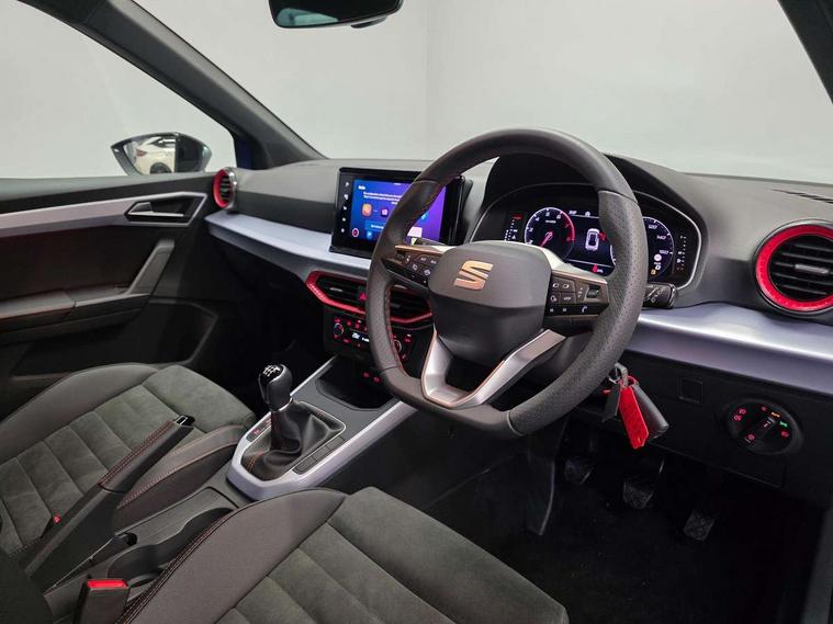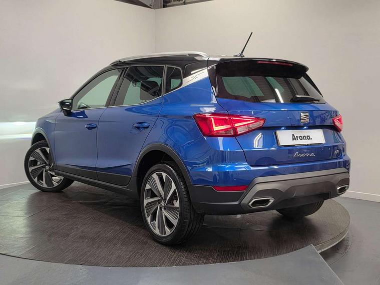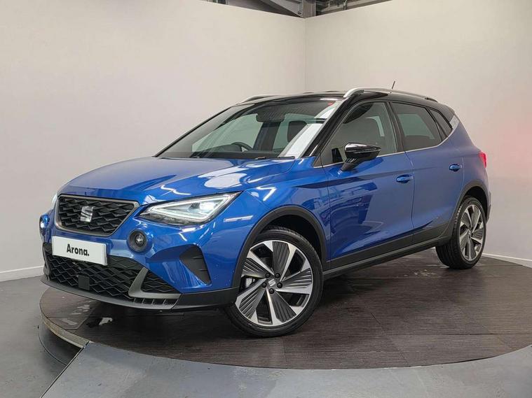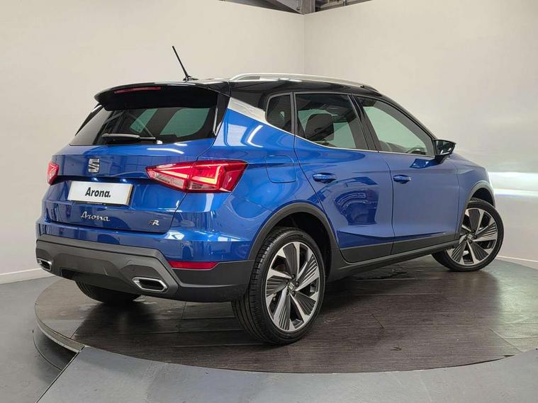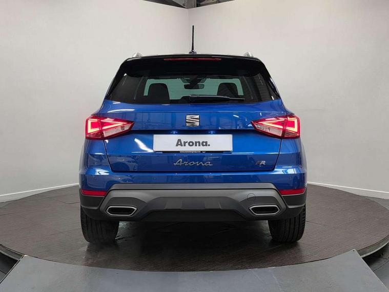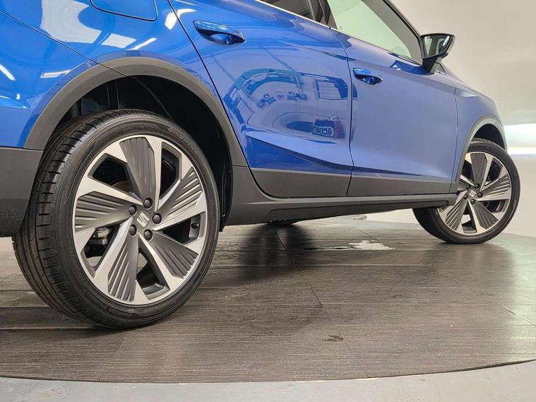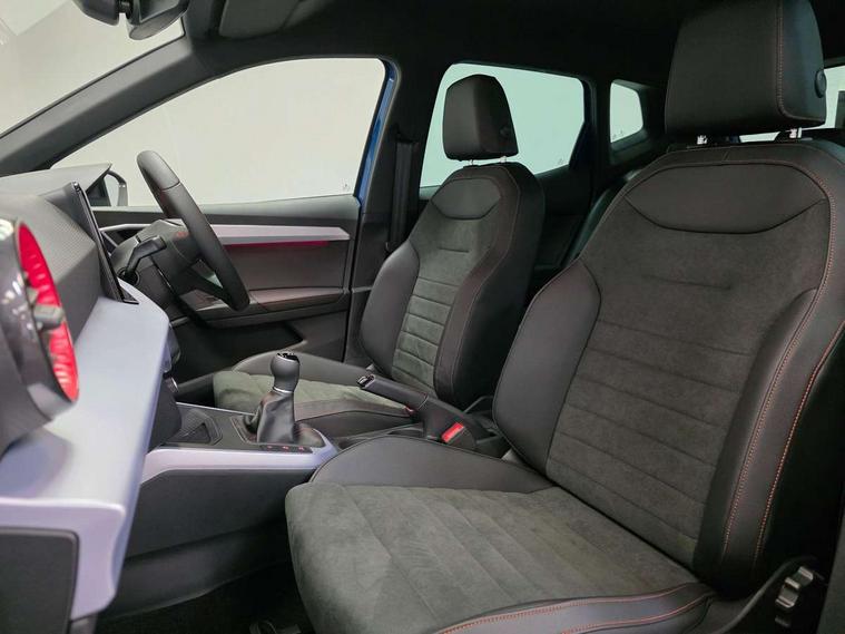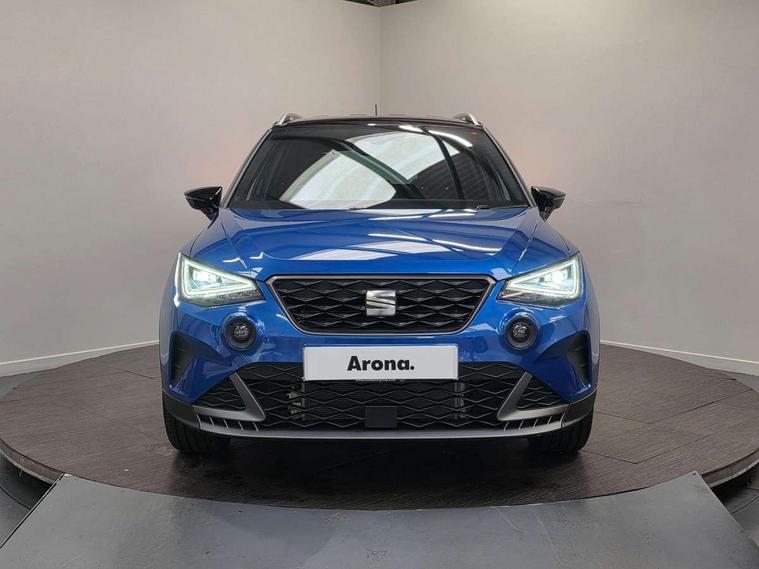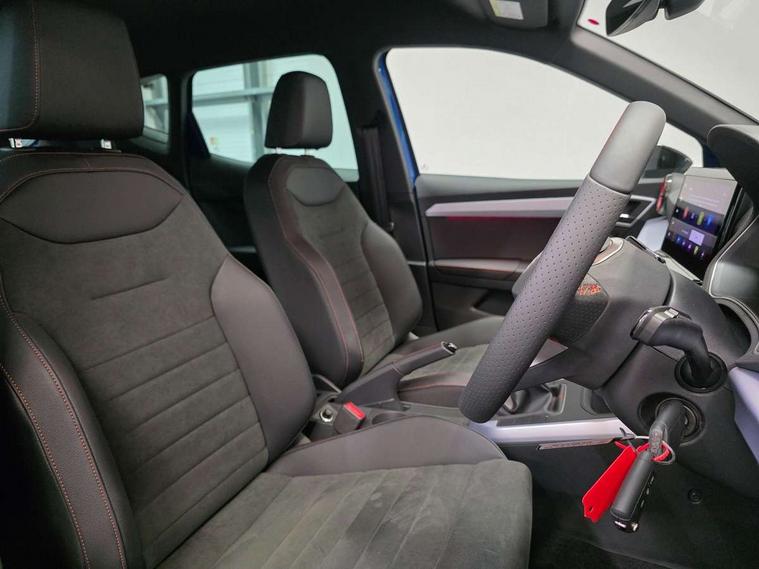 'Lights On' Reminder warning buzzer, 10" Digital cockpit, Digital clock, E-call, Electric speed sensitive power steering, Full link smartphone integration with mirror link, wireless apple carplay, Google android auto + USB Type C cable for apple and android devices, Lane keeping system, Low fuel warning light, Outside temperature display, RPM counter, SEAT Drive profile - Four different models normal-sport-eco-individual, steering response, throttle response, Trip computer, Wireless phone charger, 6 speakers, 9.2" colour touchscreen with navigation system, voice control and USB port (type c), Bluetooth interface for hands free and audio streaming, DAB digital radio and AM/FM radio, Steering wheel mounted audio controls, Anti theft roof antenna, Auto dimming interior rear view mirror, Automatic activation of hazard warning lights, Body coloured bumpers, Body coloured door handle inserts, Chrome roof rails and window surrounds, Dark tinted rear windows, Electric front/rear windows, Electrically adjustable, heated and folding door mirrors, Front fog lights with cornering function and rear fog light, FULL LED automatic headlights with dynamic headlight range control, coming and leaving home, LED daytime running lights, LED rear tail lights and licence plate lights, Protective side mouldings, Rain sensing wipers, Rear side wing doors, Rear spoiler, Rear window wash/wipe, Roof colour door mirrors, Third brake light, Twin exhaust pipe styling hidden exhaust pipe, Visible VIN plate, 2 cupholders, 3 seat bench in 2nd row, 60/40 split folding rear seat, Aircare filter, Black interior roof, Double boot floor, Driver sunvisor with covered mirror + card holder, Dual zone climate control, Front comfort seats, Front courtesy light with front reading lights, Front seat back storage pockets, Gear shift indicator, Heated front seats, Height adjustable front seats, Height/reach adjustable steering column, Illuminated air vent surrounds, Illuminated boot, Instrument lighting with brightness control, Interior ambient lighting, Interior light in footwell, central console and door panel, ISOFIX points in outer rear seats with top tether anchorage points, Microsuede cloth upholstery, Passenger sunvisor with vanity mirror, Perforated flat bottomed leather steering wheel/gear knob/handbrake with red stitching and FR logo, Potentiometer, Single front passenger seat, Two front and three rear height adjustable headrests, Interior chrome pack - Arona, Safe and driving pack (S) - Arona, 3 point seatbelts on all rear seats, ABS, Active front headrests, Child locks on rear doors, Driver and front passenger airbags with front passenger airbag de activation, front side and curtain airbags, Emergency Brake Assist (EBA) and front assist, Front and rear seatbelt reminder, Hill hold control, Multi-Collision braking, Tiredness recognition system, Traction control, Tyre pressure monitoring system, Alarm with back up horn with tow away protection, Deadlock, Electronic engine immobiliser, Locking wheel bolts, Remote central locking, Titan black dashboard, 18" Performance Cosmo grey matt alloy wheels,