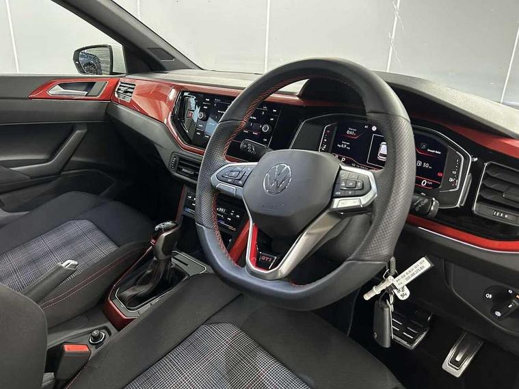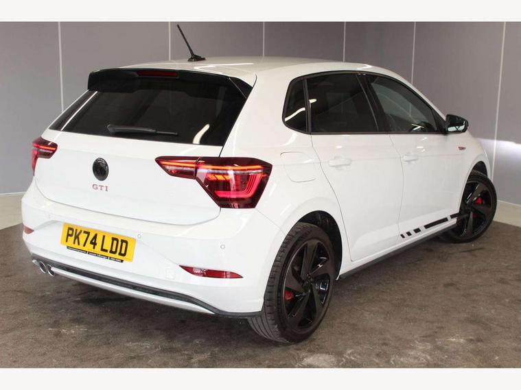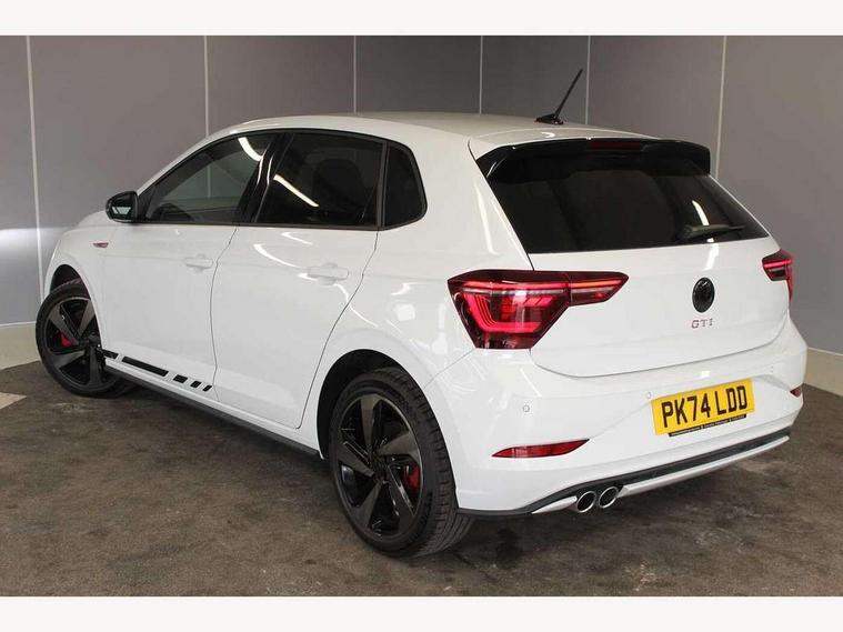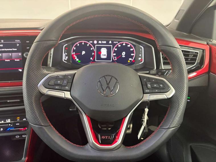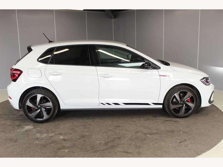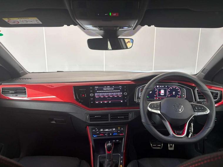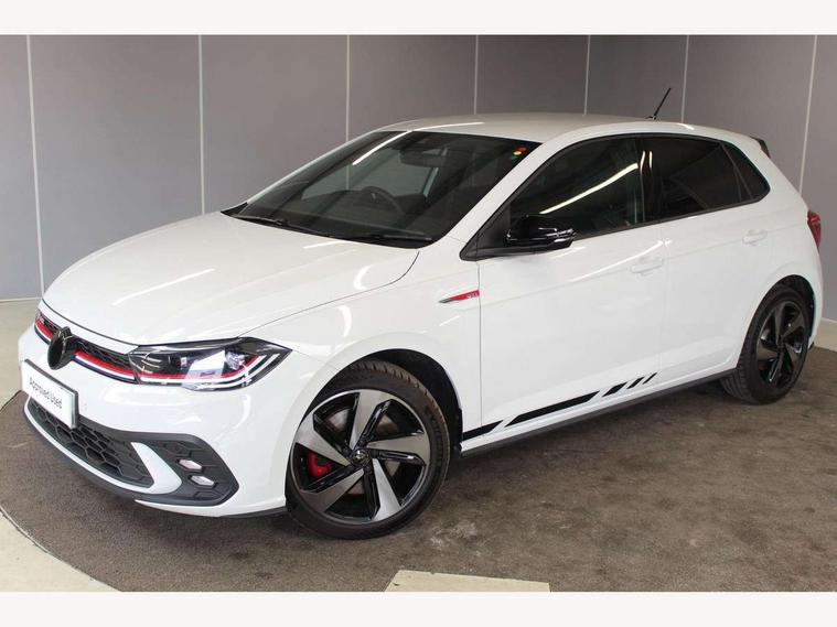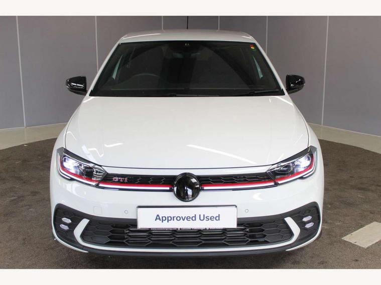 Adaptive cruise control with follow-to-stop and speed limiter, Advanced driver attention and drowsiness monitor, Bluetooth mobile phone interface, Digital Cockpit Pro with 10.25" Display, Dynamic road sign display, Eco mode, Emergency call service, Multifunction camera, Power assisted speed sensitive steering, Preparation for We connect and We connect plus, Speedo and rev counter, electronic odometer, trip, service interval display and fuel gauge, Travel Assist - Lane keeping system and traffic jam assist, Travel assist including emergency assist, Trip computer, Warning signal and warning light for front and rear seatbelts not fastened, Washer fluid level indicator, Wireless app connect, Adaptive chassis control, Front wheel drive, Heavy duty rear axle, Rear shock absorpion sports version, Sports select suspension lowered by 15mm, Start-stop system with battery regeneration (recuperation - energy recovery during braking), DAB Digital radio, Diversity antenna for FM reception, Front and rear 6 speakers, Body colour bumpers, Body colour door handles, Electric front windows, Front scuff plates in aluminium with GTI logo, Heat insulating darkened glass in side and rear windows, Heat insulating glass windscreen, Power folding adjustable/heated exterior mirrors and front passenger exterior mirror lowering function, Rain sensor, Rear electric windows, Rear fog light, Rear side wing doors, Rear windscreen washer and wiper with interval delay, Sport bumpers with air intakes with honeycomb structure, Third brake light, Twin chrome exhaust tailpipes, 12V power socket in centre console, 2 USB-C ports in the front, 2 USB-C charging sockets on the center console in the rear, 3 rear head restraints, 60/40 split folding rear seat and rear seat bench not split, Air care climatronic air conditoning system with active combination filter and 2-zone temperature control, Black roof lining, Carpet mats, front and rear, Chrome plated radiator grille inserts, air vent surrounds and light switch surrounds, Door and side trim panel, Driver and front passenger seat height adjustment, Driver/passenger sunvisors with illuminated vanity mirrors, Front centre armrest, Front footwell illumination, Front seat backrest storage pockets, GTI sports gearshift knob in aluminium leather, Handbrake lever handle in leather, Headliner in recycled material, Isofix child seat preparation easy-fit (for two outer rear seats, and front passenger seat) compatible with I-size, LED interior light with switch off delay and dimmer, 2 reading lights front and rear, Luggage compartment cover, Luggage compartment floor, Luggage compartment lighting, Single front passenger seat, Stainless steel pedals, Standard pedal cluster, Three spoke leather wrapped multifunction sports steering wheel with shifting paddles, IQ LED matrix headlights pack - Polo, Light and sight pack - Polo GTI, 3 point height adj front seatbelts + pretensioners, 3x3 point rear seatbelts, ABS, Driver and front passenger airbag with front passenger airbag deactivation, Drivers and front passengers safety optimised head restraints, ESC (Electronic stability control) + EDL (Electronic Differntial lock) and ASR (Traction control), Extended and predictive pedestrian/ cyclist protection, Front and rear disc brakes with red brake calipers, Front curtain and side airbags with center airbag, Hill hold control, Manual child lock in rear doors, Two tone horn, Tyre pressure loss indicator, Alarm with interior protection, Anti-theft alarm system with interior monitoring, backup horn, and towing protection, Anti-theft wheel bolts, Electronic engine immobiliser, Chrome applications on rotary light, mirror adjustment, window regulator switches, outlet with frame in black, Low rolling resistance tyres,