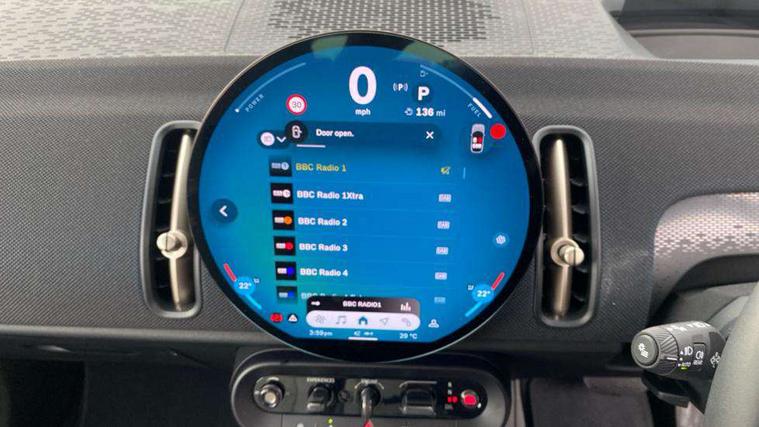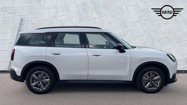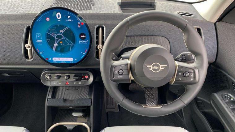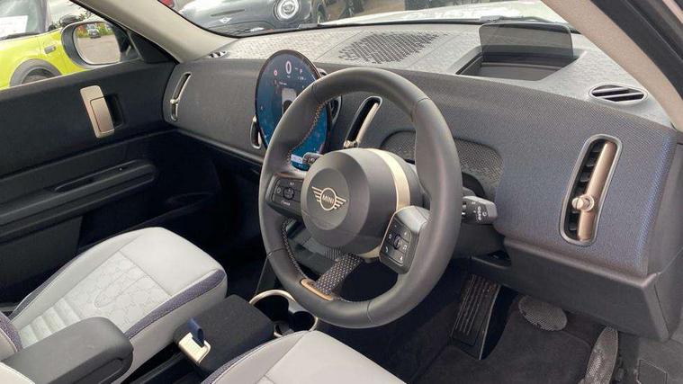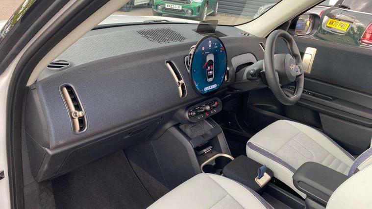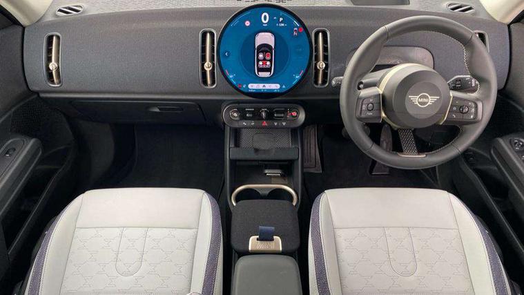 Bluetooth connection, Circular OLED Screen, Compatible mobile phone bluetooth with audio streaming, Cruise Control (DCC), Digital dashboard display, Driving Assistant Plus Preparation, E-call, Electro-mechanical speed dependant steering assistance, MINI Experience Modes, MINI Head up display, Mini navigation system, MINI TeleServices, Parking assistant in camera and ultrasound based assistance system, rear view camera, parking aid and distance control, Auto transmission with Paddles, Larger capacity fuel tank, 6 speakers, DAB Digital radio, Auto tailgate, Electric adjustable heated door mirrors, Front and rear electric windows, Heated rear window, High beam assistant, Interior rear-view mirror with automatic anti-dazzle function, LED daytime running lights, LED headlights with extended contents including Adaptable light signatures, LED rear lights, LED third brake light, Rain sensor with auto headlights, Rear side wing doors, Rear window wiper, Roof rails, 3 Seat sliding rear bench in 2nd row, 60/40 split rear bench seat, Auto air conditioning, Driver and front passenger seat heating, Floor mats, Front armrest, Front headrests, Heated steering wheel, Height and length steering column adjustment, Light headliner, Luggage compartment separating net, Rear headrests, Seat adjustment for rear seats, Single front passenger seat, Sport Vescin Steering Wheel, Sunvisors with vanity mirrors, Vescin/Cloth upholstery, Wireless charging tray, Interior and exterior mirror package - Mini Countryman, 3x3 point rear seat belts, 6 Airbags - front, side, head and seat belt tensioners, ABS, DSC - Dynamic Stability Control, Electronic handbrake, Electronic Stability Programme (ESP), Front ISOFIX (iSize), Hill hold assist, Hill start assist, Manual rear child locks, Traction control, Tyre pressure monitoring system, Warning triangle, Alarm system with tilt sensor, monitoring doors, bonnet interior and tailgate, Auto drive away locking, Comfort access system, Deadlocking function, Electronic vehicle immobiliser, Locking wheel bolts, Remote control locking, Start/stop toggle with keyless go, Black/Blue dashboard knit, MINI Mobility Kit,
