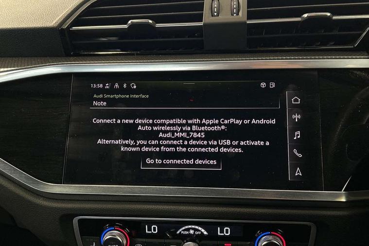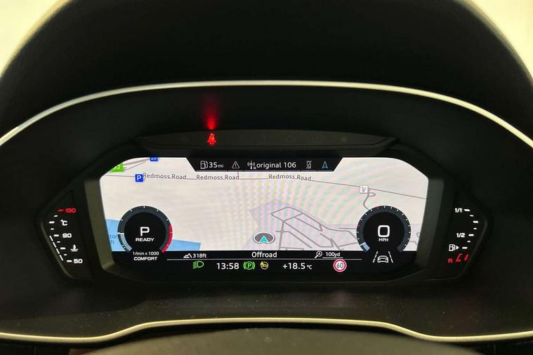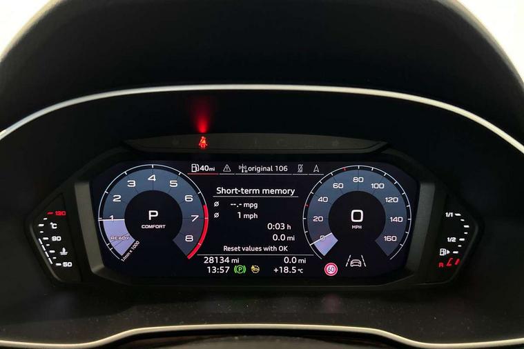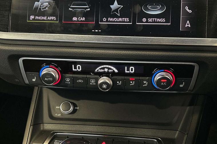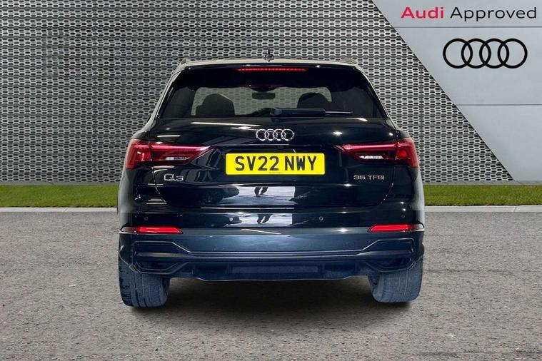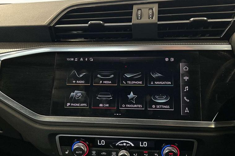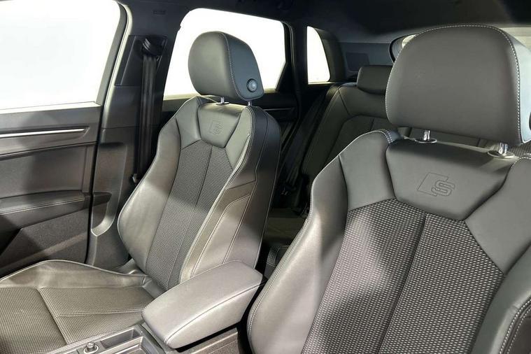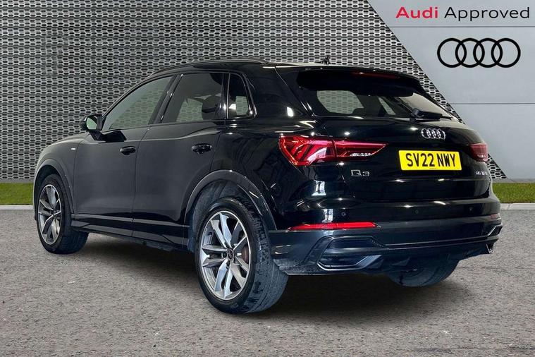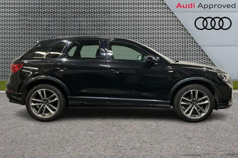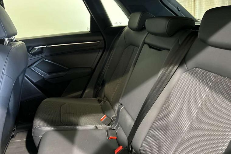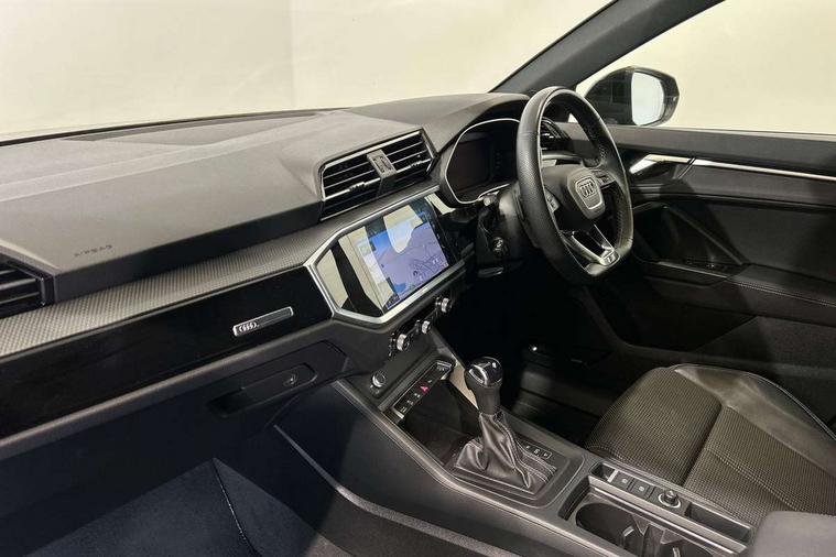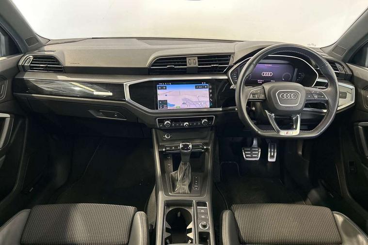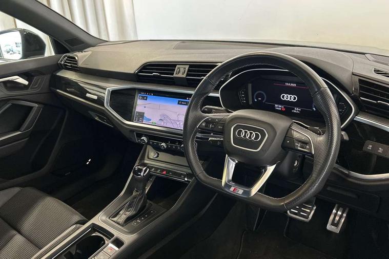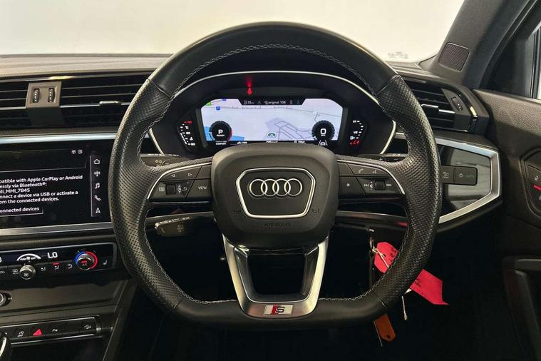 Amazon alexa Integration, Audi connect safety and service (e-call), Audi drive select, Audi lane departure warning, Audi smartphone interface includes wireless Apple carplay/Android Auto, Audi Virtual Cockpit - 10.25" display, Bluetooth interface, Camera based traffic sign recognition, MMI Navigation Plus with high resolution 10.1 inch touchscreen colour display, Power operated tailgate, Progressive steering, Service interval indicator, Start stop system with recuperation, Voice control system with natural language interaction, 48V Mild hybrid technology, Sports suspension, 2 USB-C ports with charge and data functions, 6 passive loudspeakers, DAB digital radio module, Acoustic windscreen, Auto dimming frameless rear view mirror, Black roof rails, Electrically folding, adjustable and heated door mirrors with integrated LED side indicators and kerb view function for passenger side, Front and rear electric windows, Front fog lights, Grille vertical bars in aluminium silver/Matt, High gloss black finish B and C pillars, LED headlights with LED daytime running lights, LED rear lights, LED third brake light, Privacy glass dark tinted rear and rear-side windows (from B-pillar backwards), Rain and light sensors, Rear diffuser strip in matt titanium black, Rear side wing doors, Rear wiper, S line bumpers in contrasting Manhattan grey, Tinted rear windows, Variable front intermittent wipers, 12V socket in rear centre console, 3 seat bench in 2nd row, 40:20:40 folding with manual adjustment for 60:40 forwards/backwards position and backrest angle, Adjustable rear seat bench/backrest with centre armrest and cupholder, Black cloth headlining, Dual zone electronic climate control, Front and rear black floor mats with contrast stitching in rock grey, Front and rear headrests, Front and rear roof module including reading lights, Front centre armrest, Glove compartment lighting, Height and reach adjustable steering wheel, Illuminated door sill trims with S logo, ISOFIX child seat mounting for front passenger with airbag deactivation and outer rear seat including top tether attachment point for outer rear seats, Luggage compartment light, Manual front seats with height adjustment, Perforated leather gearknob, Single front passenger seat, Stainless steel luggage compartment sill finisher, Stainless steel pedals, Black styling pack - Q3, Non smoking pack - Q3, 3x3 point rear seatbelts, 6 airbags - Driver, front passenger, curtain and side windows, Audi pre-sense front with pedestrain and cyclist recognition, Electrically operated child locks on rear doors, Electromechanical parking brake, Electronic stabilisation control including ABS, ASR and EDL, Front seatbelt reminder, Hill descent control, Hill hold assist, Pre sense basic, Seatbelt monitoring, Tyre pressure warning, Warning triangle and first aid kit, Anti theft alarm, Anti theft wheel bolts, Immobiliser, Remote central locking, Detail dashboard around MMI touch colour display in glass look, black with surround in aluminium look, Leatherette door armrest, Piano black inlay, Tool kit, Tyre repair kit,