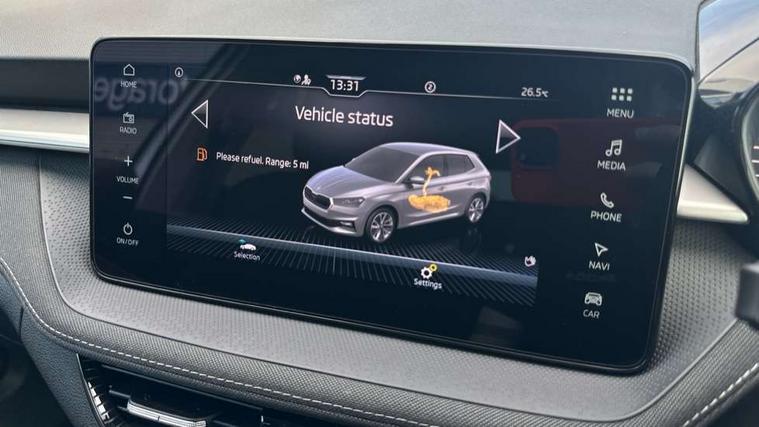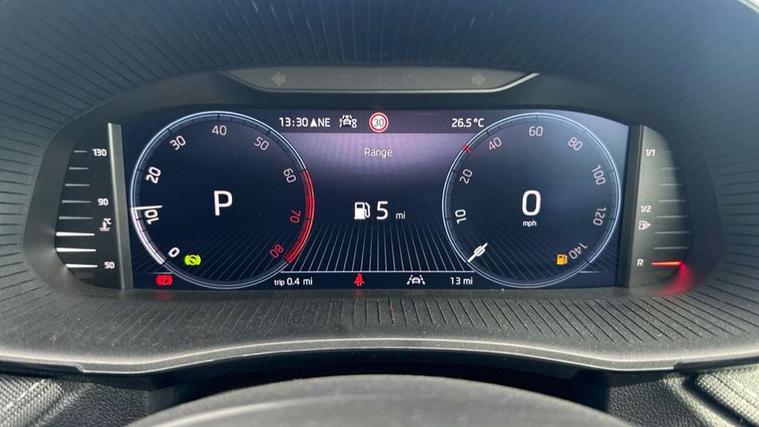 Advanced driver attention and drowsiness monitor, Bluetooth connection, Electromechanical power steering, Exterior temperature gauge, Service interval indicator, Traffic sign recognition, Virtual cockpit with 10.25" colour display, Wireless SmartLink for Apple CarPlay and Android Auto, 6 Speakers (4 in front and 2 in rear), 9.2" colour display skoda navigation system with voice control and web radio, Auxiliary socket for external MP3 player, DAB digital radio reception, Auto dimming rear view mirror, Body colour door mirrors, Body coloured bumpers, Chrome window surround, Door mirror integrated indicators, Front and rear electric windows, Front window wiper intermittent control, Headlight range control - Automatic, Ice scraper in fuel cap, LED daytime running lights with coming and leaving home feature, LED rear lights, Privacy glass, Rear LED fog light, Rear side wing doors, Rear window wiper with washing nozzles, Roof mounted spoiler, SKODA tailgate lettering in chrome, Third brake light, Unique dark chrome design logo on alloy wheels, 2 LED reading lights in front and rear, 3 rear headrests, Backrest split and folding, Central console with removable cup holder and storage box, Chrome handbrake release button, Comfort seats, Door sills with fabia badging, Dual zone air conditioning with climatronic electronic control, Fabric upholstery, Front centre armrest, Gearshift knob/handle in leather, Hand brake lever handle in leather, Height adjustable front headrests, Height adjustable front seats, Height adjustable steering wheel, ISOFIX and TopTether anchorage points to the outer rear seats, ISOFIX and TopTether on the front passenger seat, Luggage compartment lighting, Manually adjustable lumbar support in front seats, Metallic grey interior door handles, Pollen filter, Rear seat bench unsplit, Single front passenger seat, Skoda lettering on steering wheel, Storm grey headlining, Sun visors with mirror and airbag label on passenger side, Textile floor mats, Ticket holder, Umbrella in drivers door, 3-point height adjustable front seats belts with pretensioner and force limiter, Automatic warning lights in case of crash, Driver and passengers airbag with switch off function, e-Call+, ESC including ABS, MSR, ASR, EDS, HBA and XDS, Front and rear seat belt warning, FRONT ASSIST (AEB City and AEB Inter Urban), Front side airbags, Head airbags, Hill hold control, One tone horn, Pedestrian protection, Three rear 3-points safety seat belts with pretensioner and force limiter including stop function for outer rear seat belts, Tyre pressure monitoring system, Anti-theft alarm system including immobiliser, interior monitoring, backup horn, and towing protection, Central locking with radio remote control, interior controls, SAFE function and 2 foldable keys, Black painted air vents, Metallic grey central console cover, Metallic grey upper decorative trim, Satin black door and side trim panel in front, Textile microsuede grey lower decorative trim with art grey stitching, Anti-theft wheel bolts protection, Super-low rolling resistance tyres,