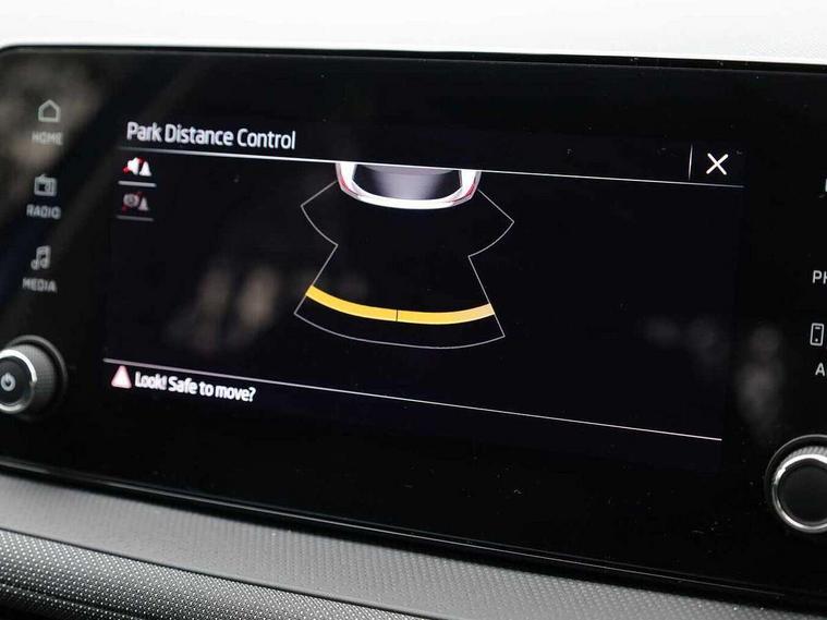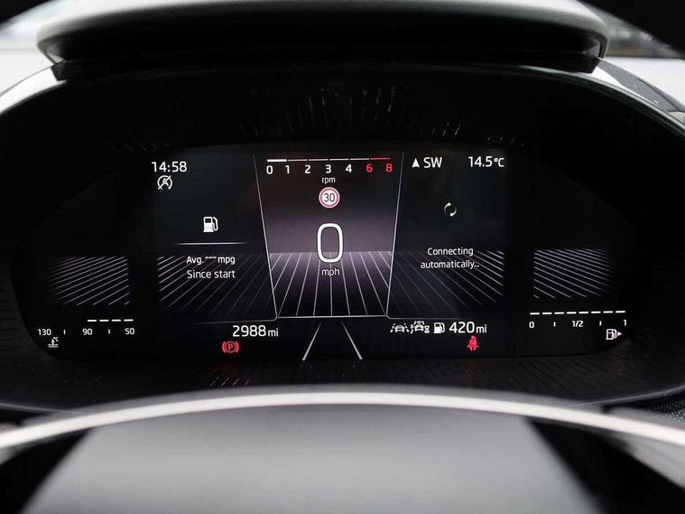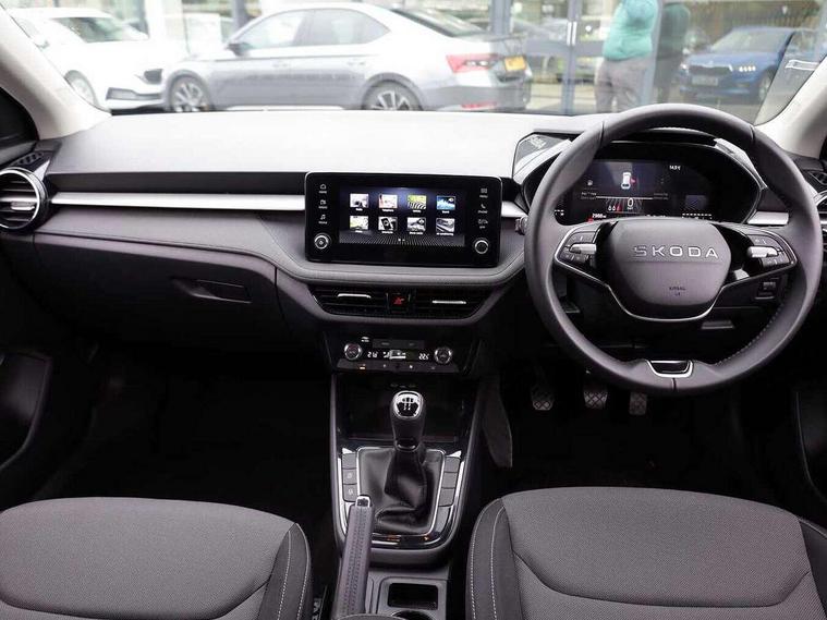 8" Digital instrument display, Advanced driver attention and drowsiness monitor, Bluetooth connection, Electromechanical power steering, Exterior temperature gauge, Rear parking sensors, Service interval indicator, Traffic sign recognition, Wireless SmartLink for Apple CarPlay and Android Auto, 6 Speakers (4 in front and 2 in rear), 8.25" Skoda infotainment touchscreen display, Auxiliary socket for external MP3 player, DAB digital radio reception, Auto dimming rear view mirror, Body colour door mirrors, Body coloured bumpers, Door mirror integrated indicators, Front and rear electric windows, Front window wiper intermittent control, Headlight range control - Automatic, Ice scraper in fuel cap, LED daytime running lights with coming and leaving home feature, LED rear lights, Rear LED fog light, Rear side wing doors, Rear window wiper with washing nozzles, Roof mounted spoiler, SKODA tailgate lettering in chrome, Third brake light, Unique dark chrome design logo on alloy wheels, 2 reading lights in front and 2 reading lights in rear, 3 rear headrests, Backrest split and folding, Central console with removable cup holder and storage box, Chrome handbrake release button, Dual zone air conditioning with climatronic electronic control, Fabric upholstery, Front centre armrest, Gearshift knob/handle in leather, Grain satin black interior door handles, Hand brake lever handle in leather, Height adjustable front headrests, Height adjustable front seats, Height adjustable steering wheel, ISOFIX and TopTether anchorage points to the outer rear seats, ISOFIX and TopTether on the front passenger seat, Luggage compartment lighting, Manually adjustable lumbar support in front seats, Pollen filter, Rear seat bench unsplit, Single front passenger seat, Skoda lettering on steering wheel, Storm grey headlining, Sun visors with mirror and airbag label on passenger side, Textile floor mats, Ticket holder, Umbrella in drivers door, 3-point height adjustable front seats belts with pretensioner and force limiter, Automatic warning lights in case of crash, Driver and passengers airbag with switch off function, e-Call+, ESC including ABS, MSR, ASR, EDS, HBA and XDS, Front and rear seat belt warning, FRONT ASSIST (AEB City and AEB Inter Urban), Front side airbags, Head airbags, One tone horn, Pedestrian protection, Three rear 3-points safety seat belts with pretensioner and force limiter including stop function for outer rear seat belts, Tyre pressure monitoring system, Anti-theft alarm system including immobiliser, interior monitoring, backup horn, and towing protection, Central locking with radio remote control, interior controls, SAFE function and 2 foldable keys, KESSY - Keyless engine start/stop, Black painted air vents, Grain satin black central console cover, Metallic grey upper decorative trim, Satin black door and side trim panel in front, Textile Kota grey lower decorative inserts, Anti-theft wheel bolts protection, Super-low rolling resistance tyres,