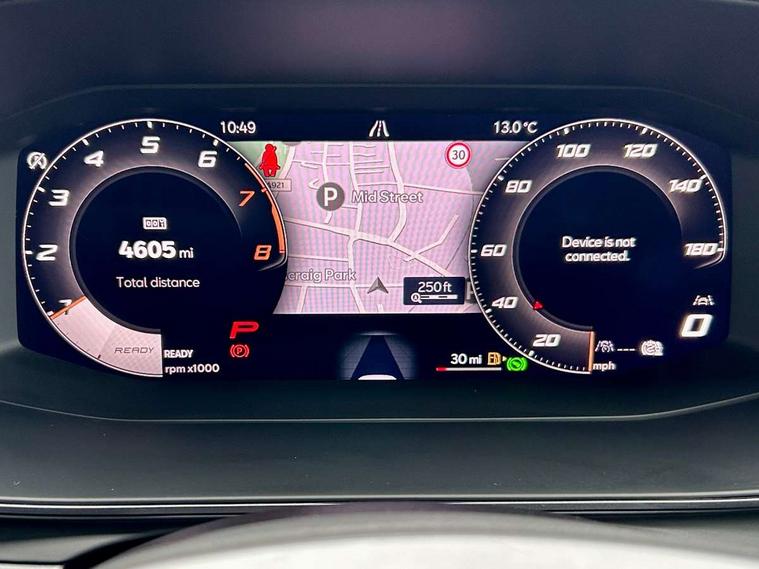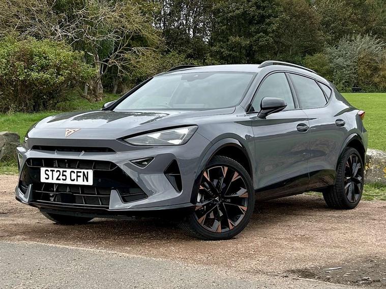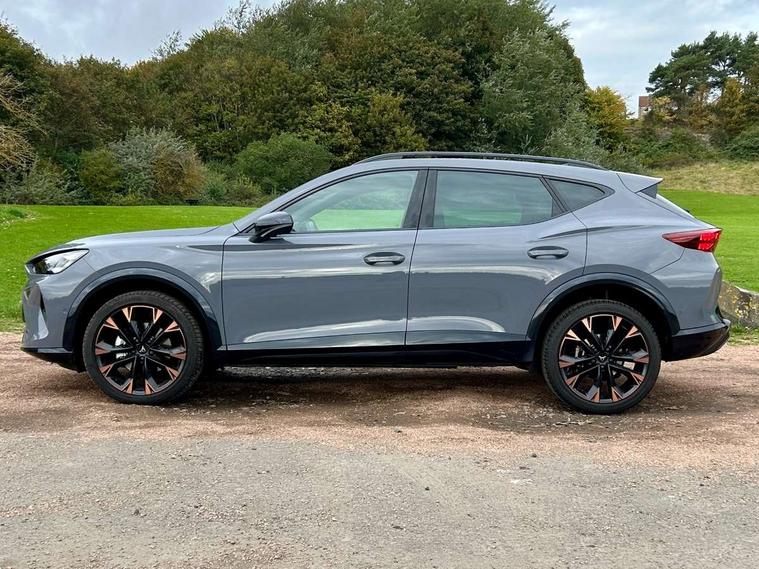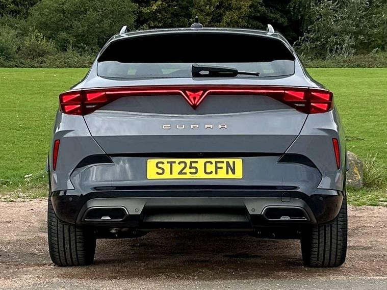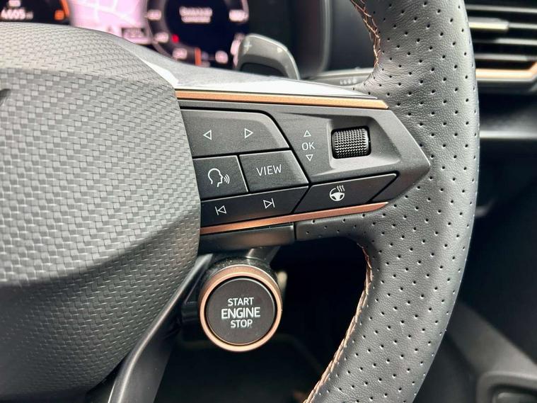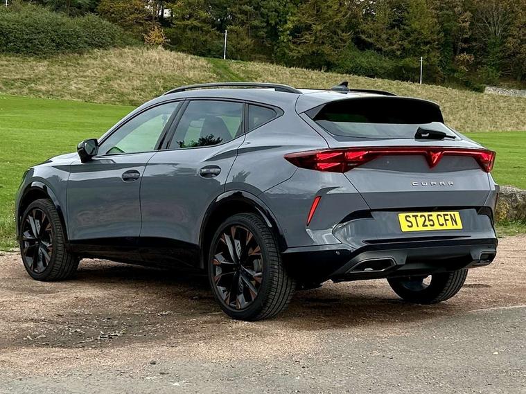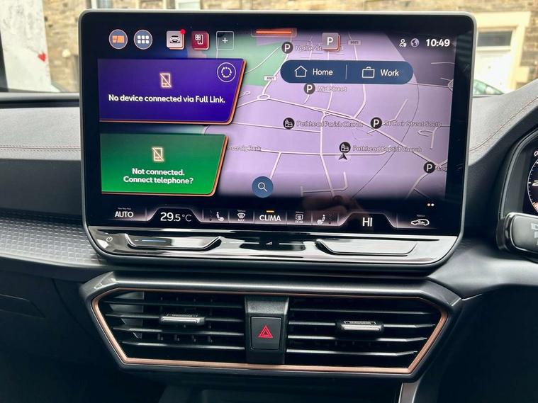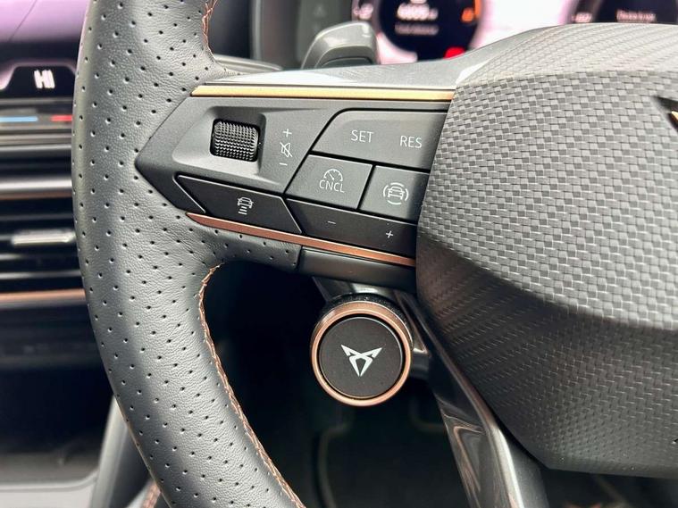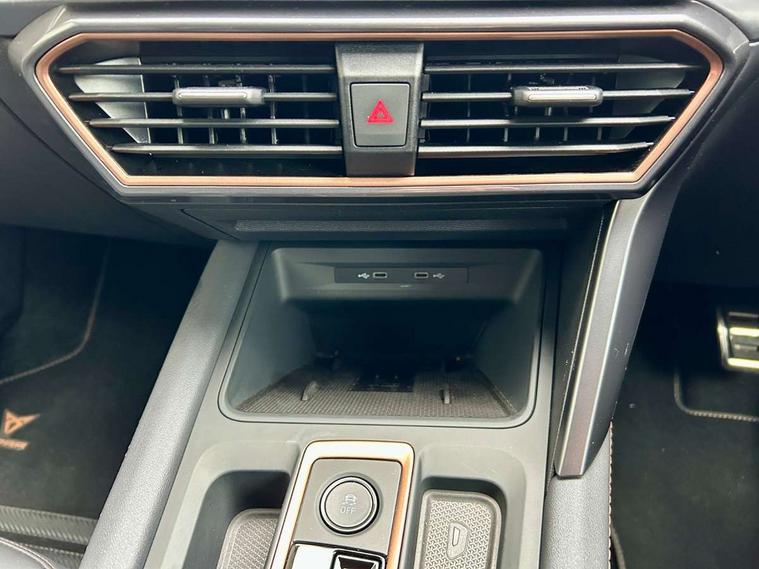 10.25" digital cockpit and configurable dashboard, Adaptive cruise control with follow-to-stop and speed limiter, Advanced driver alert system, Advanced lane assist with semi-automatic vehicle control in a medical emergency and traffic jam assist, Driving profile selection, Dynamic road sign display, Emergency steering support with turn assist, Forward collision warning with automatic braking, Full link phone integration, Intelligent park assist, Progressive steering, RPM, trip computer, outside temp gauge, instrument light brightness, low fuel warning light, lights on reminder, gearshift indicator, Service interval indicator, Side and exit assist, Start/stop system with regenerative braking, Top view camera, Virtual pedal and electric tailgate, Voice control system, Wired Android Auto, Wireless apple carplay, Wireless phone charger, CUPRA sport suspension, Electronic locking differential and dynamic traction support, 2 front and 2 rear USB type C sockets, Media system with navigation, 12.9" touchscreen display, voice control, DAB, steering wheel mounted controls, Auto dimming rear view mirror, Body colour door handles, Body coloured bumpers, Dark grey wing mirror, Daytime running light with automatic headlight control and coming home feature, Door panel ambient lighting, Dynamic headlight range control, Electric front/rear windows, Electrically adjustable heated and folding door mirrors with memory function, Gloss black roof rails and window surrounds, High beam assist, LED 3rd brake light, LED front fog lamps with cornering function, LED Headlights, LED Taillights with dynamic indicator, Rain sensing wipers, Rear diffuser with black simulated exhaust pipes, Rear fog lights, Rear side wing doors, Rear wash/wipe, Tinted rear windows, Welcome lights (within exterior mirror housing), 12V socket, 2 front and 2 rear reading lights, 3 seat bench in 2nd row, 60/40 split rear bench seat with armrest and mechanical seat release, Black headlining, Black interior roof lining, Cupra sports pedals, Dust/pollen filter, Electrically adjustable front seats with lumbar support and memory function, Front and rear head restraints, Front centre armrest, Heated front seats, Heated supersports multifunction leather steering wheel with satellite buttons and gear shift paddles, Height/reach adjust steering wheel, Illuminated aluminium doorsteps, Illuminated interior front door sills, Illuminated sunvisor with mirror, Isofix, Leather dashboard, door insert and side trim panel, LED smart wraparound lighting, PVC/Leather upholstery, Satellite steering wheel, Single front passenger seat, Storage pockets on rear of front seats, Three zone climate control with control panel in rear, Variable luggage/load compartment floor, 3 point seatbelts on all rear seats, ABS, Brake control system - ESC and brake booster, Child proof door locks, Driver and front passenger airbags with front passenger airbag de-activation, Electronic parking brake, Front and rear disc brakes, Front side curtain airbags, Hill hold control, Pre-crash front and rear seat belt tensioner, window closure and hazard lights, Public e-call, Seat belt reminder for front and rear seats, Tyre pressure monitoring system, Anti theft alarm system, KESSY Advanced - Keyless start, keyless entry with SAFELOCK, Locking wheel bolts, Copper and aluminium interior detailing,