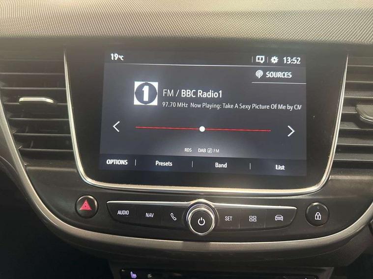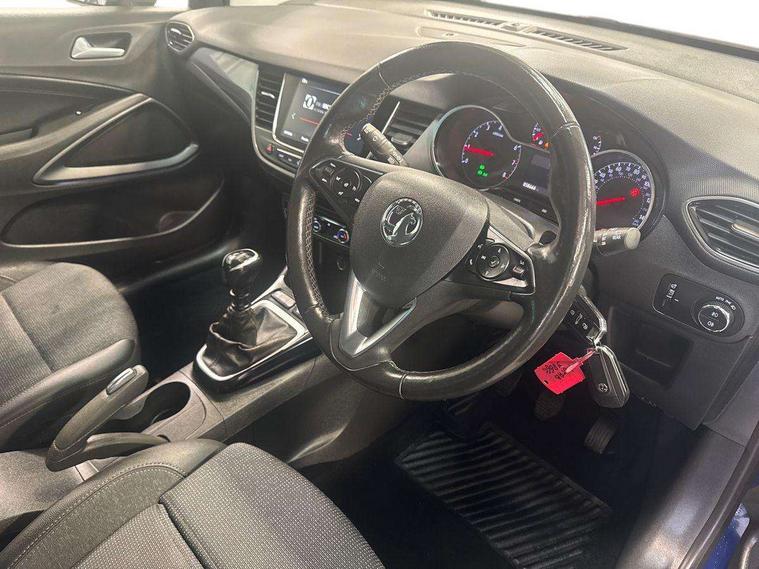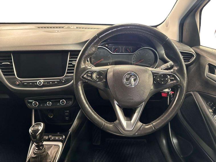 3.5" monochrome instrument colour display, Audible lights on warning, Bluetooth connectivity, Cruise control + speed limiter, Digital clock with automatic RDS time adjustment, Driver drowsiness alert system, E-call, Forward collision warning, Instrumentation - Speedometer, rev counter, low fuel gauge warning light + water temperature gauge warning light, shift up/down indicate light, Lane departure warning system, Multi function trip computer, Multimedia sat nav pro with 8" colour touchscreen, AM/FM, Bluetooth streaming, Bluetooth mobile phone portal, apple CarPlay/Android Auto + 6 speakers, Outside temperature display with ice warning, Refridgerant low indicator, Service interval indicator, Speed sensitive power steering, Speed sign recognition, Vauxhall connect, Front wheel drive, 2 x USB connections, DAB Digital radio, Steering wheel mounted audio/phone/cruise controls, 2 speed wipers/wash wipe/intermittent wipe, Alloy effect front and rear skid plates, Automatic anti dazzle rear view mirror, Automatic headlamp levelling system, Automatic high beam control with cornering light, Automatic lighting control, Black door mirror housings, Black radiator grille with chrome bar, Black roof, Body colour door handles, Body colour front and rear bumpers, Chrome effect upper window moulding, Dark tinted rear side windows + tailgate window, Electrically adjustable and heated door mirrors, Front power windows with express up/down and anti-pinch function, Hazard warning lights, Headlamps for left side traffic, Heated rear window, Integrated tailgate spoiler, Intermittent rear wash/wipe, LED daytime running lights, LED front fog lights, LED Headlights, LED side repeat indicators, LED tail lights, Rain sensitive windscreen wipers, Rear fog lights, Rear power windows with express up/down and anti-pinch function, Rear side wing doors, Rear wing door, Reversing light, Side window demist vents, Solar heat absorbing windscreen and windows, Third brake light, Welcome lighting, Windscreen demist vents, 12v power outlet - front, 2 way adjustable front passenger seat, 2 way front passive headrests, 3 rear seats, 3 spoke flat bottomed leather covered steering wheel with bezel decoration, 4 way electrically adjustable lumbar support for drivers seat, 60/40 split folding rear seat backrest, Adjustable rear seat backrest, Air recirculation facility, Ambient lighting, Anti submarining ramps in front seats, Cabin particulate filter - removes dust, airborne particles and pollen, Centre console, Driver and front passenger illuminated vanity mirrors with flip up covers, Driver's seat armrest, Drivers ergonomic active seat with 8 way manual adjustable driver seat , height, reach and backrest, Dual zone electronic climate control, Fade up/fade down on interior lighting, Four adjustable facia vents, Front door pockets with bottle holders, Front map reading lights, Fully carpeted luggage area, Glovebox with lid, Height adjustable front/rear head restraints, Illuminated load area, Interior courtesy light operated by all doors, Isofix system on outer rear seats, Jet black premium leather side bolsters, Luggage compartment cover, Multi-speed fan with Illuminated control, Open storage compartment in centre console, Passenger assist handles, Reach + rake adjustable steering column, Rear centre headrest, Rear door pockets with bottle holders, Rear floor ventilation ducts, Rear reading lights, Satin chrome effect bezel on steering wheel, Seat cushion extension, Single front passenger seat, Sparkle cloth/vinyl upholstery, Storage pockets on front seat backs, Two drinks holders in centre console, Rear view camera plus pack - Crossland, Winter pack - Crossland, 3x3 point rear seatbelts, 6 airbags - Driver and co-driver front, front side, head curtain roof airbags, front and rear row coverage airbags, ABS, Automatic emergency braking with pedestrian detection, Child locks on rear doors, CSC - Cornering stability control, Deactivate switch for side impact airbags, Deformation zones front and rear, Dual seatbelt pretensioners on front seats, EBD - Electronic brakeforce distribution, Energy absorbing steering column, Engine drag torque control, ESP + traction control, Front and rear seatbelt unfastened audible warning and warning light, Front side impact airbag, Hill start assist, Hydraulic Brake Assist (HBA), Hydraulic brake boost, Inertia reel lap and diagonal seatbelts for all seats, Passenger airbag deactivate switch, Pedestrian detection, Rear seat belt pretensioners, Reinforced passenger safety cell, Seatbelt load limiter, Side impact protection beams, Smart seatbelt reminder for front and rear seats, Tyre pressure monitoring system, 2 remote folding keys, Electronically protected audio equipment, Engine immobiliser, Locking wheel nuts, Remote central deadlocking, Remote control central locking activation switch on driver door, Remote control central locking operates on doors, tailgate and fuel filler flap, Remote security alarm system, Visible vehicle identification number, Black facia with silver trim insert, Black trim inserts on front doors, Cluster black with chrome rings, 17" five twin spoke diamond bi colour alloy wheels,